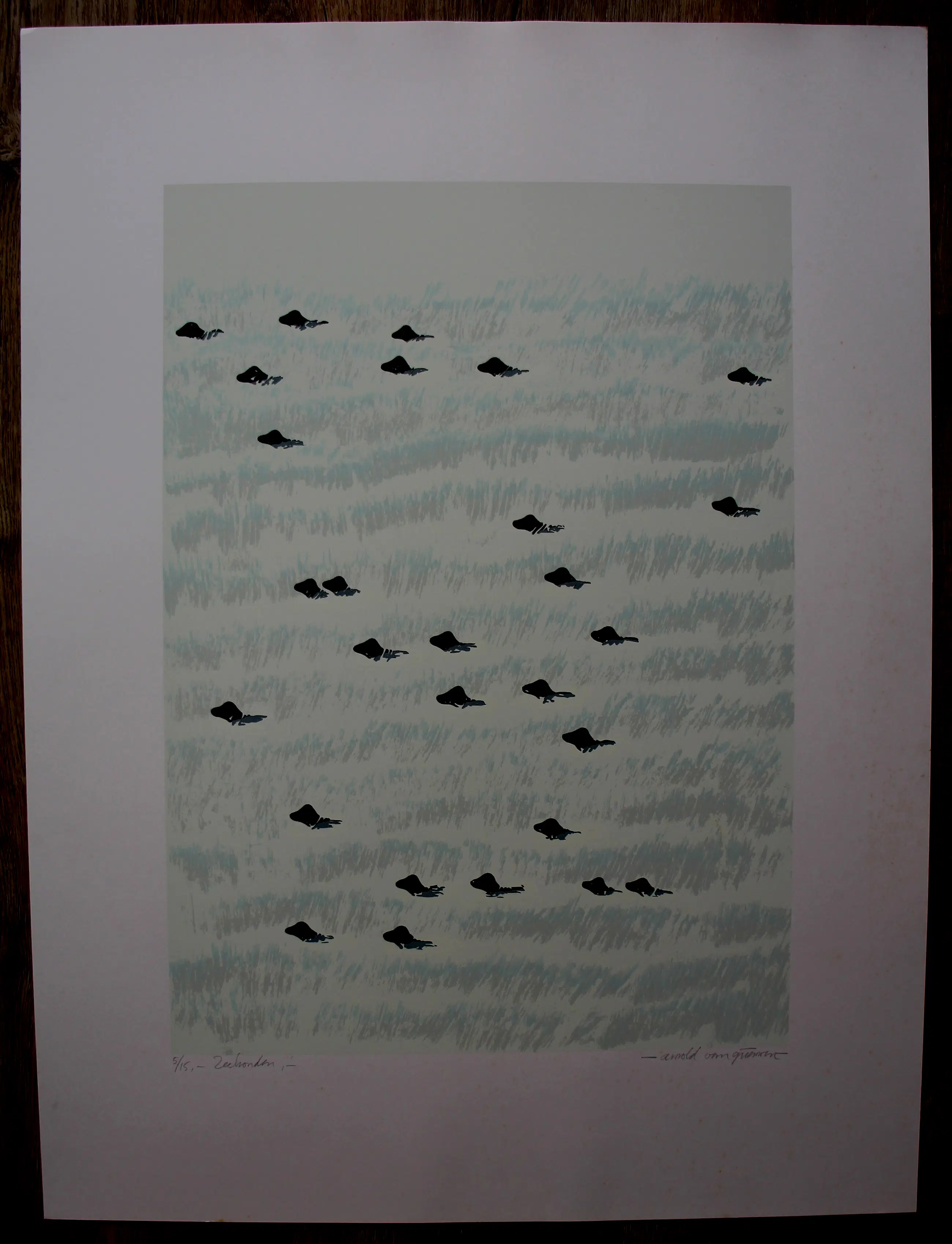 Zeefdruk van Arnold van Griensven. Titel: Zeehonden. Oplage: 5/15. Afmetingen blad: H80 x b60cm. Afmetingen voorstelling: H57 x b41cm. Het werk is rechts onder gesigneerd door de kunstenaar. De authenticiteit van het aangeboden werk wordt volledig gegarandeerd. Een certificaat van echtheid kan, op aanvraag, worden gemaild.