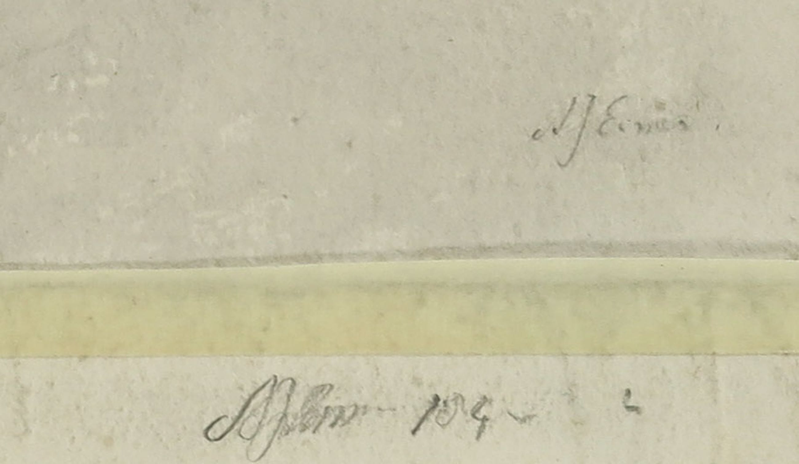 In het beeld zit wat foxing. Het glas heeft aan de achterzijde wat beschadigingen. Links in het beeld is een vouwrand te zien. Tevens is een stuk papier met tape bevestigd aan de aquarel, waarop ook een handtekening te lezen is. | |