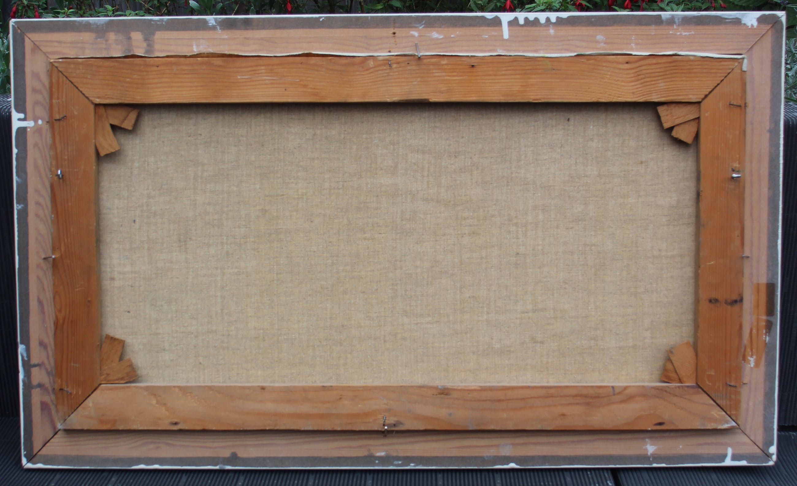 Lijsten: Beschadigingen aan lijsten worden niet beschreven. Indien een werk achter glas is ingelijst en het glas is kapot, zal dit wel vermeld worden(Er zit geen glas in deze lijst).