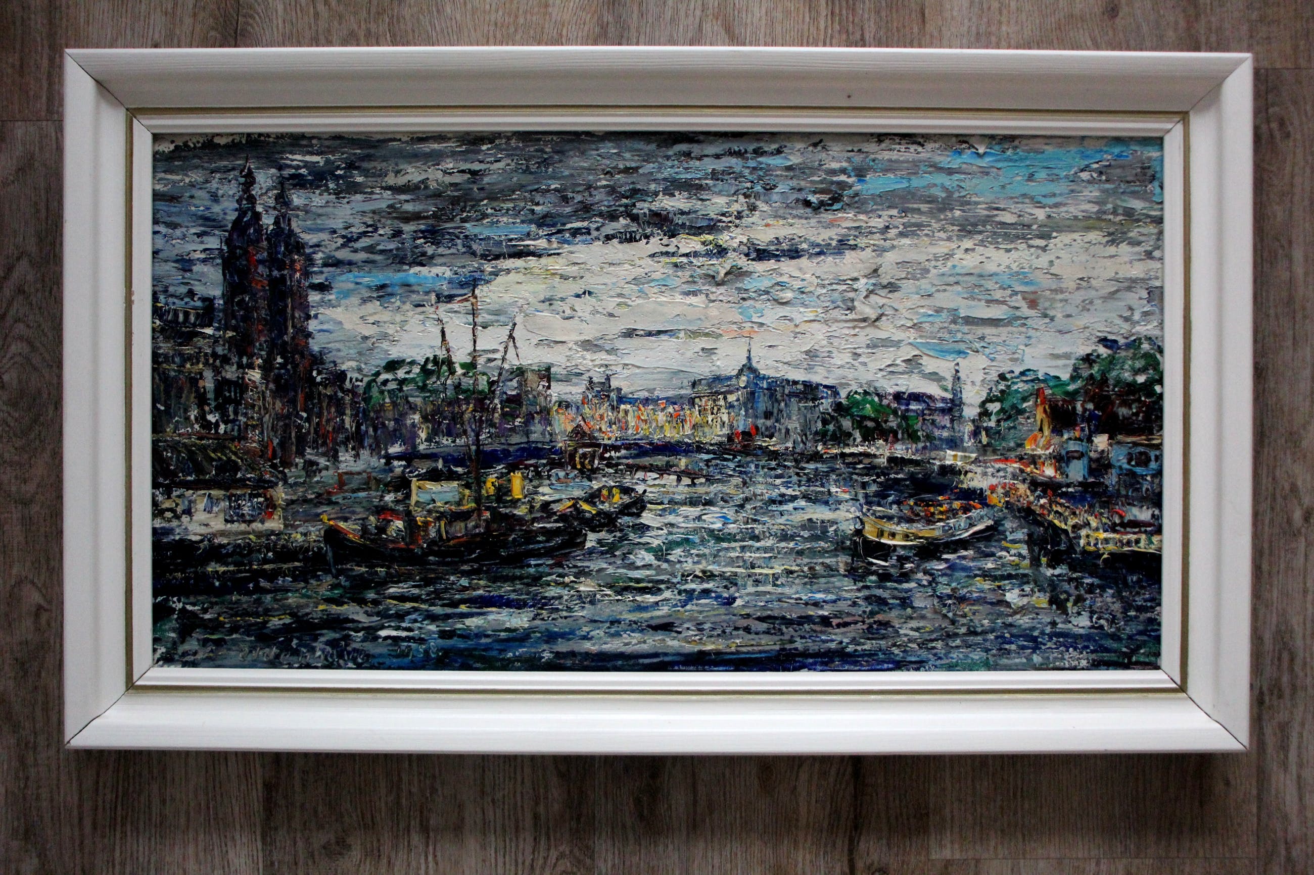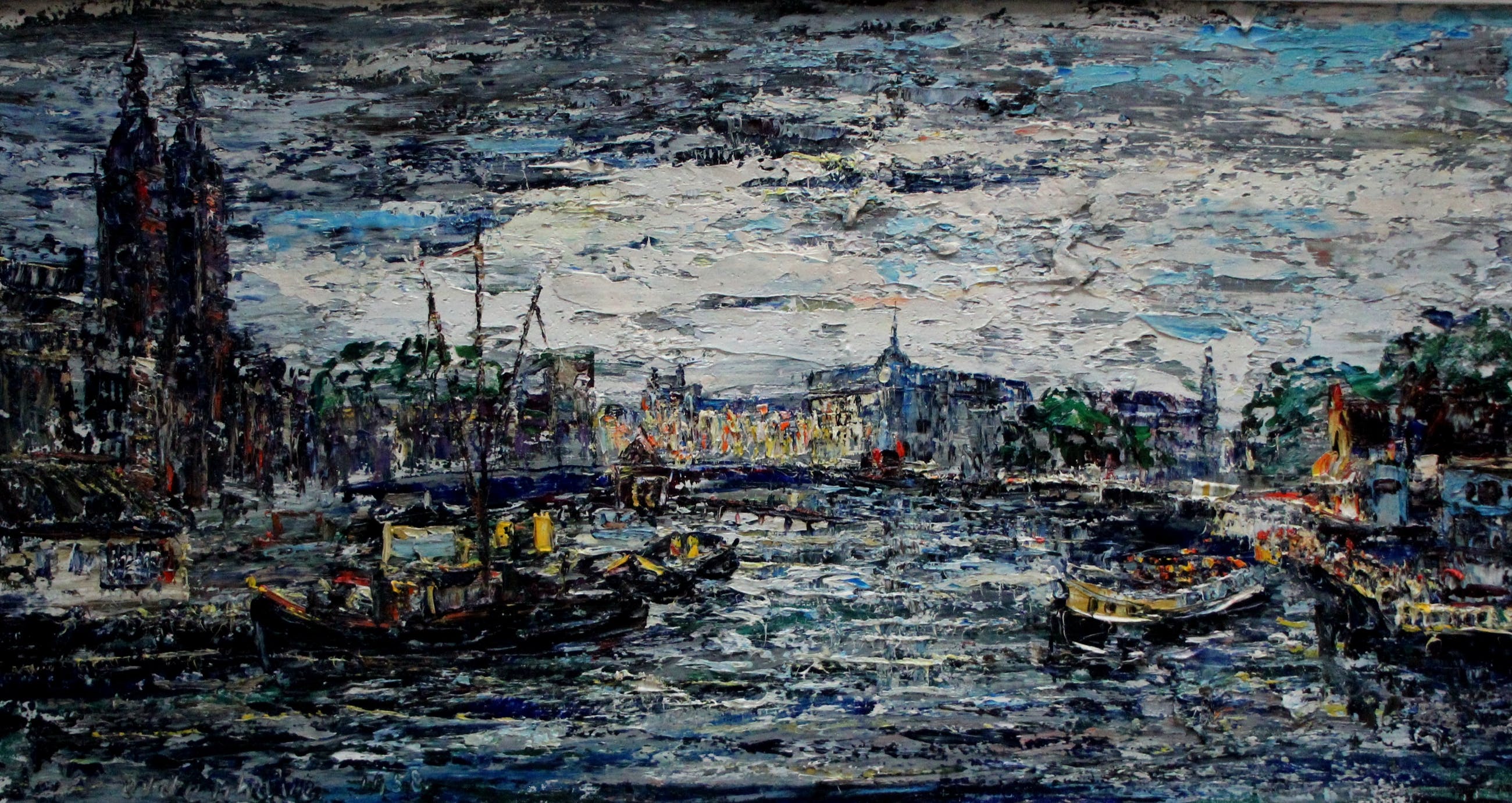 Olieverf van Arnoldus Oldenhave. Een voorstelling van de Prins Hendrikkade met links de St. Nicolaaskerk. Jaar: 1958. Afmetingen werk inkl lijst: H46 x b77,5cm. Afmetingen voorstelling: H37 x b69cm. Het werk is links onderaan gesigneerd en gedateerd door de kunstenaar. De authenticiteit van het, aangeboden werk, wordt volledig gegarandeerd. Een certificaat van echtheid kan, op aanvraag, worden gemaild.