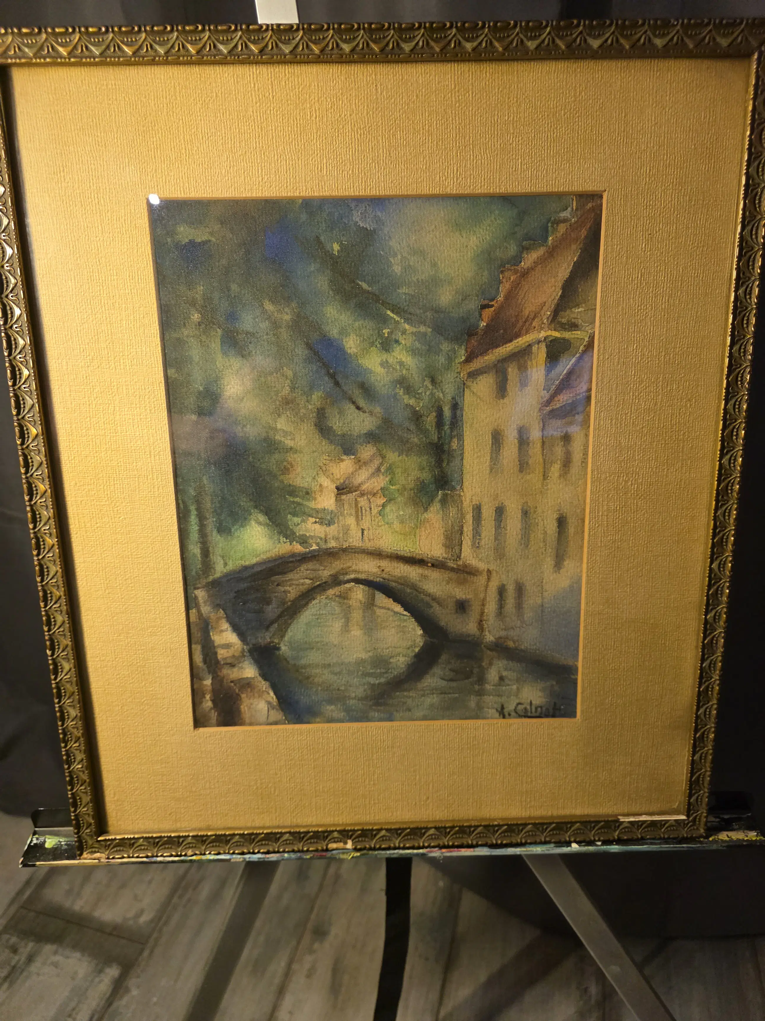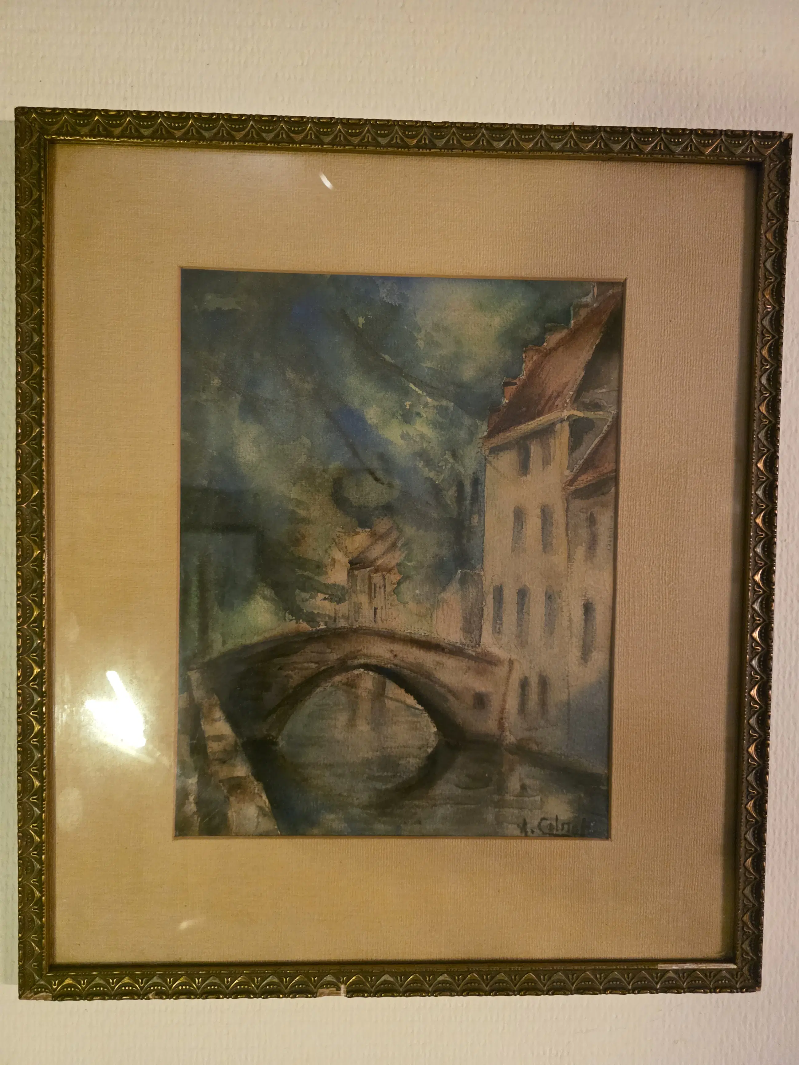 Originele aquarel van de Nederlandse kunstenaar Arnout Colnot(1883-1983) handgesigneerd. Het werk toont een sfeervol stadsgezicht met brug en water,uitgevoerd in transparante blauwen, groenen ,en warme okertonen kenmerkende voor Colnots Aquarel techniek.