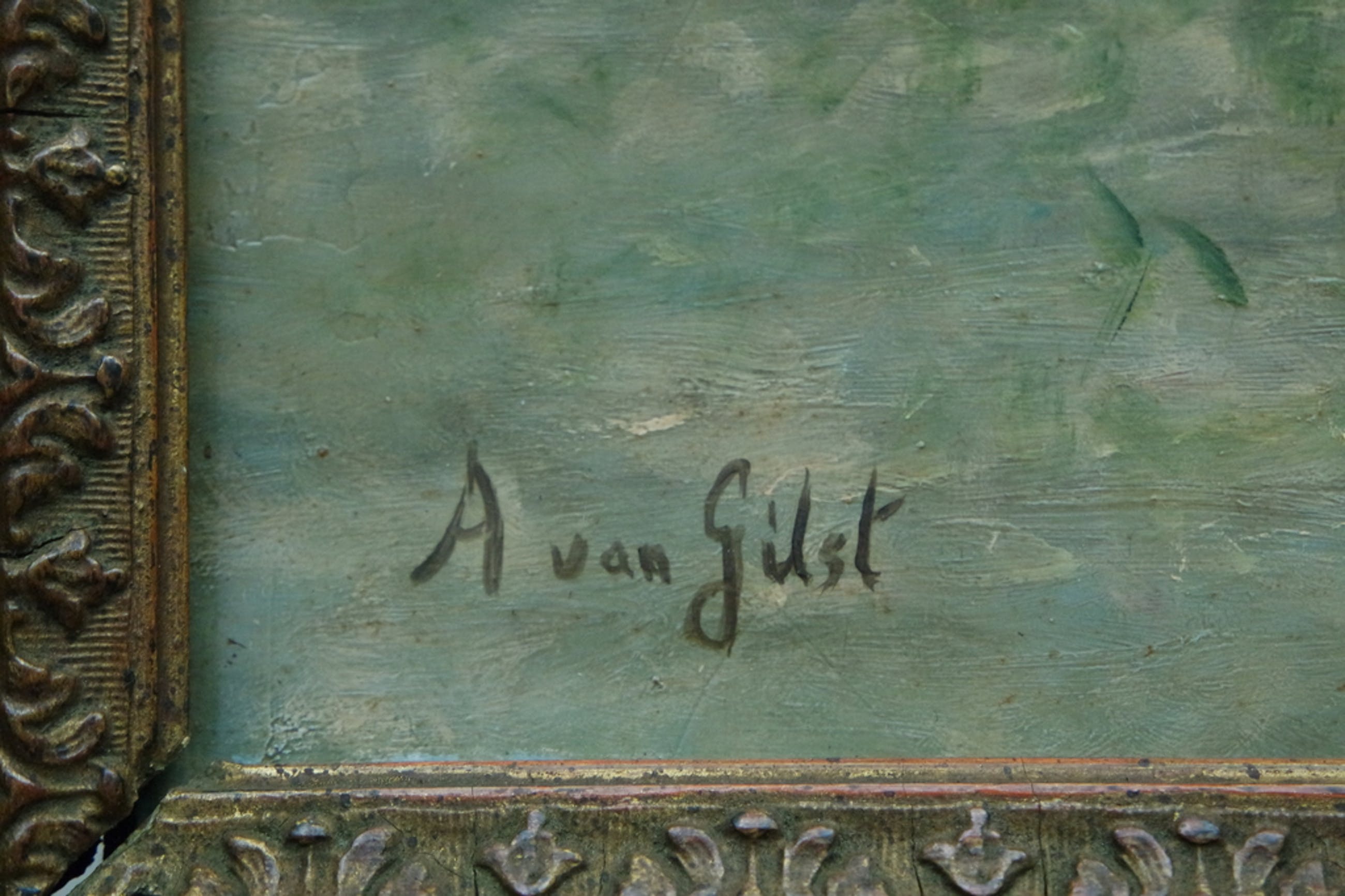 Afmetingen: 60 cm. x 50 cm. ( met lijst ) en de paneelmaat is 40 cm. x 30 cm. De kostbare lijst is authentiek. Conditie paneel en lijst: goed.