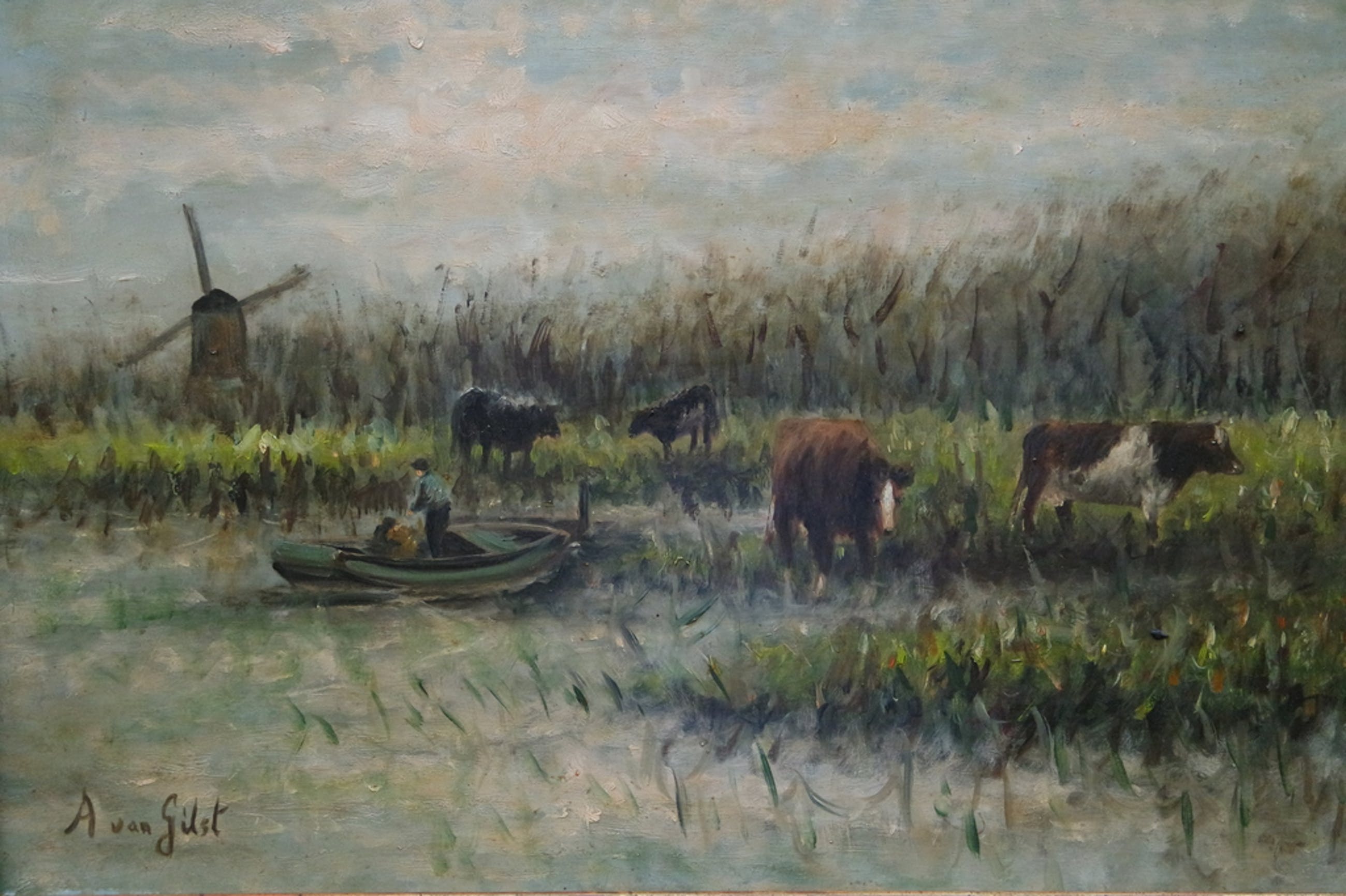 Een schitterend landschapsschilderij van de kunstenaar Arnout van Gilst. Gesigneerd links onder.