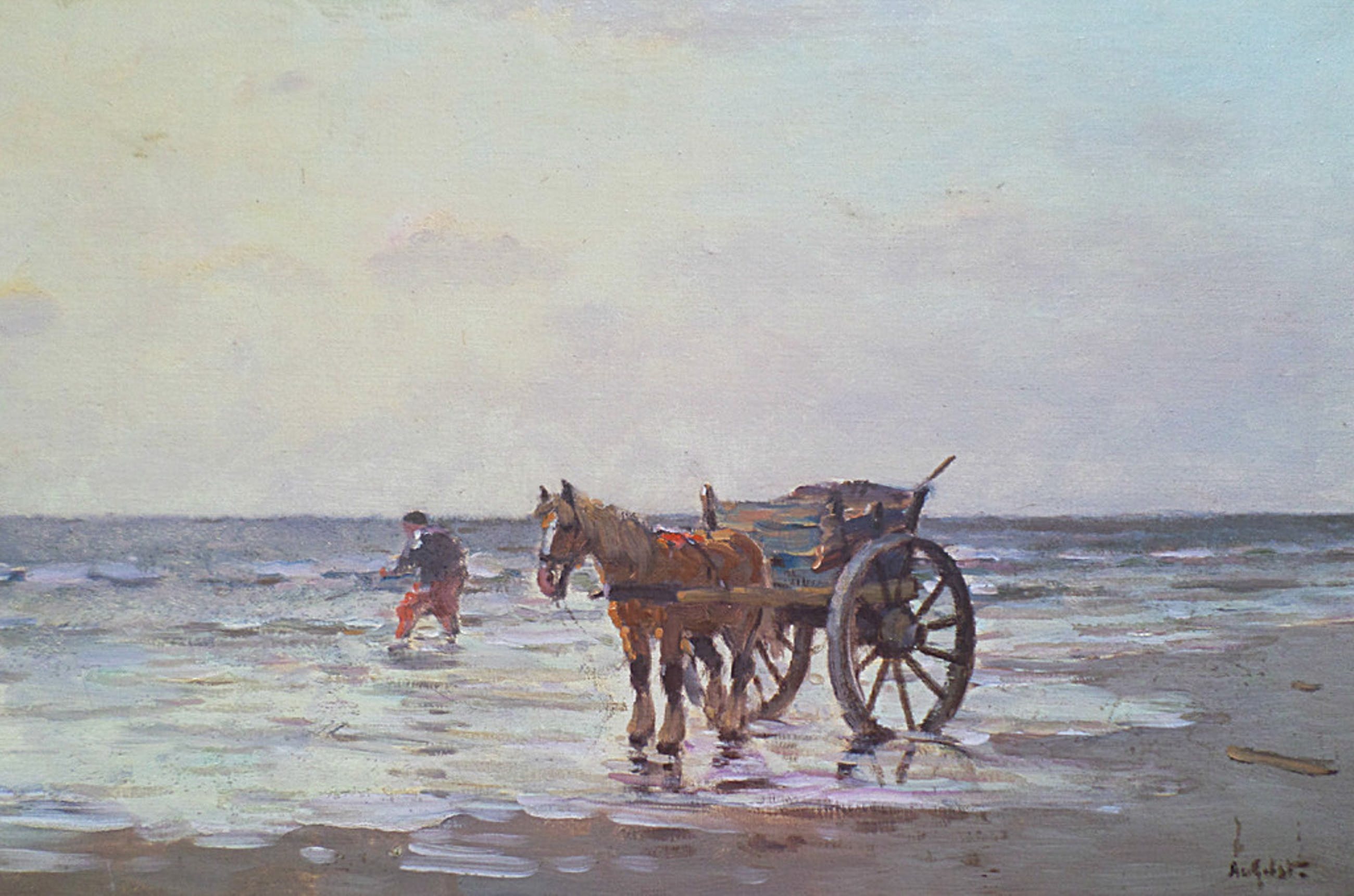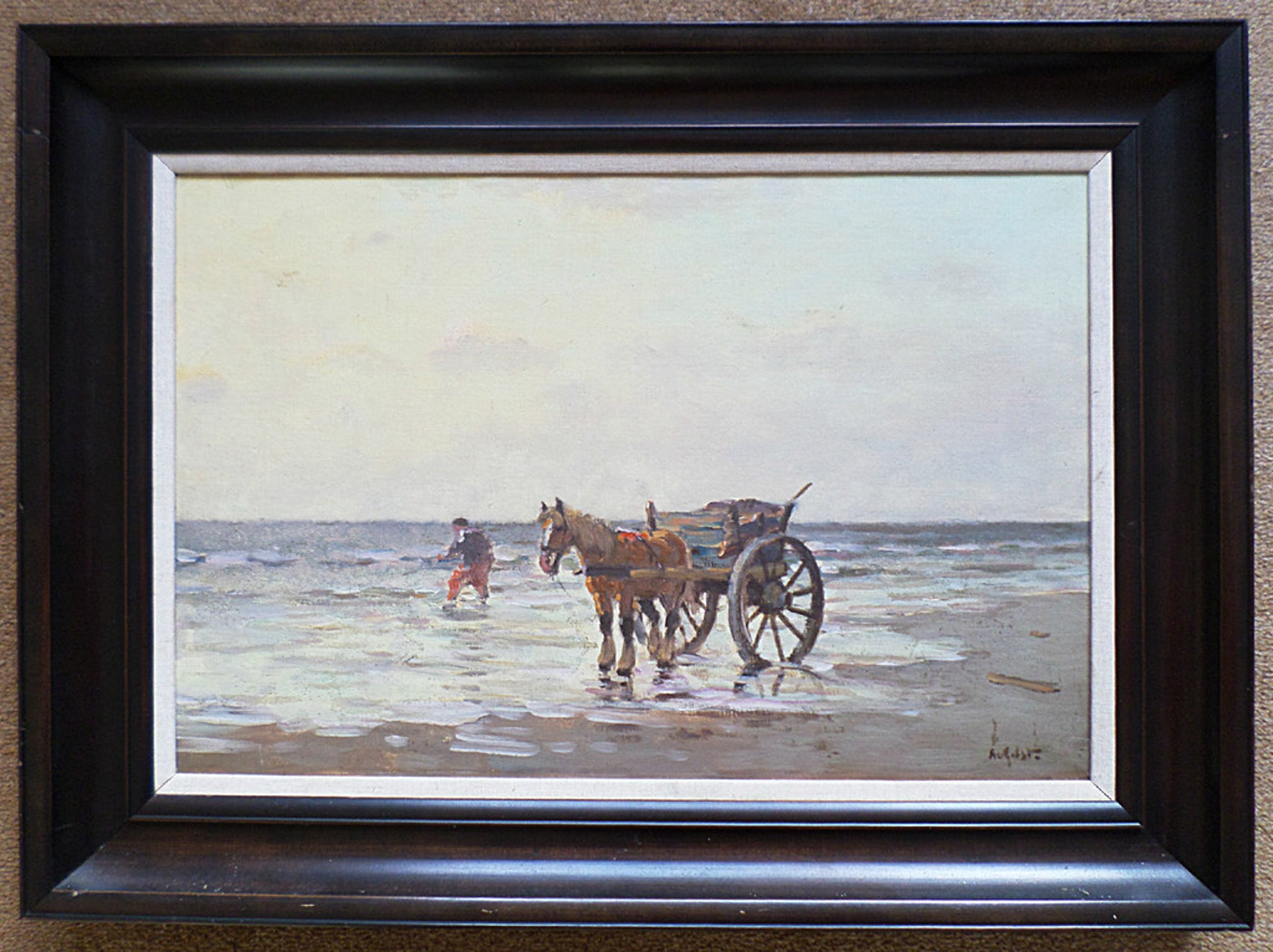 Leuk werk van Arnout van Gilst in houten lijst. Olieverf op doek, gesigneerd rechtsonder. In redelijk goede staat. Doek heeft minuscuul gaatje op de grens van het zeewater en het strand, maar dit is met het blote oog nauwelijks waar te nemen.
