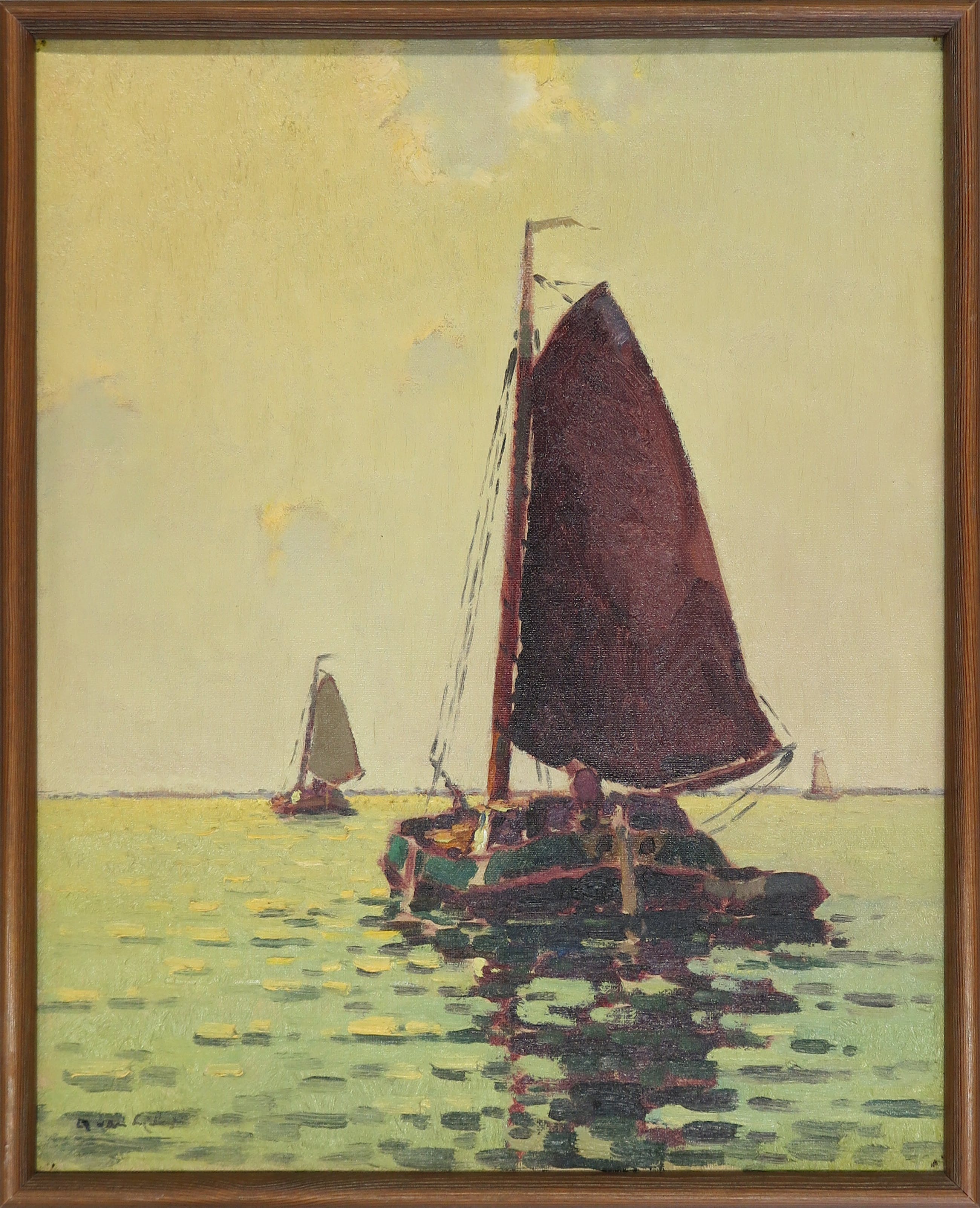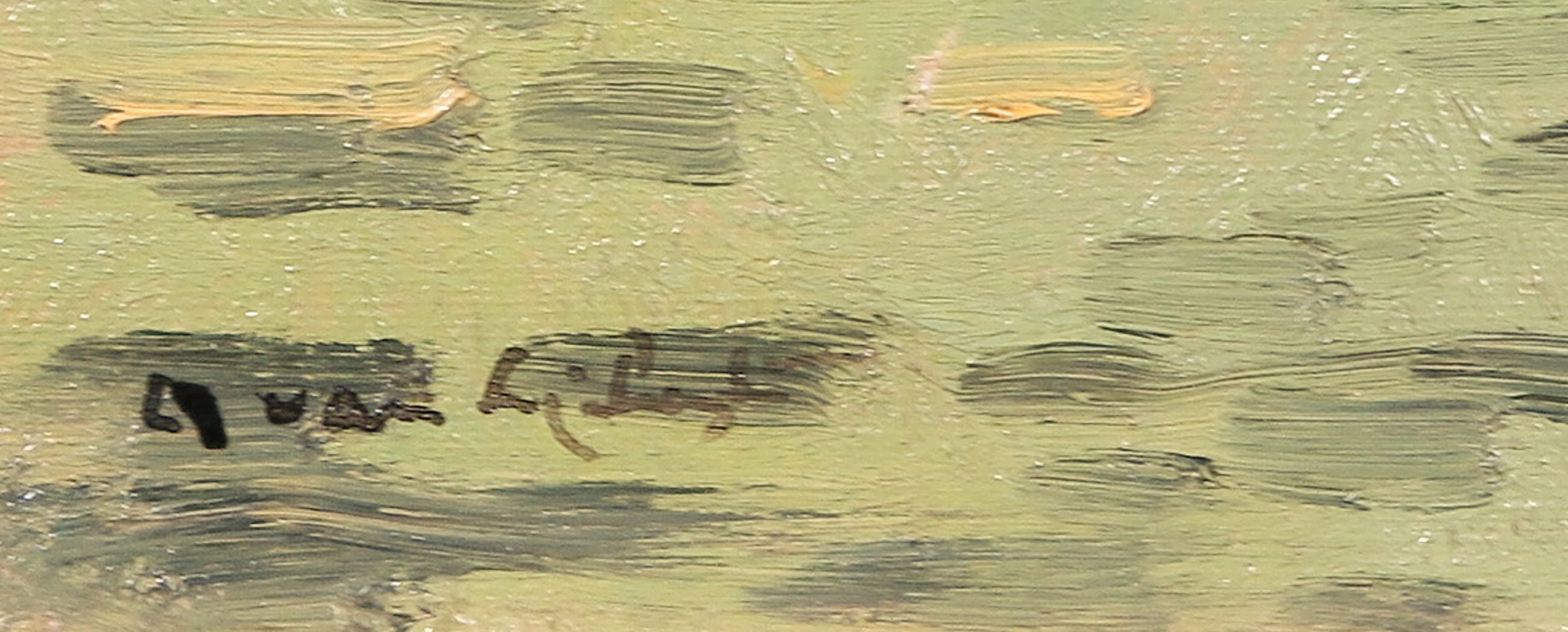 | Goede staat, met (lichte) slijtage met verfverlies in iedere hoek. Het doek/vernis oogt vergeeld/vuil. | |