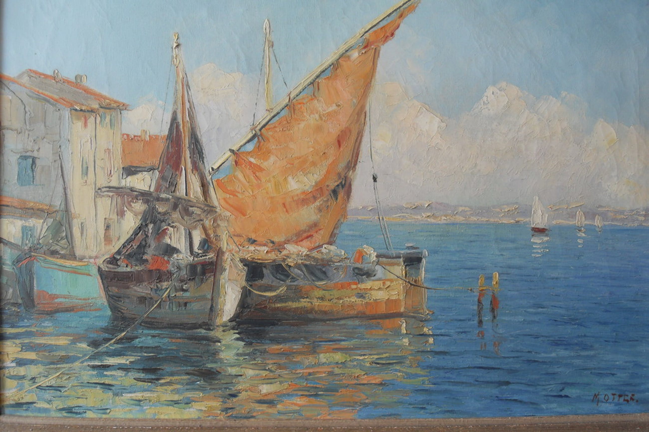 Prachtig impressionistisch schilderij vaneen italiaans visserdorp van de leidse kunstenaaar Arnout van Gilst, die dit op een van zijn vele reizen heeft geschilderd. Hij heeft het gesigneerd onder zijn pseudoniem Ottee. Het werk is 50 x 70 cm en is te dateren rond 1938. Het schilderij is gelijst en is in goede conditie