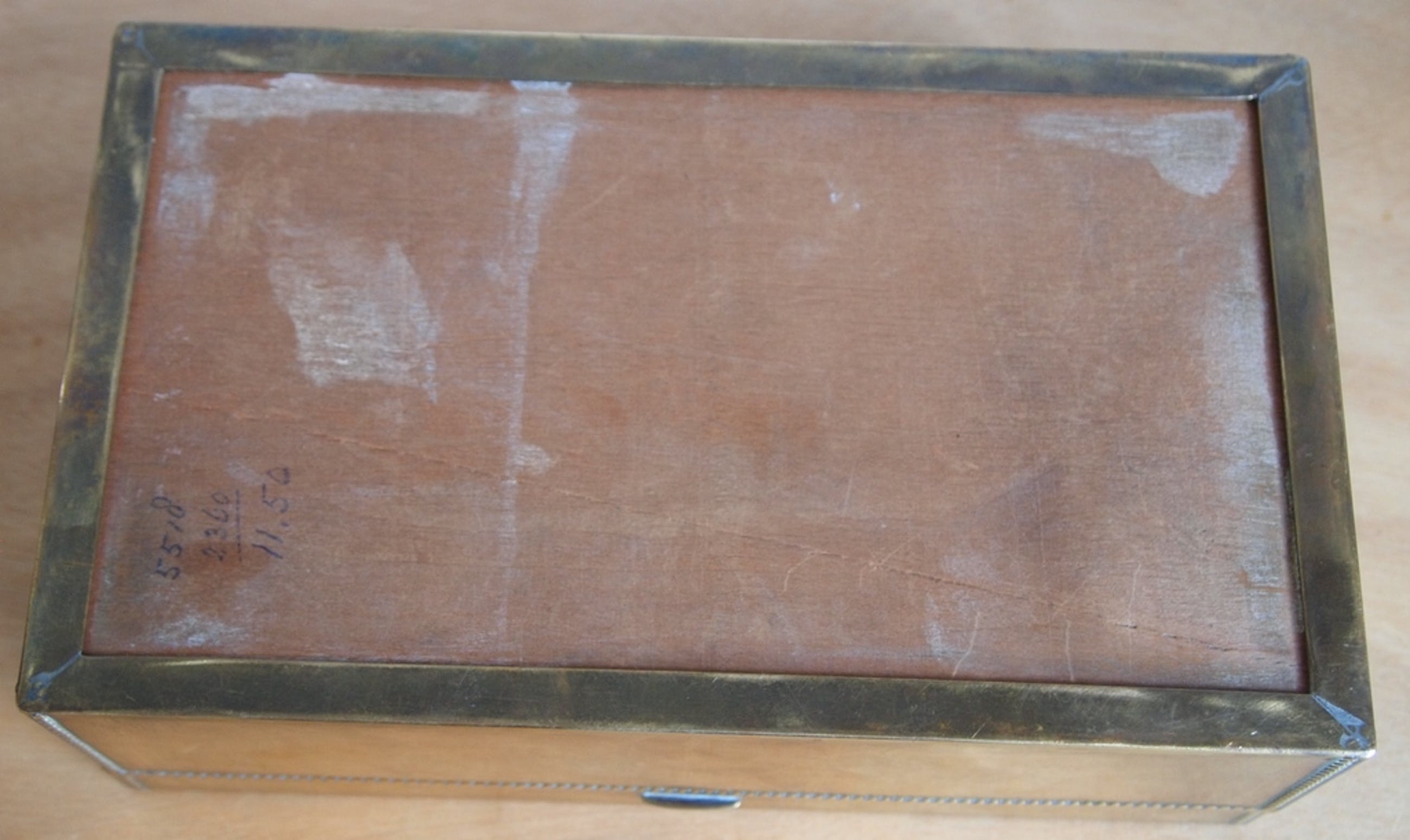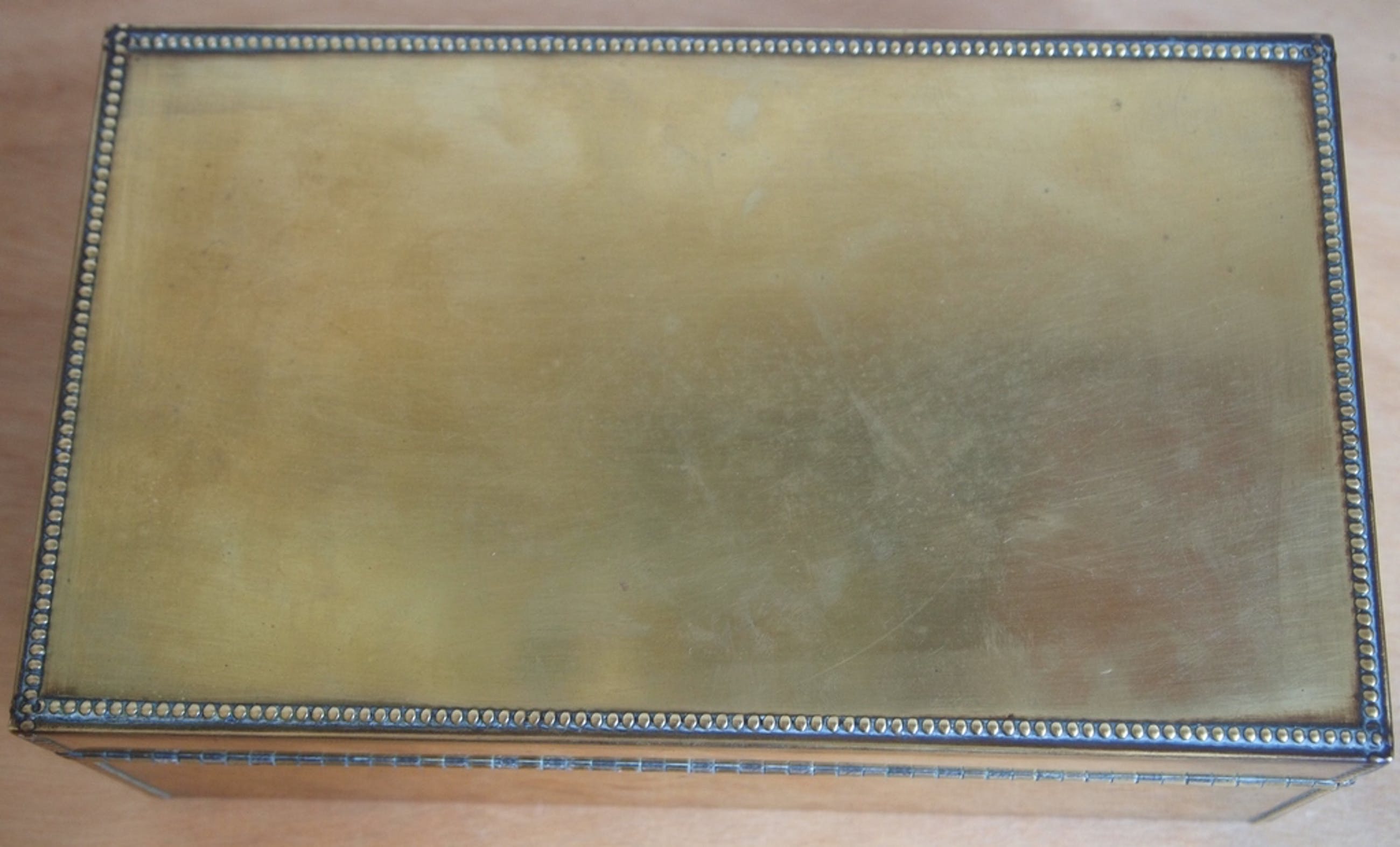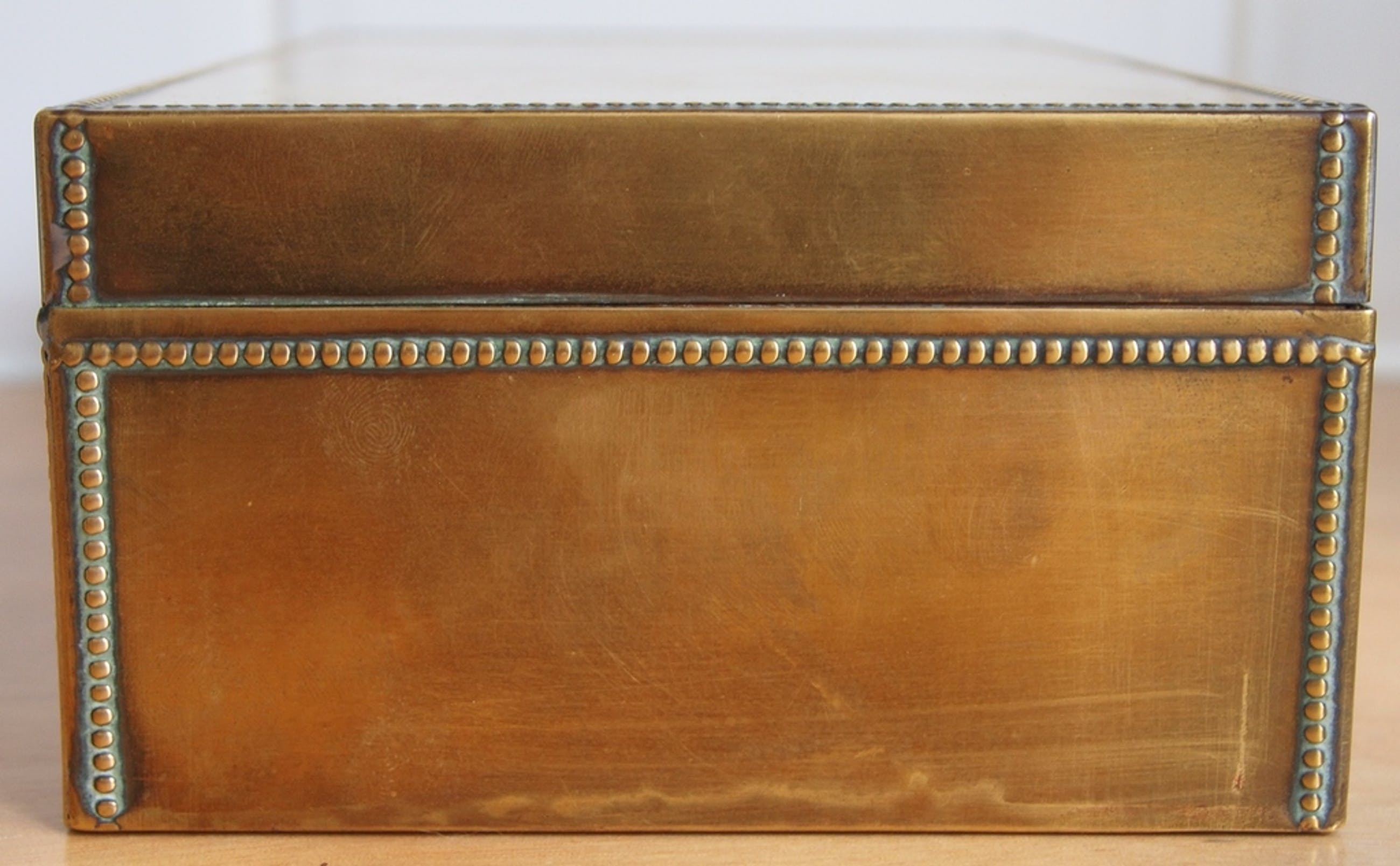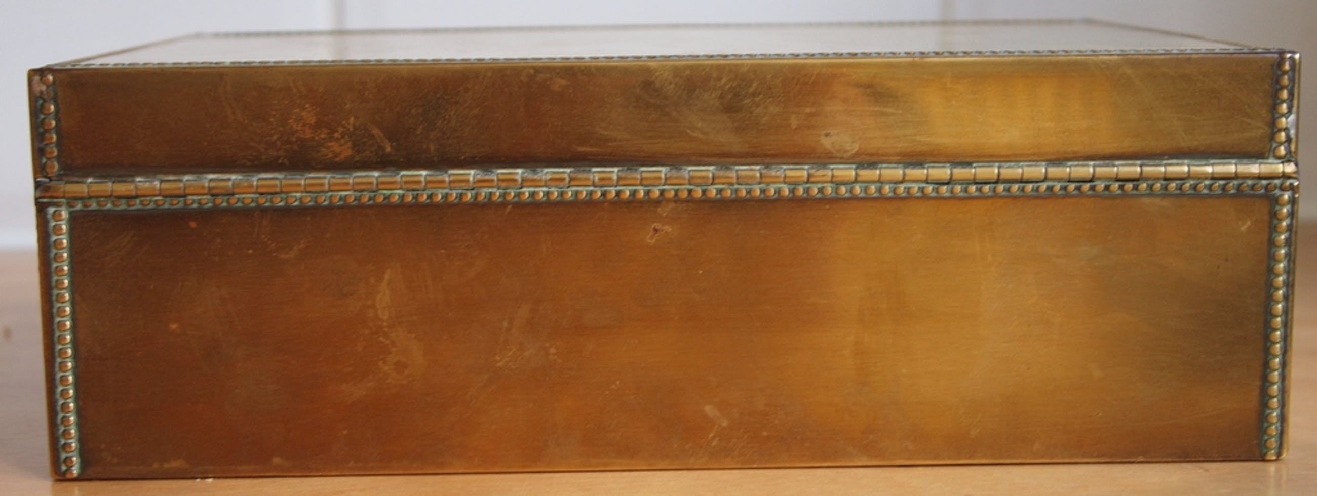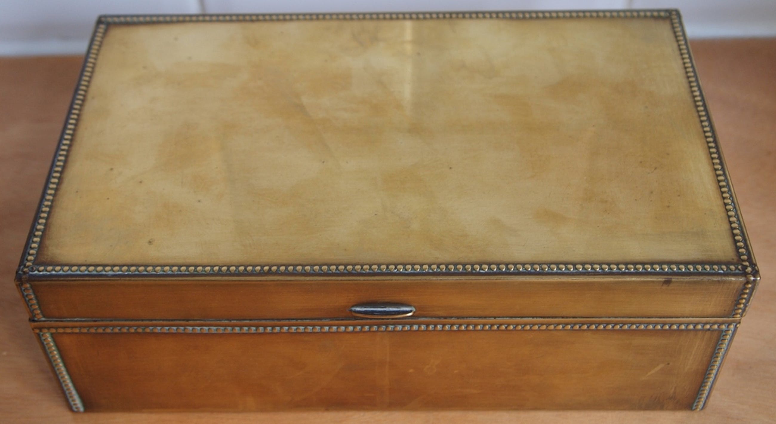 Mooie hand gemaakte geel koperen of messing art deco sigarendoos met parelrand decoratie en houten binnendoos. In prima onbeschadigde conditie. Niet gemerkt.