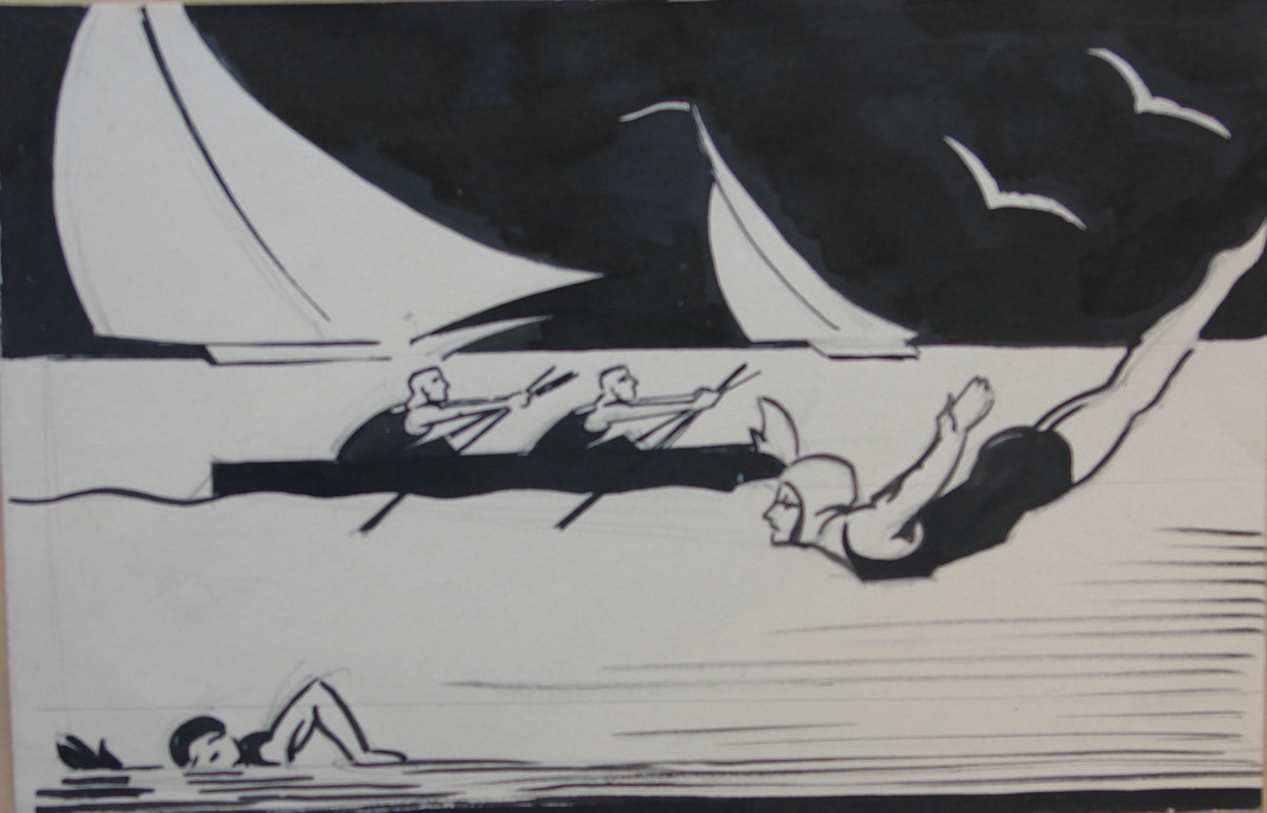 Een mooie tekening uit de jaren dertig. Waarschijnlijk een ontwerp voor de promotie van watersport. Schoonspringen, zwemmen, roeien en de zeilsport zijn afgebeeld. Kunstenaar helaas onbekend Inkttekening, geen druk! 16, 5 x 23 cm