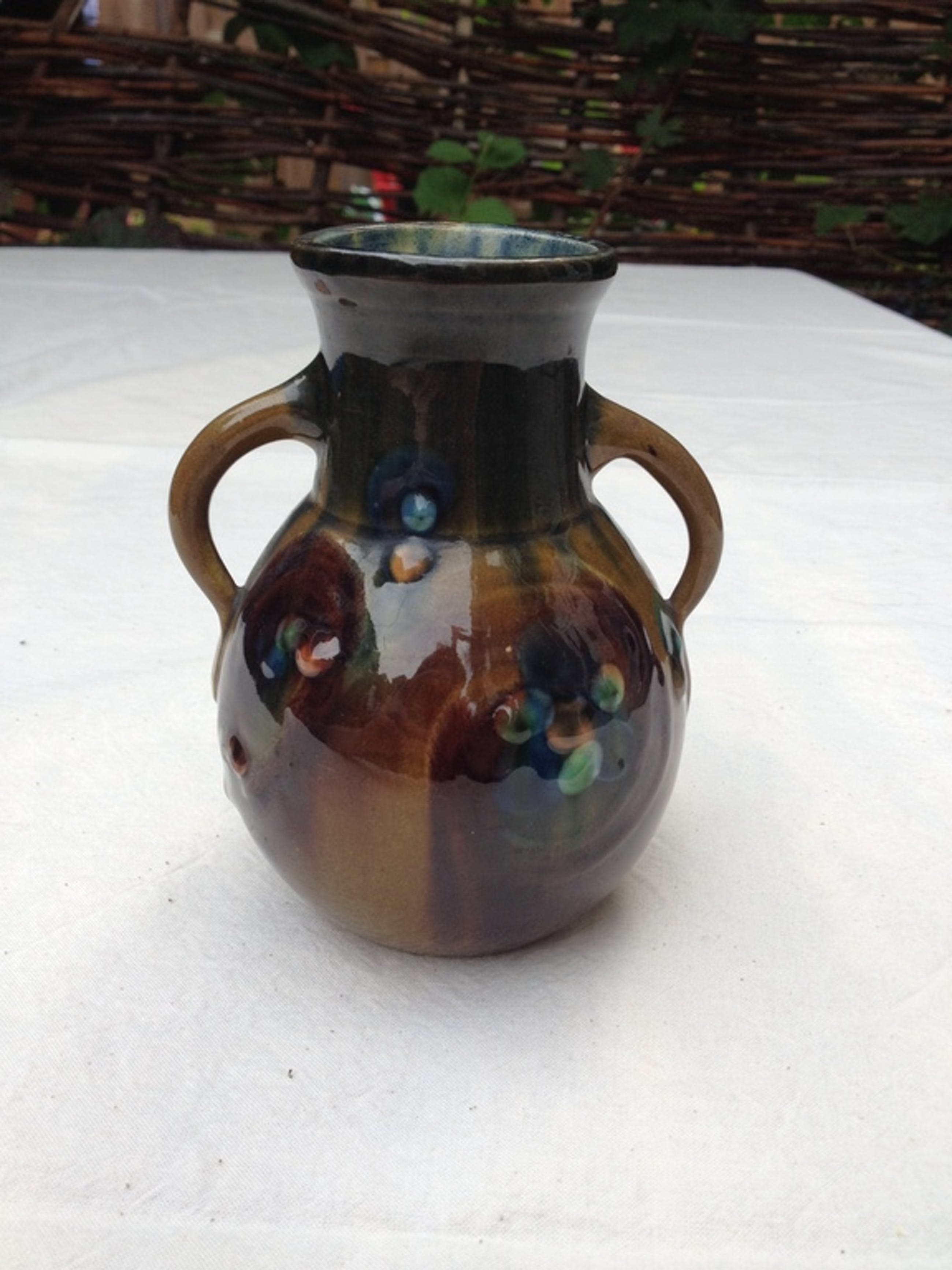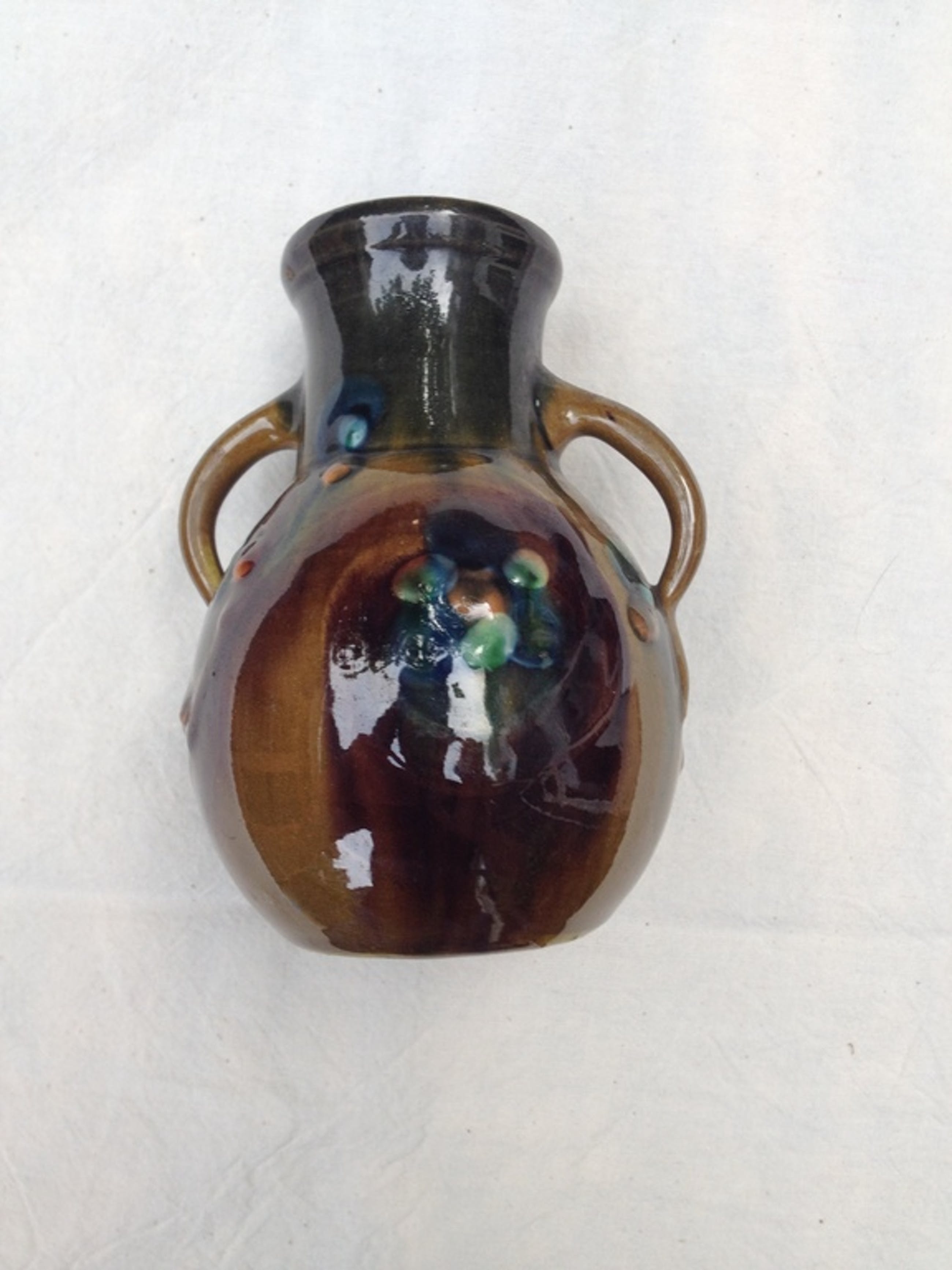Art Nouveau Majolica Amphoor vaasje. Mooi stijlvol vaasje. In onbeschadigde conditie. Helaas niet gemerkt.