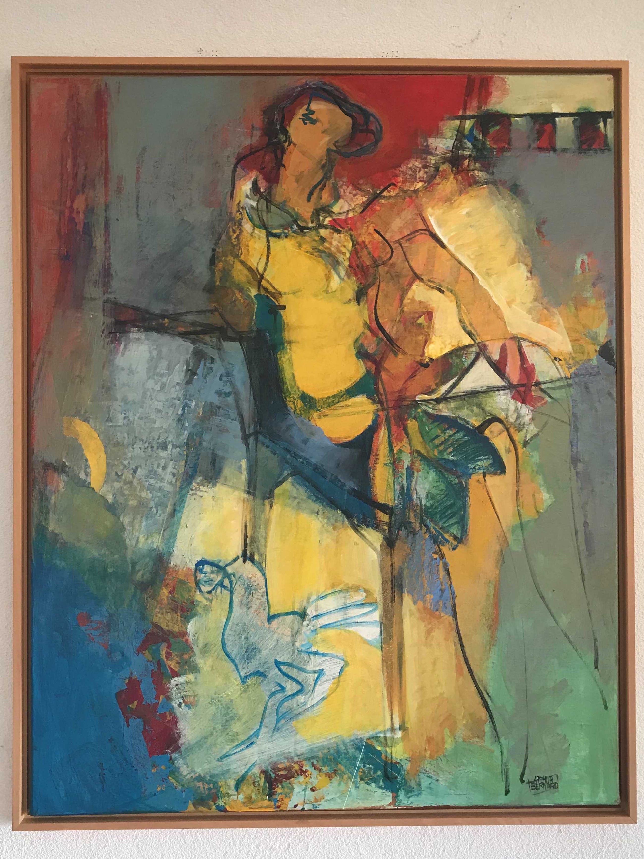 Prachtig schilderij met heldere kleuren in blanken houten lijst