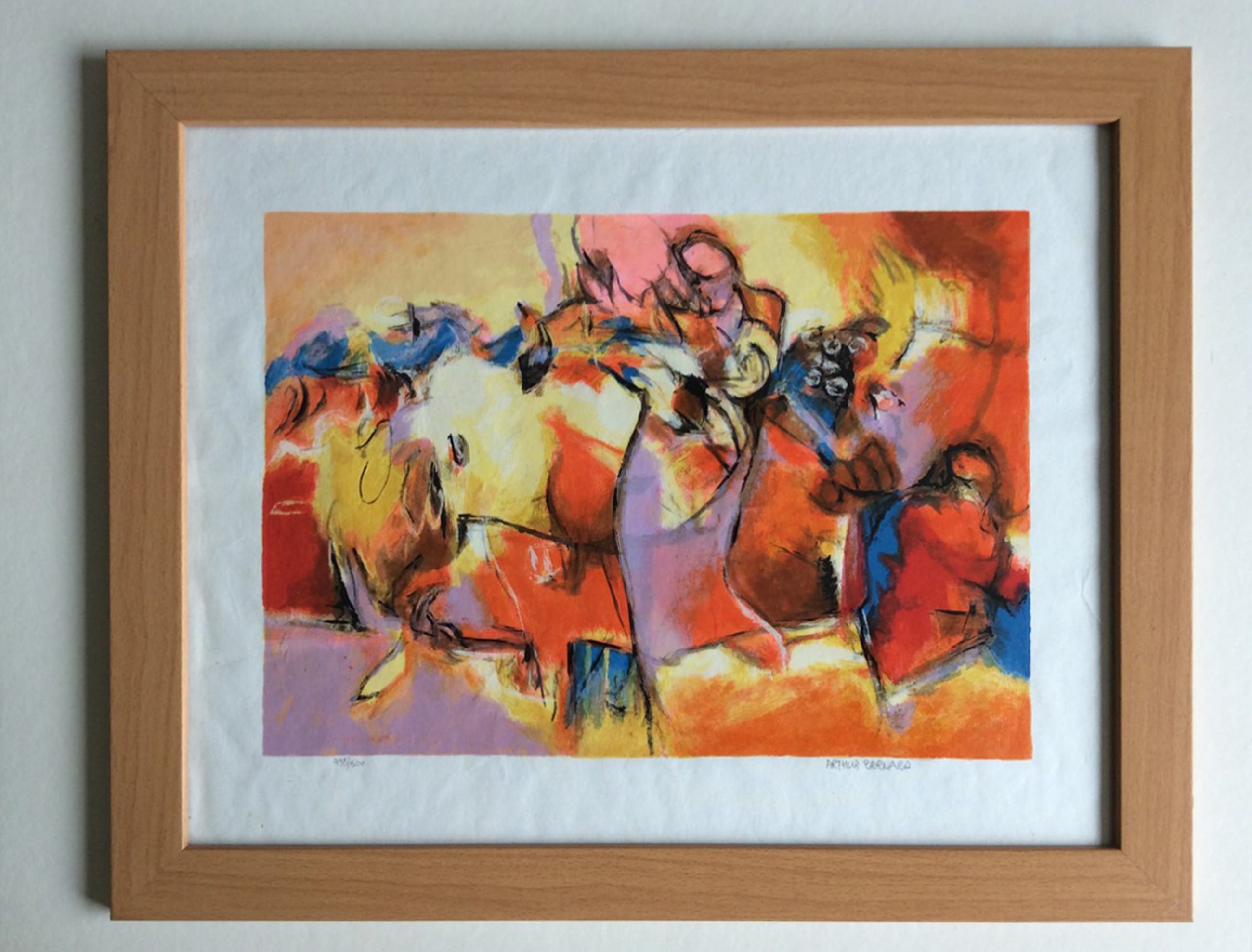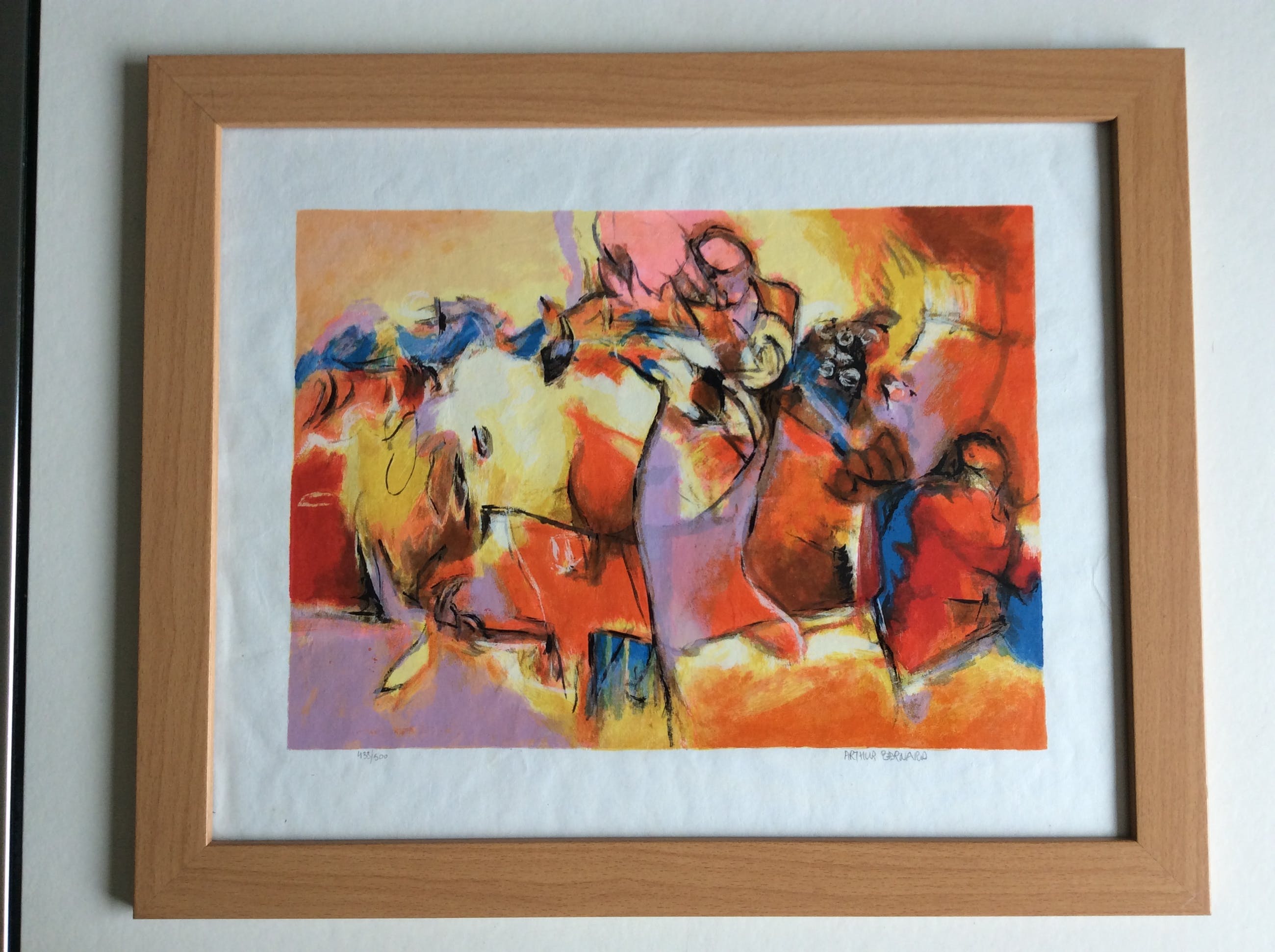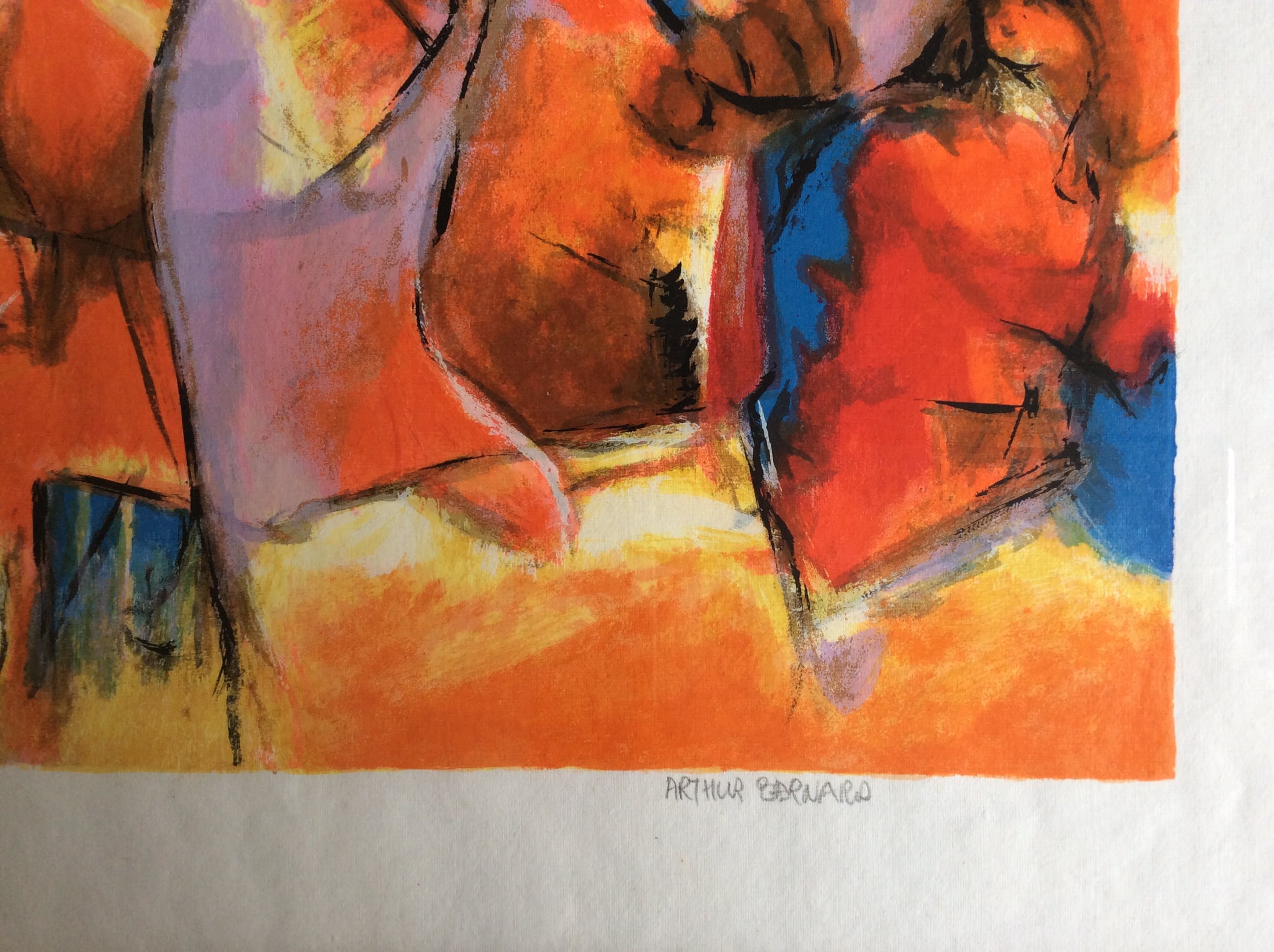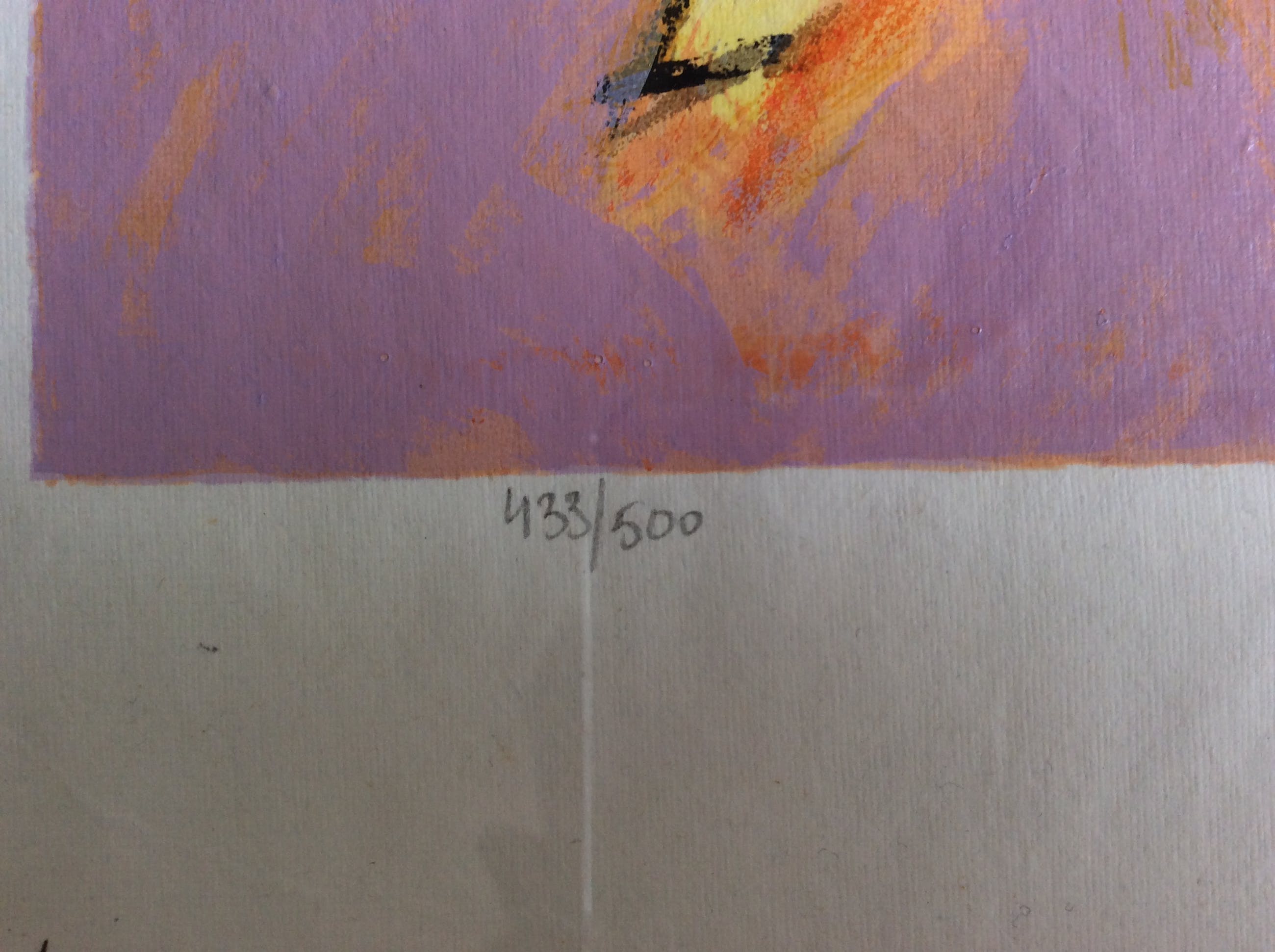In houten lijst gestoken zeefdruk op linnenpapier van Arthur Bernard: Pink Face, oplage 433/500. Formaat incl.