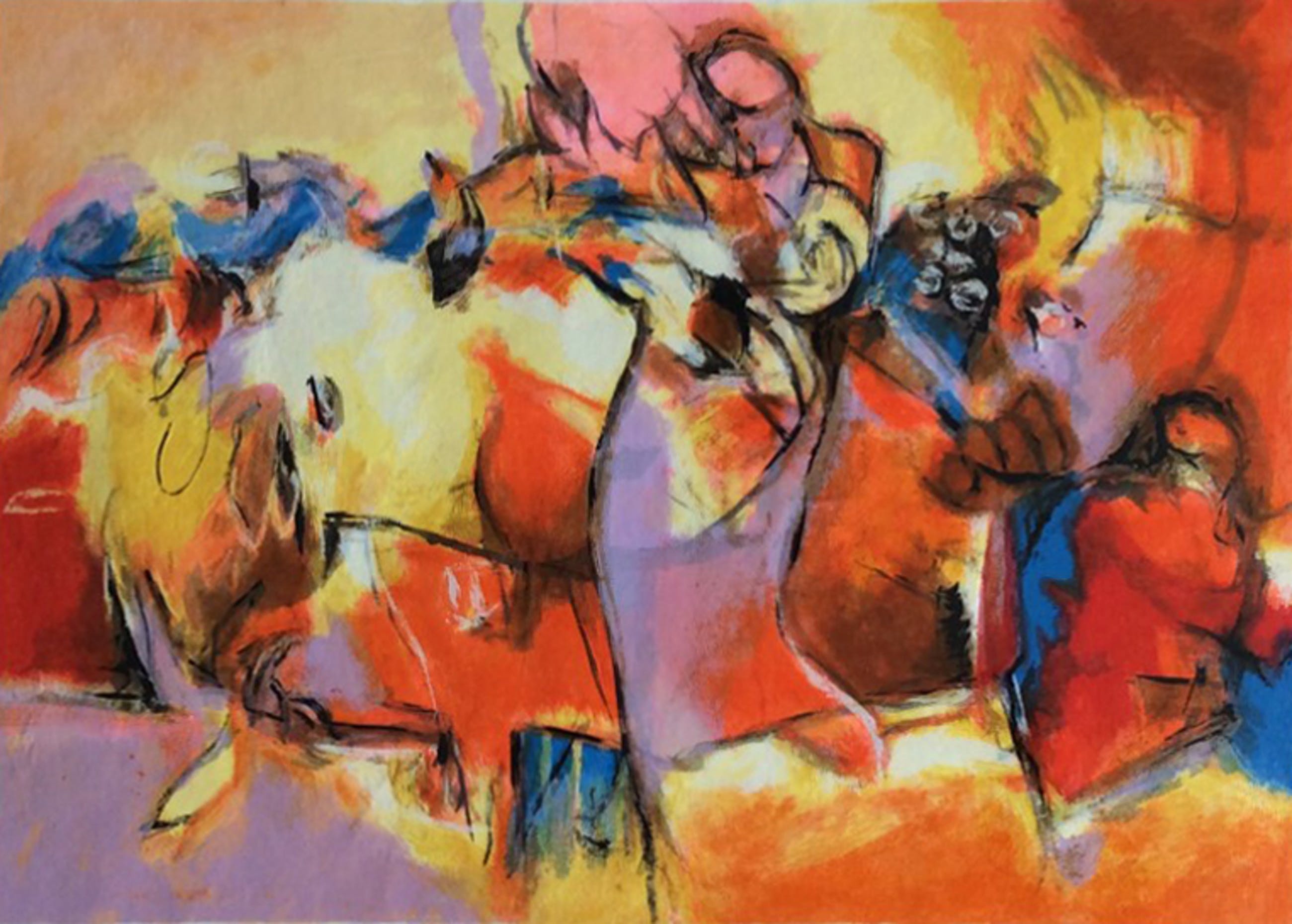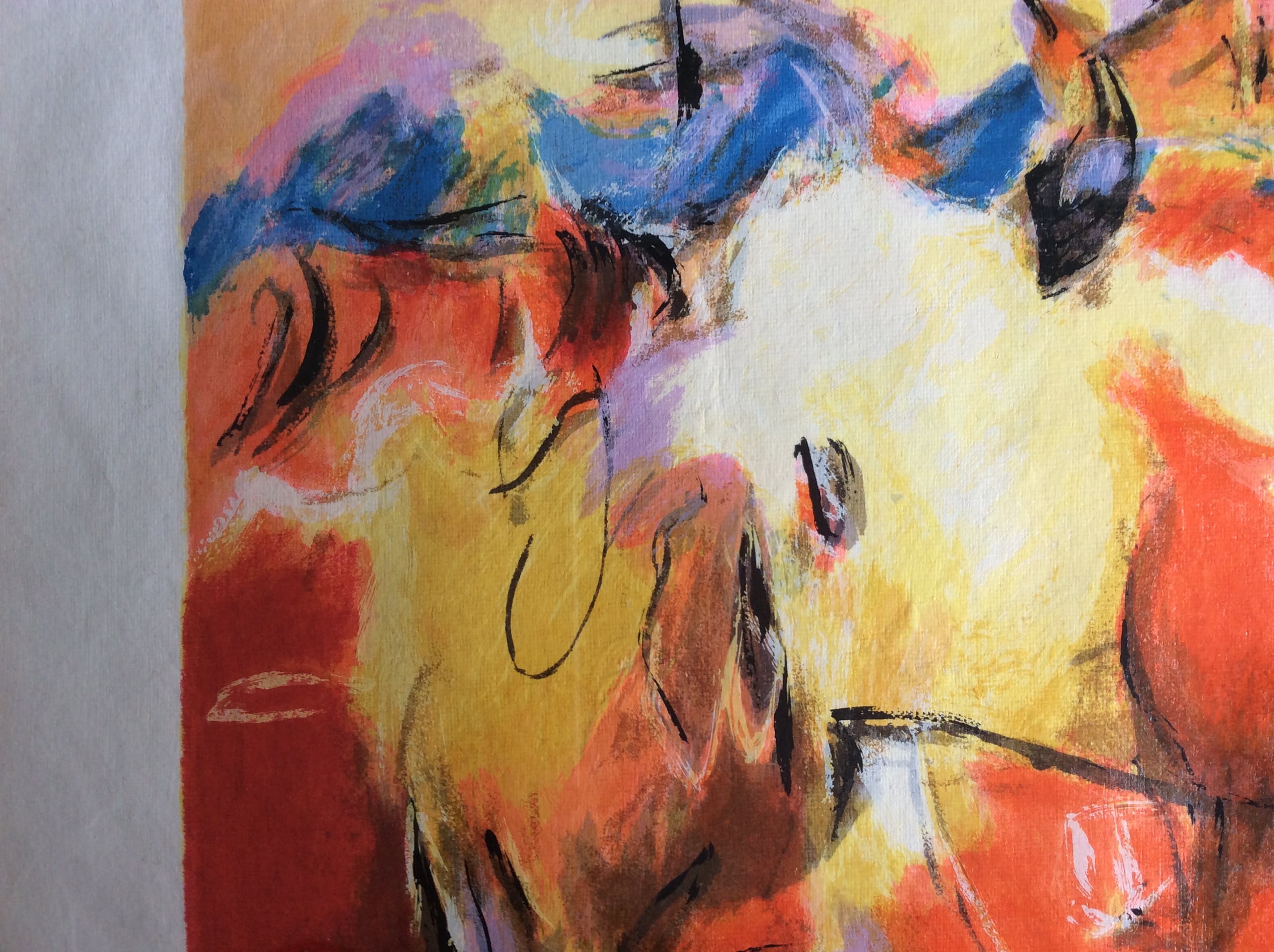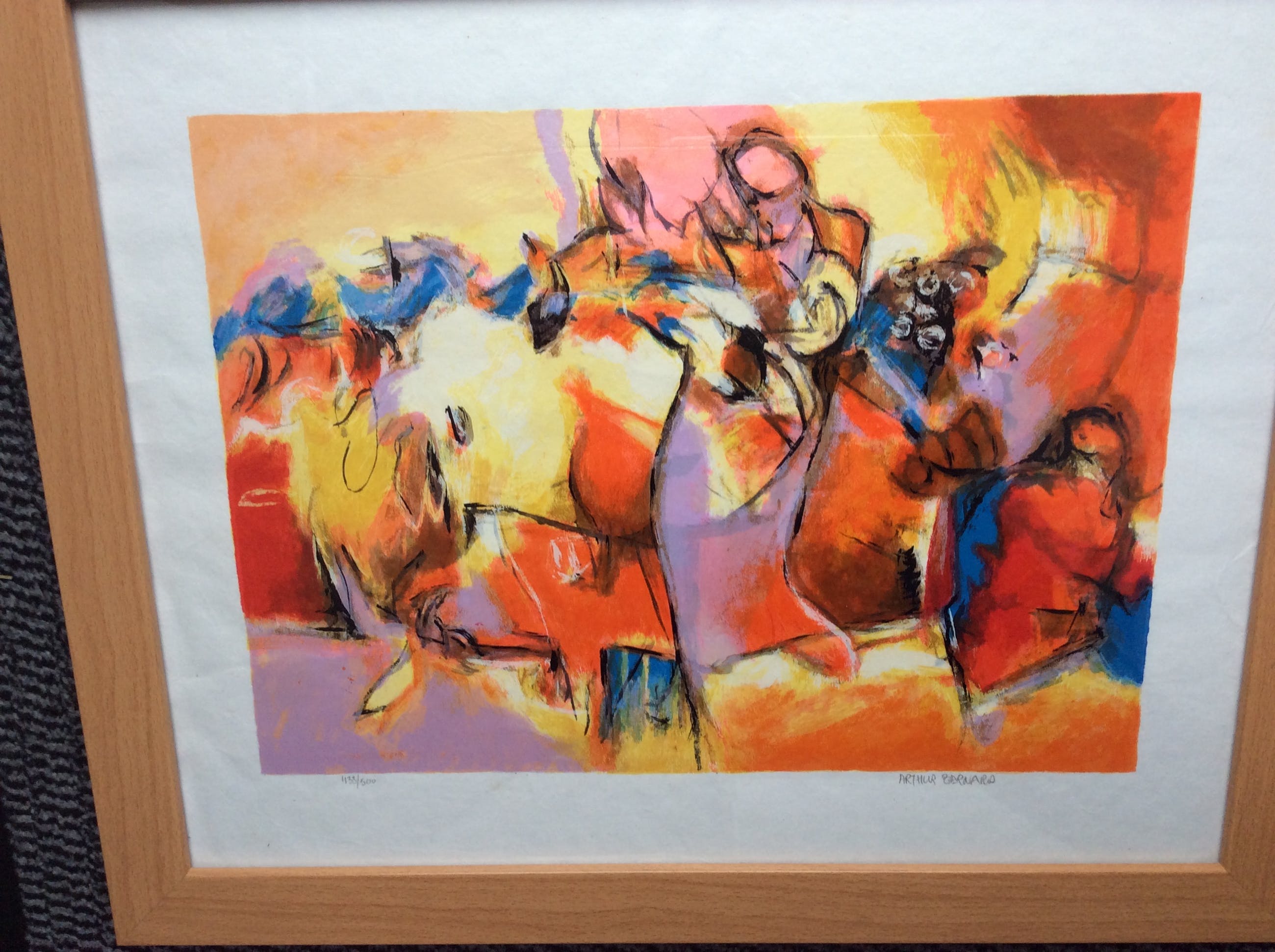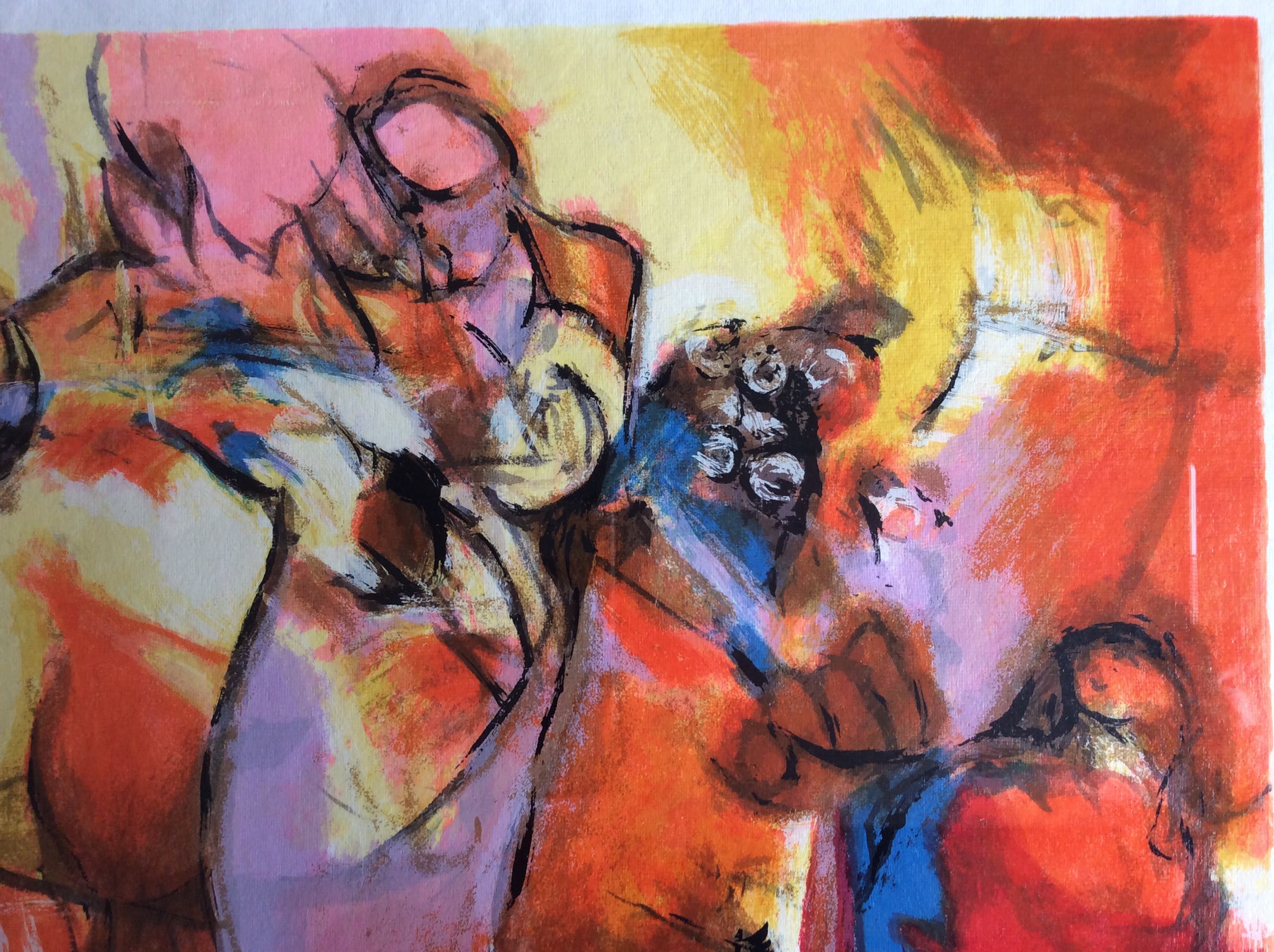 In houten lijst gestoken zeefdruk op linnenpapier van Arthur Bernard: Pink Face, oplage 433/500. Formaat incl.