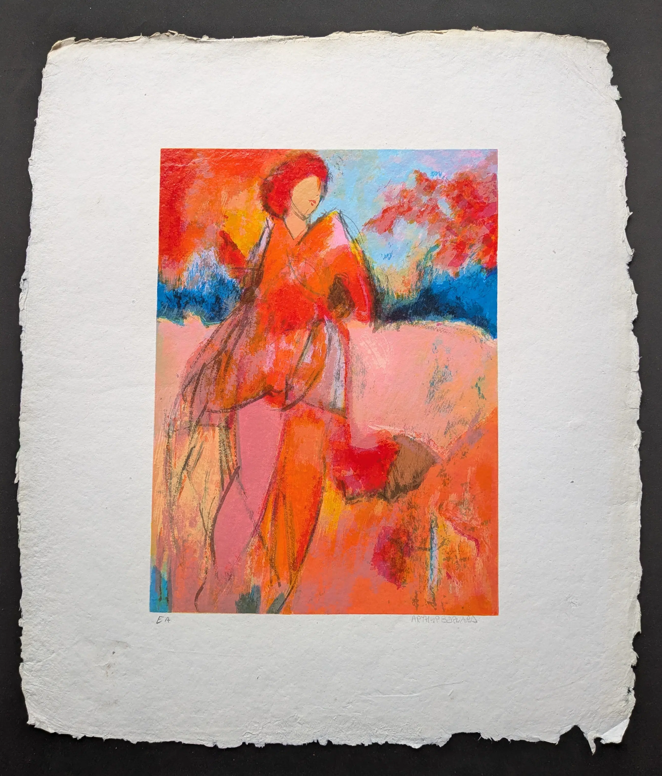 Prachtige zeefdruk van een vrouw in rode en oranje tinten door Arthur Bernard. De zeefdruk is gesigneerd en genummerd E.A. (Artist proof) in potlood. Afmetingen blad: 61,5 x 53,5cm Afmetingen druk: 40,2 x 29,6cm