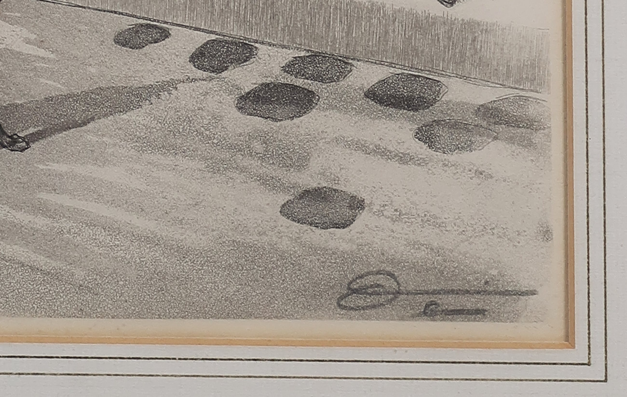| Het blad is licht verkleurd. Het passe-partout bevat wat vuil en vochtschade. De donkere plekken in het boven/midden en onder/midden zitten niet in het werk, maar zijn schaduwen van lijmresten op het glas. | |