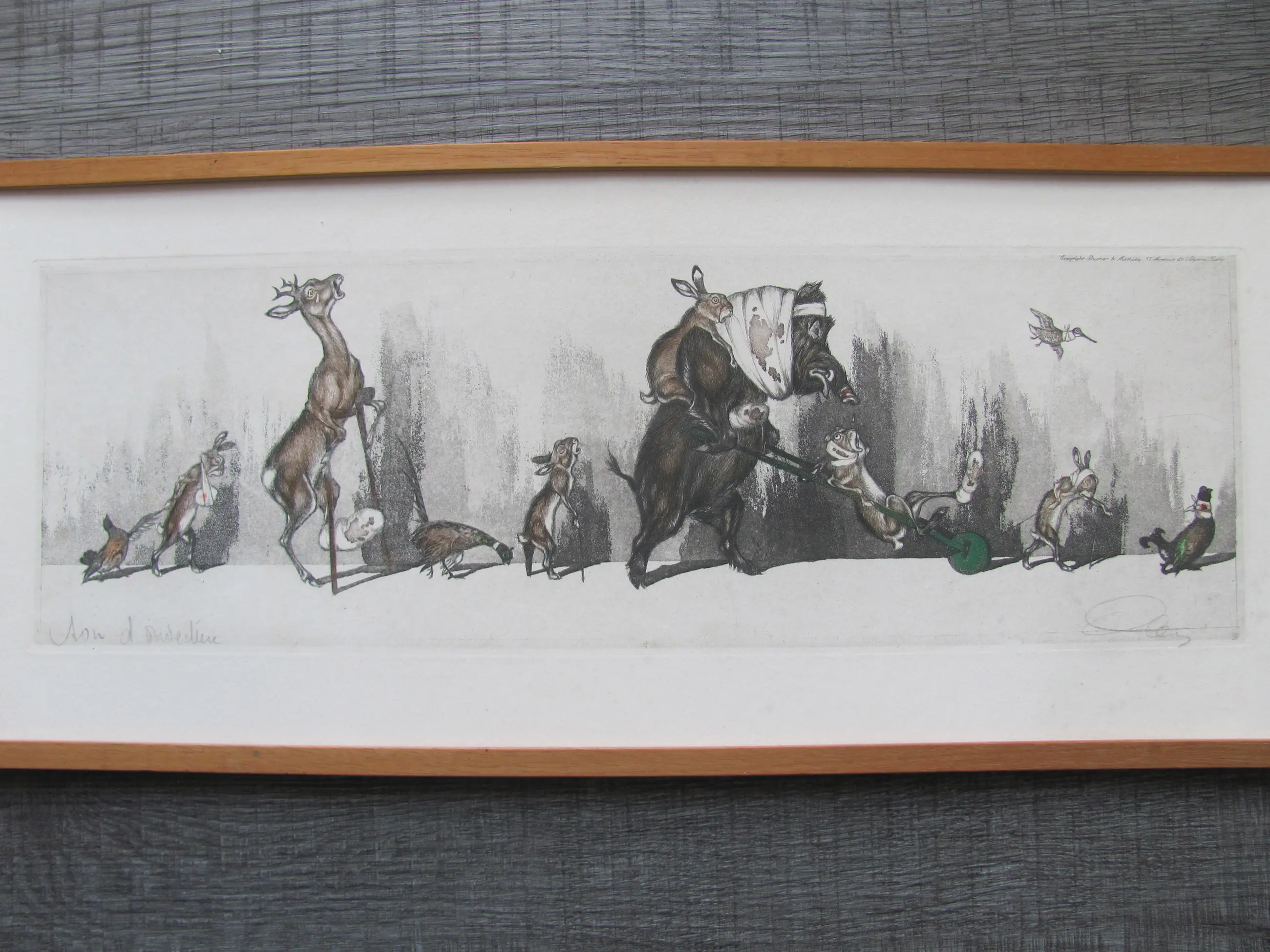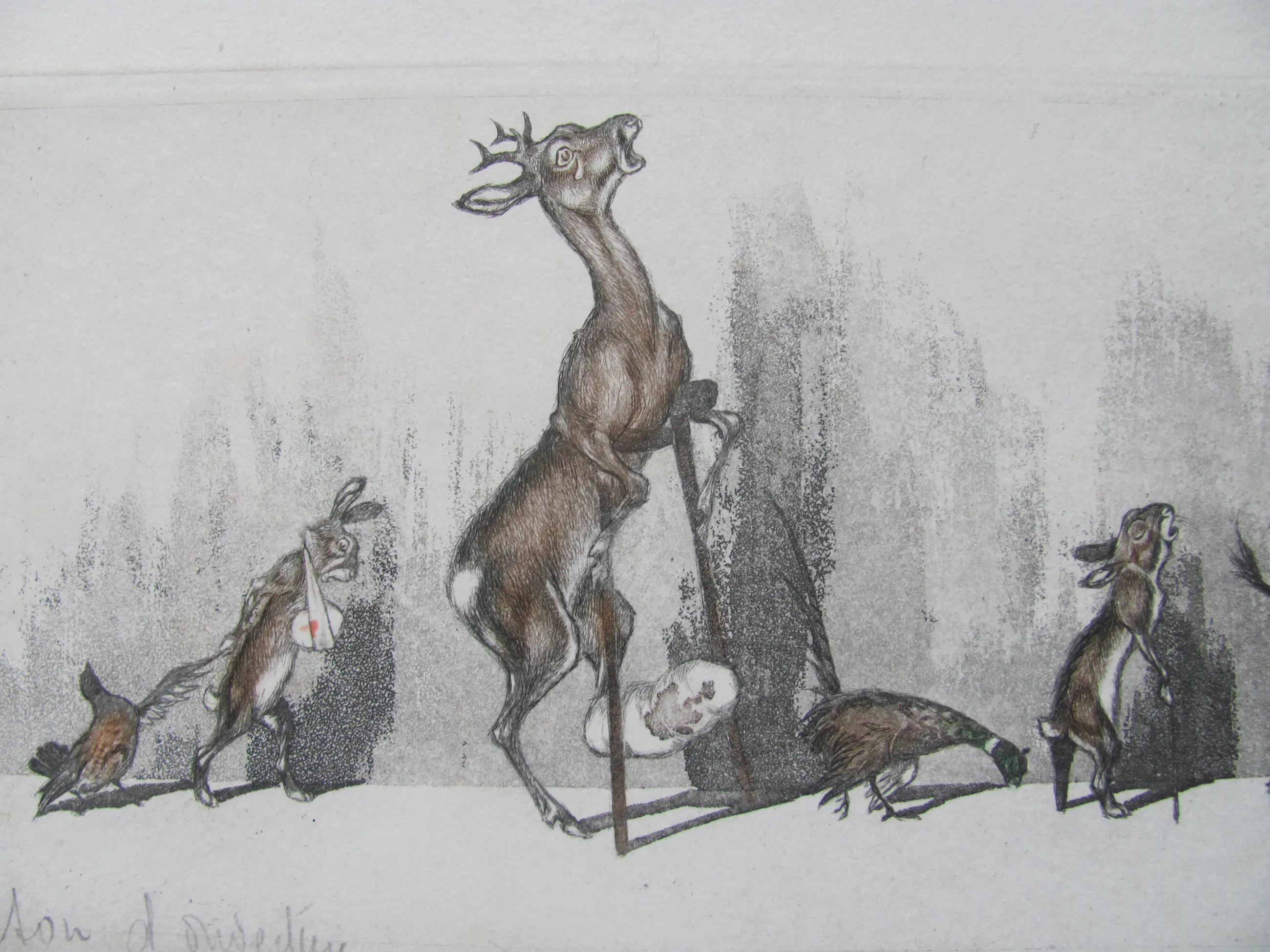 de voorstelling gaat over een optocht van een aantal aangeschoten dieren. Mogelijk een aanklacht tegen de dierenjacht?