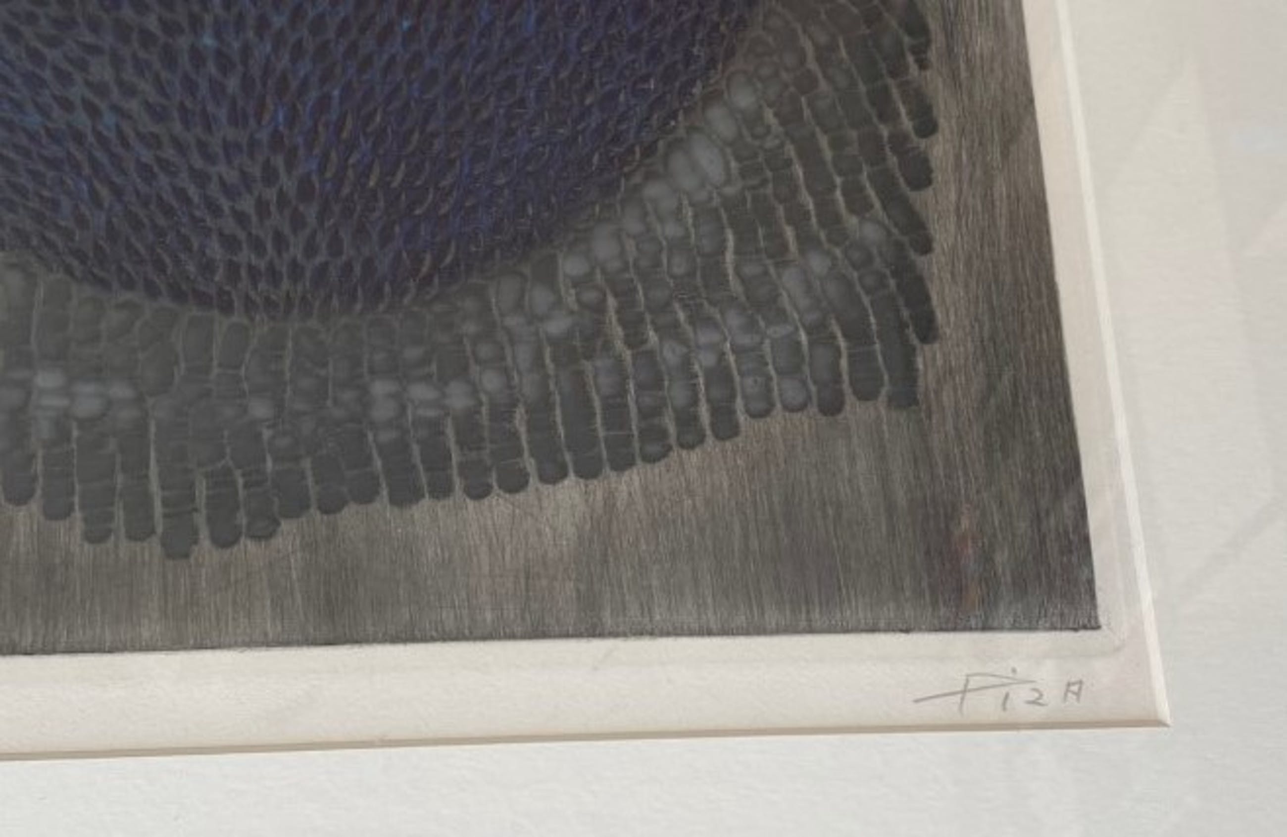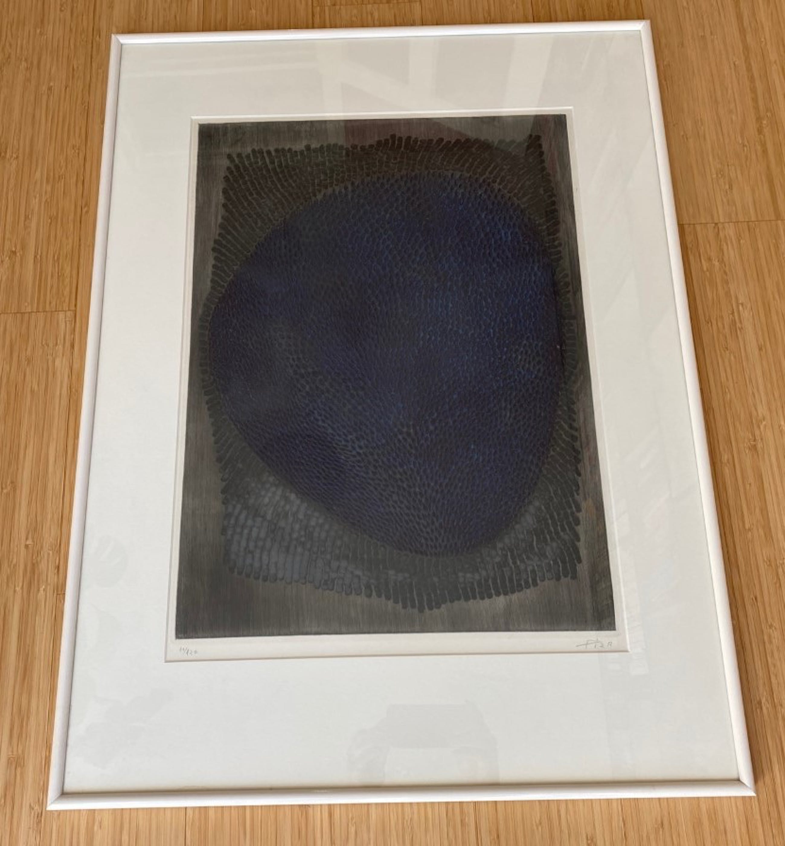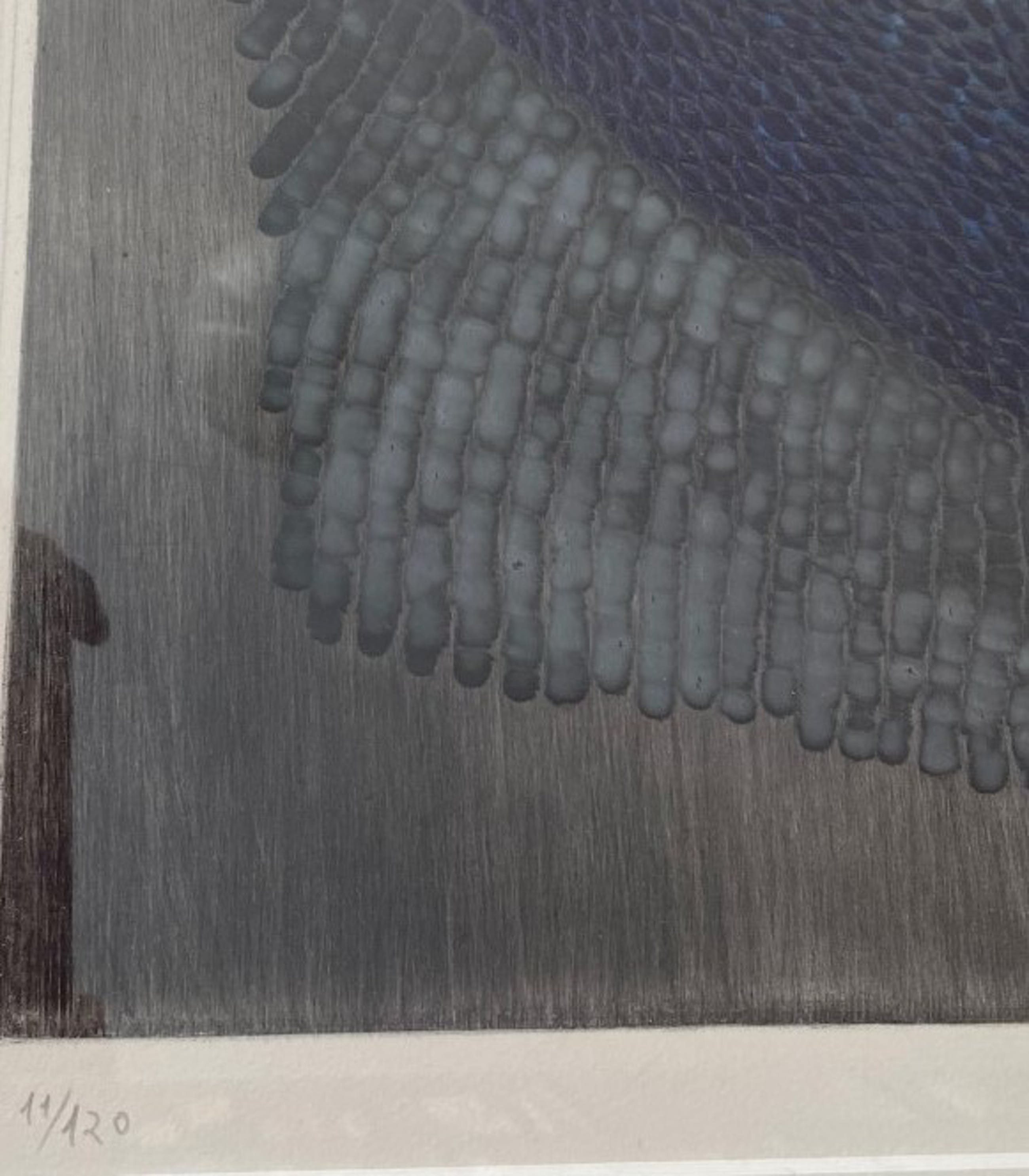 Het werk is gesigneerd en genummerd E/A. De ets is ingelijst in fraaie witte metalen lijst.