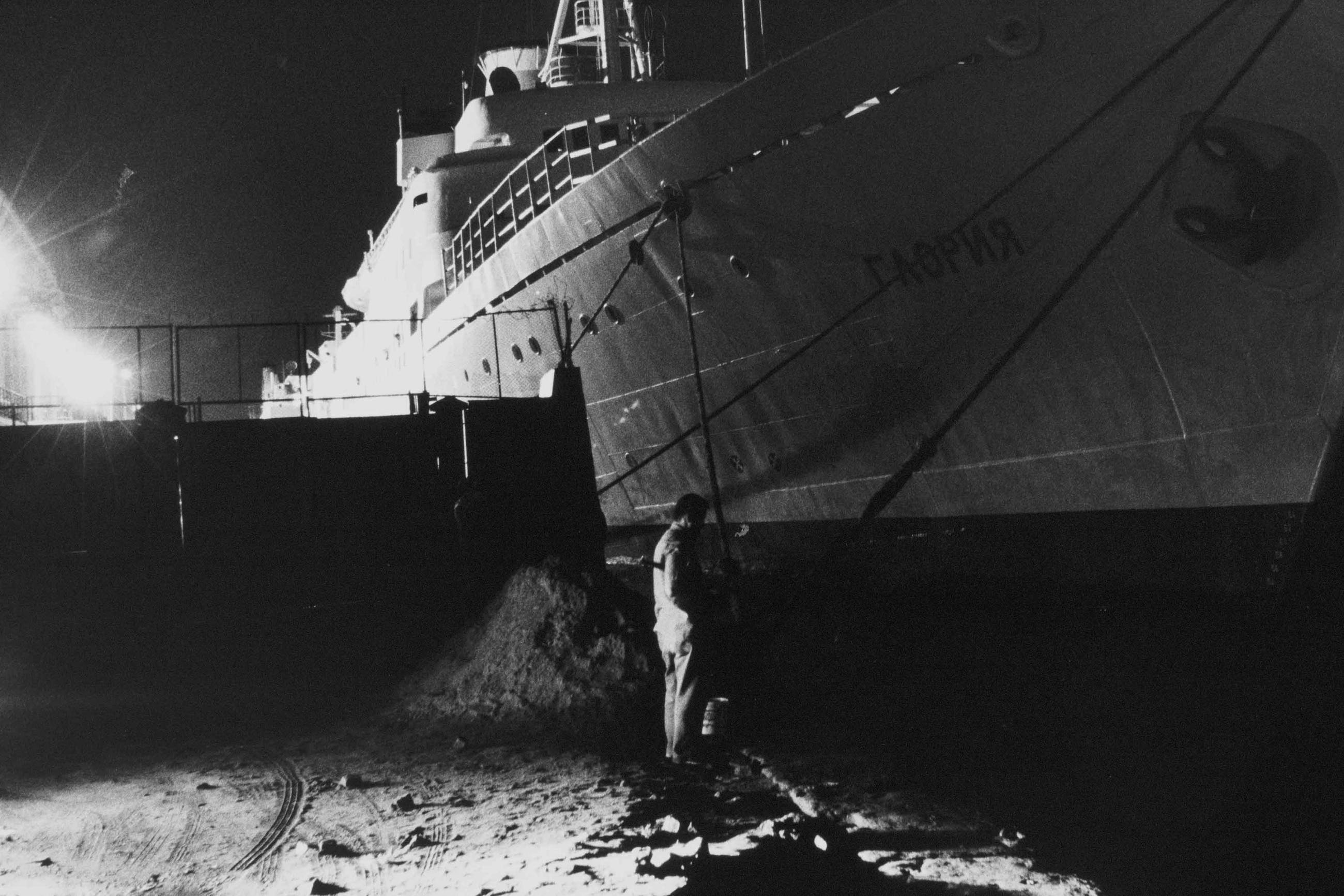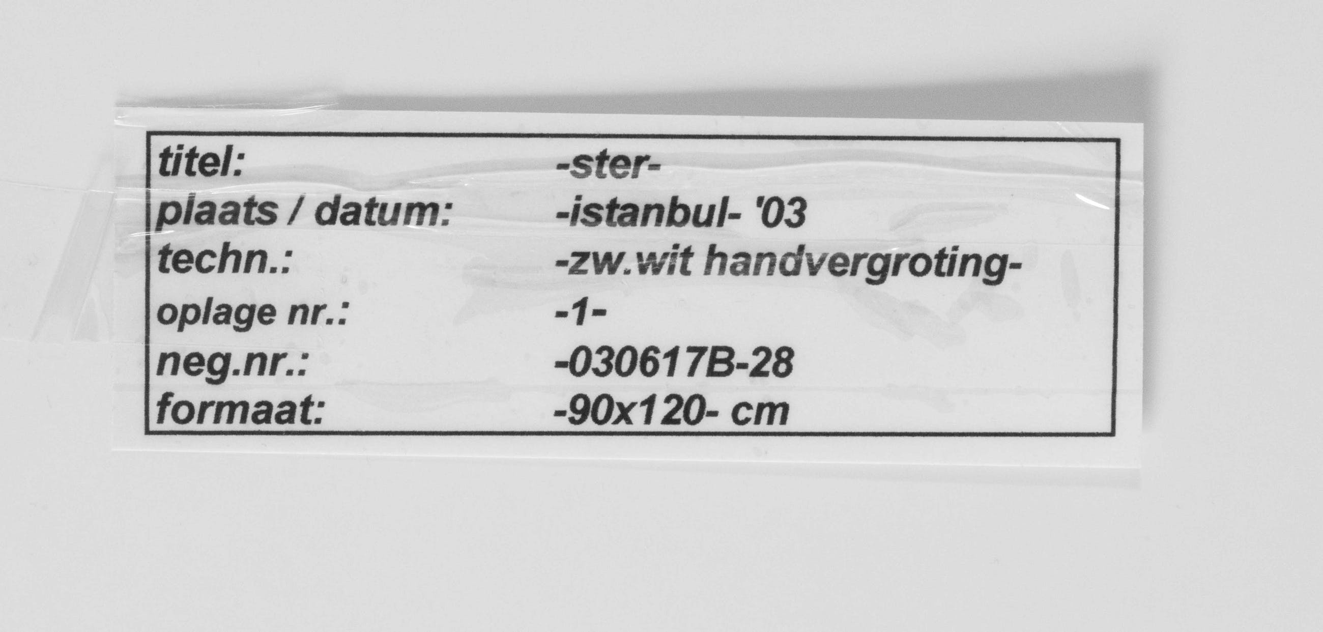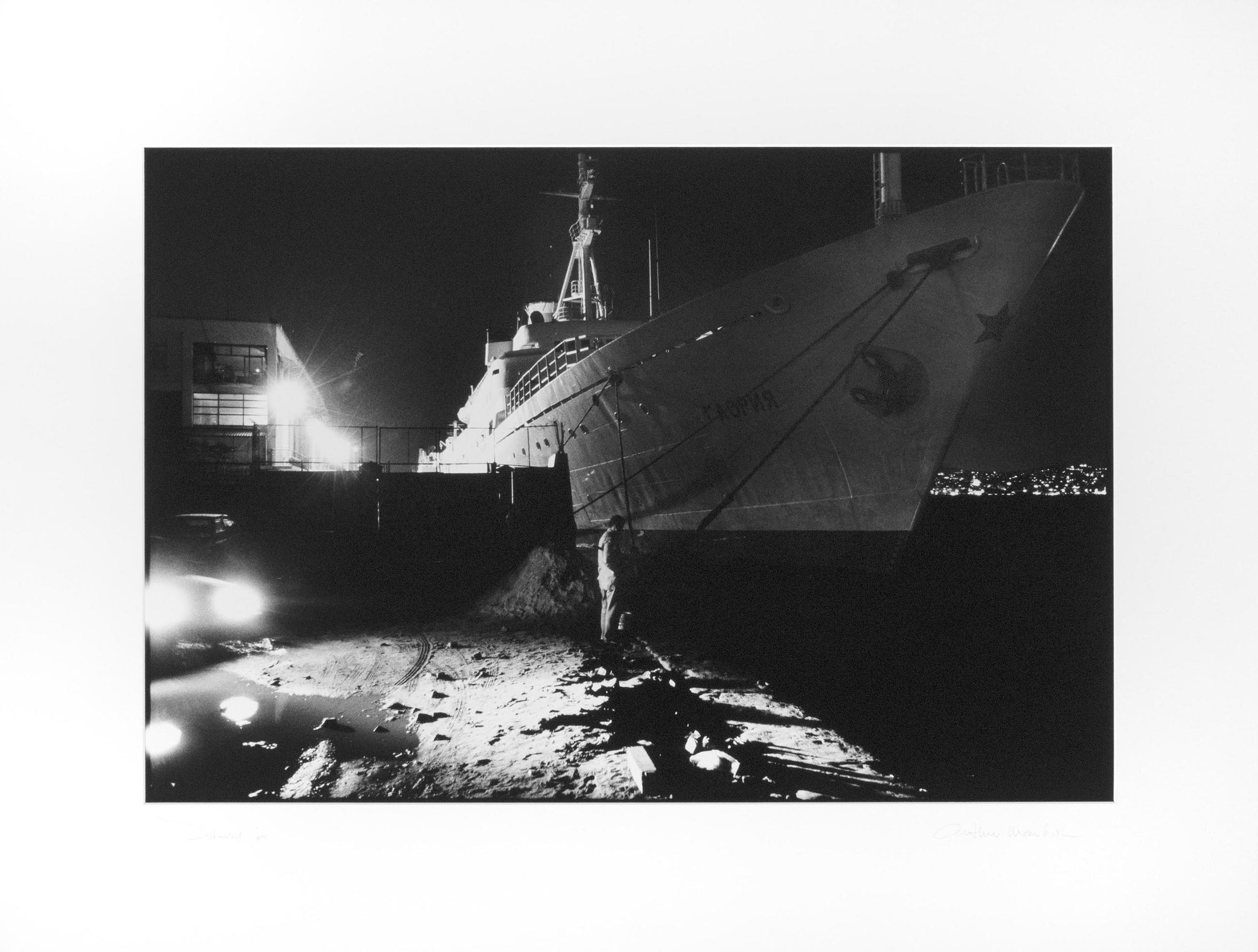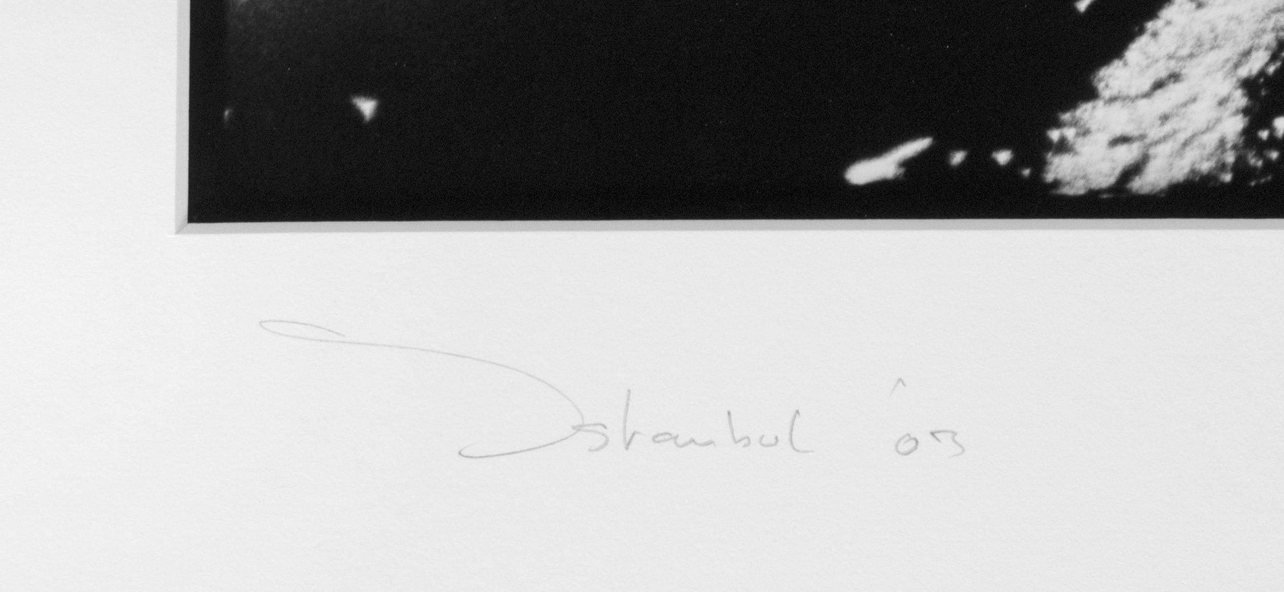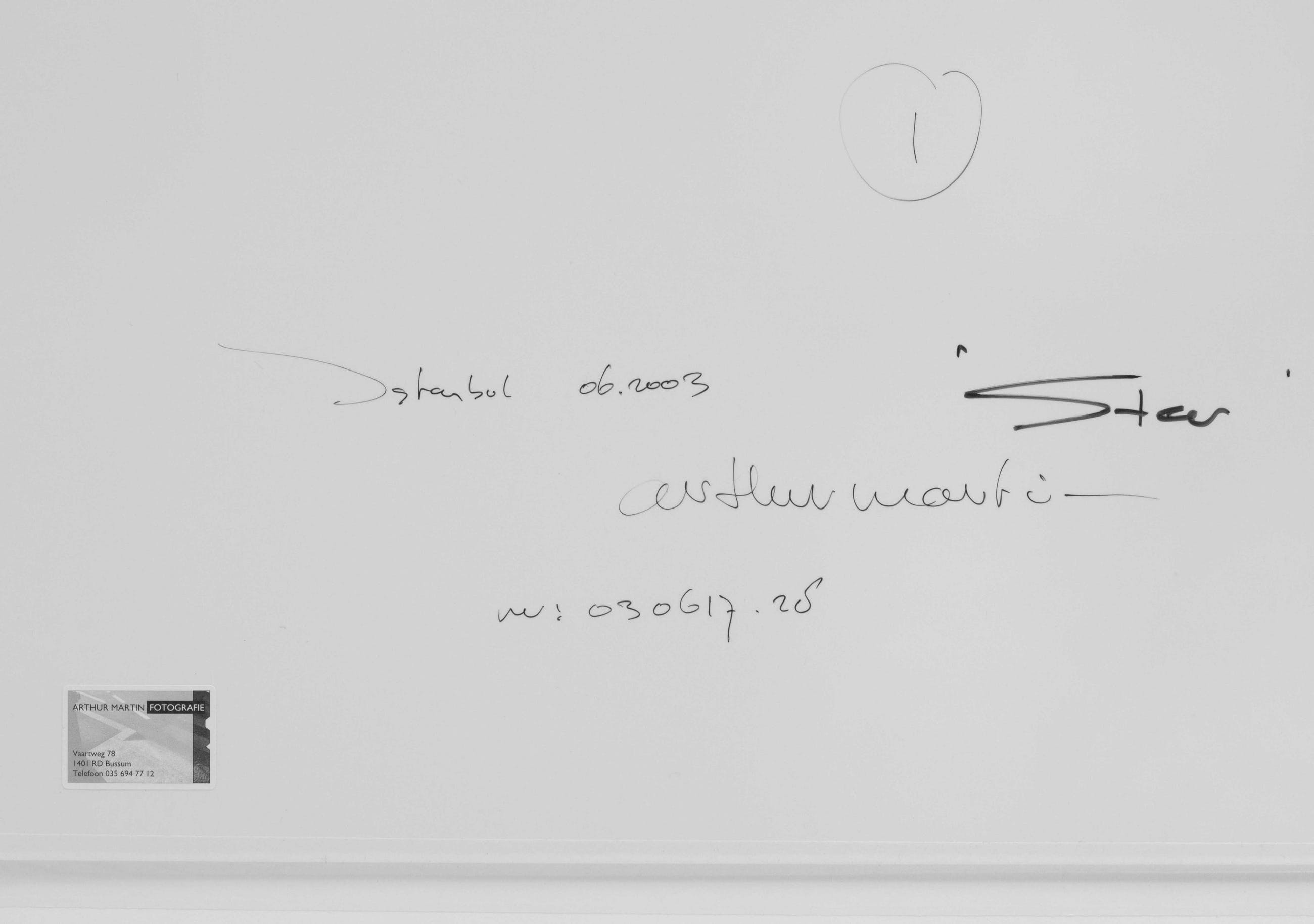 Tafereel : Kade met schip en persoon - links koplampen van auto. Titel : 'Ster' / Istanbul '06 Grootformaat zwartwit foto in passe-partout. Originele analoge afdruk, op passe-partout gesigneerd en op achterzijde foto voorzien van gegevens - ook op achterzijde foto hand-gesigneerd. De foto is opgeplakt op 2mm polystyreen en voorzien van passe-partout.
