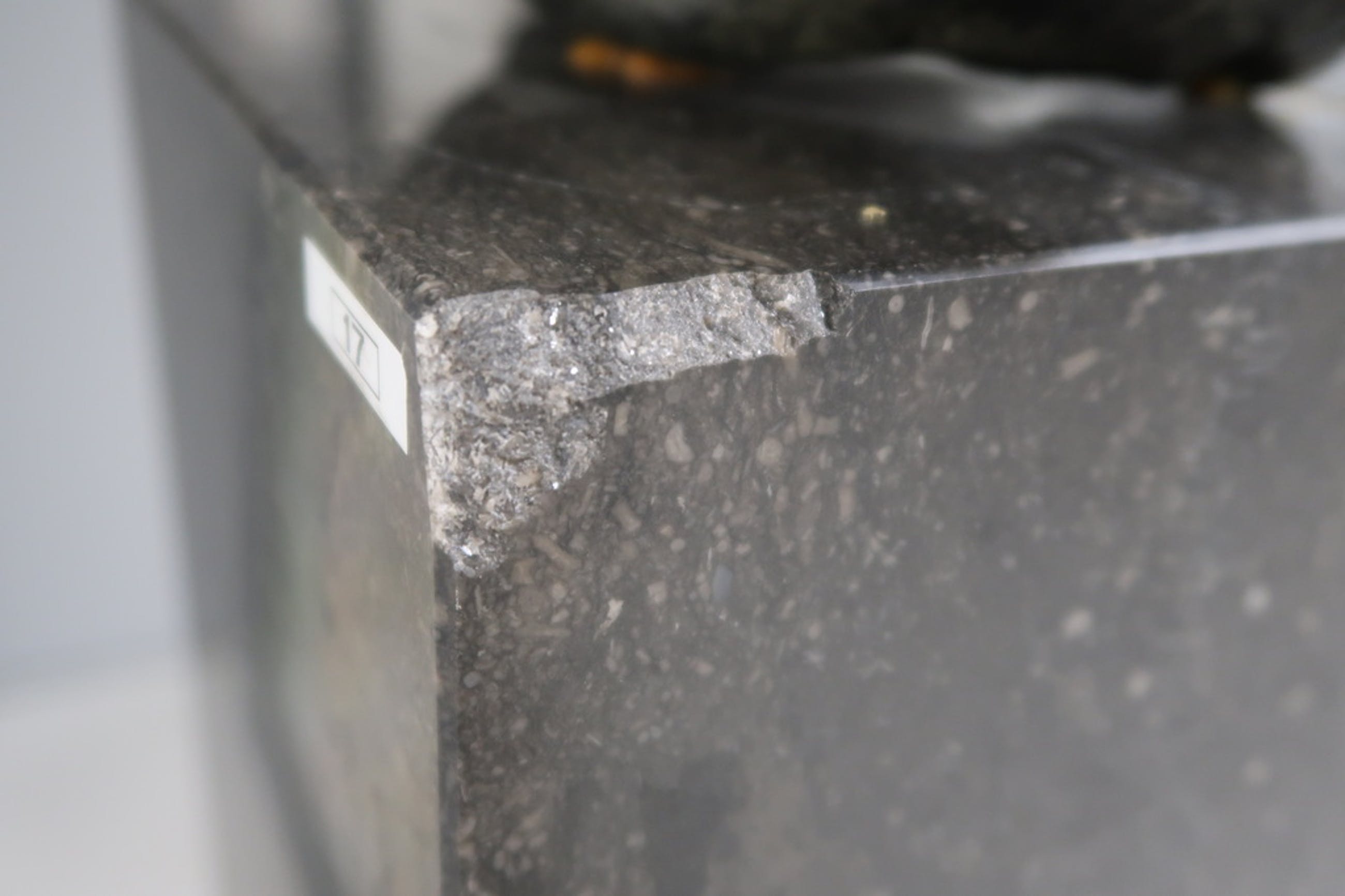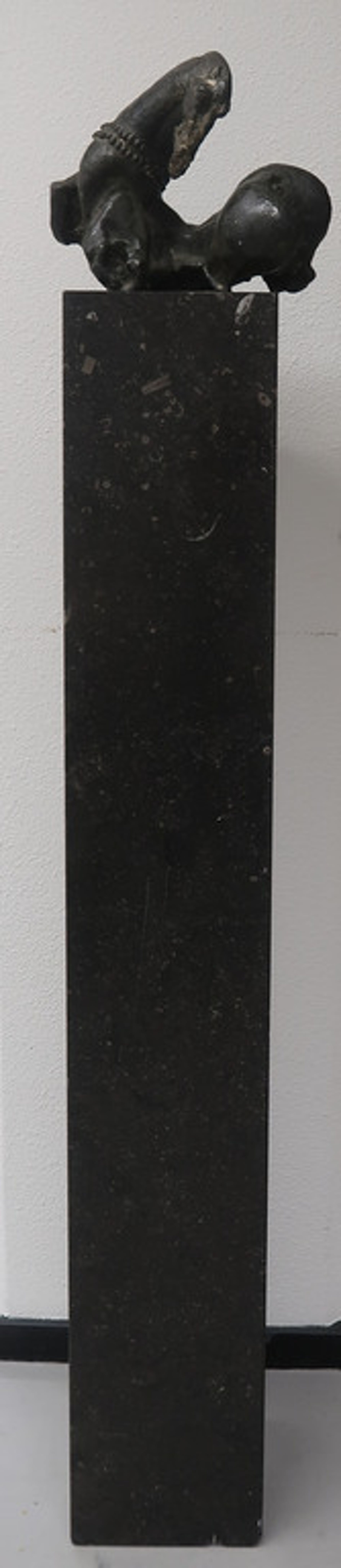 Conditie kunstwerk: Beeld in zeer goede staat (geen beschadigingen). Lijmresten te zien tussen het beeld en de sokkel. Van de sokkel is helaas een hoek beschadigd geraakt (zie foto)