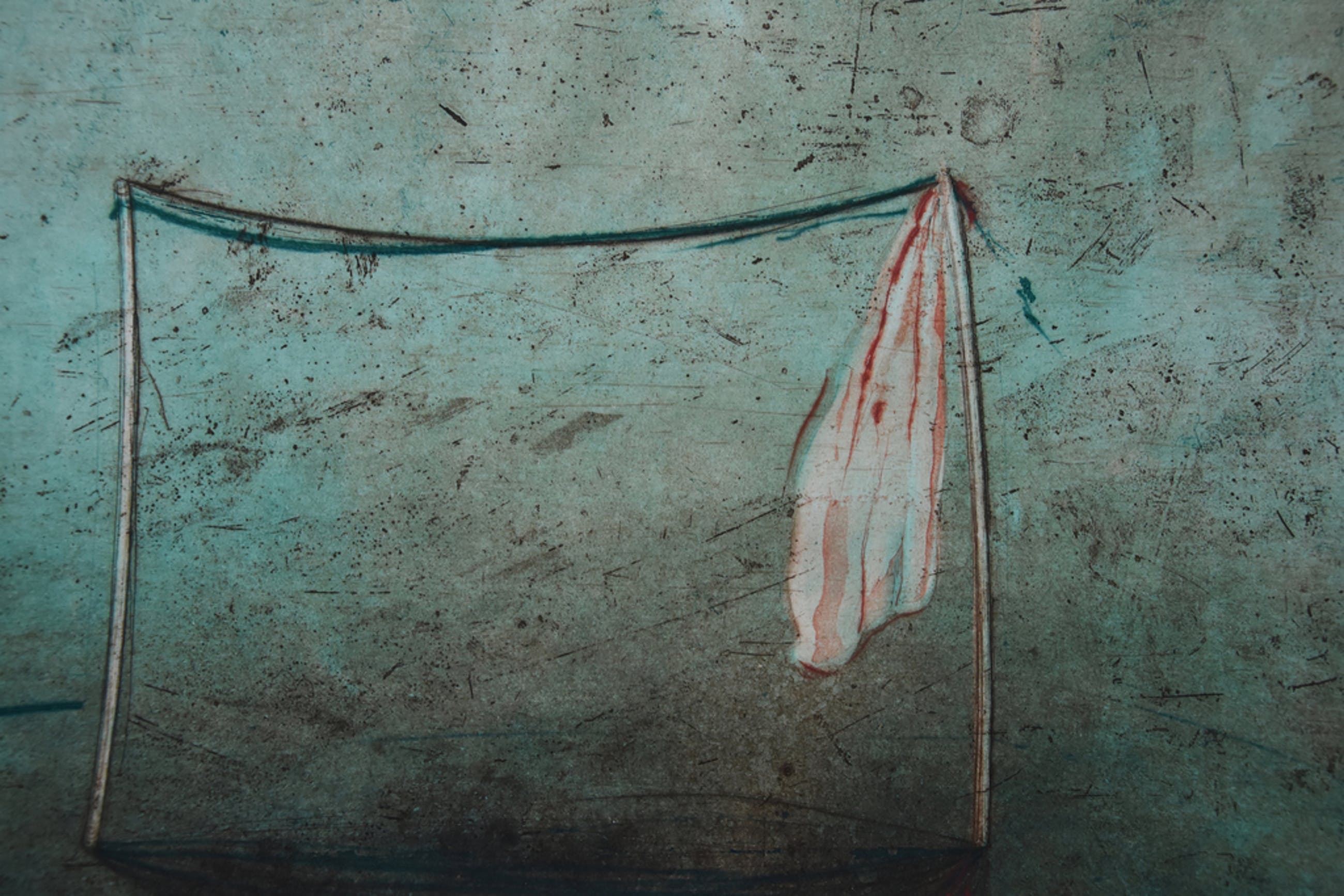Compositie door Arthur Stam (1953) waarbij de compositie gedomineerd wordt door een waslijn waar een laken aan hangt.