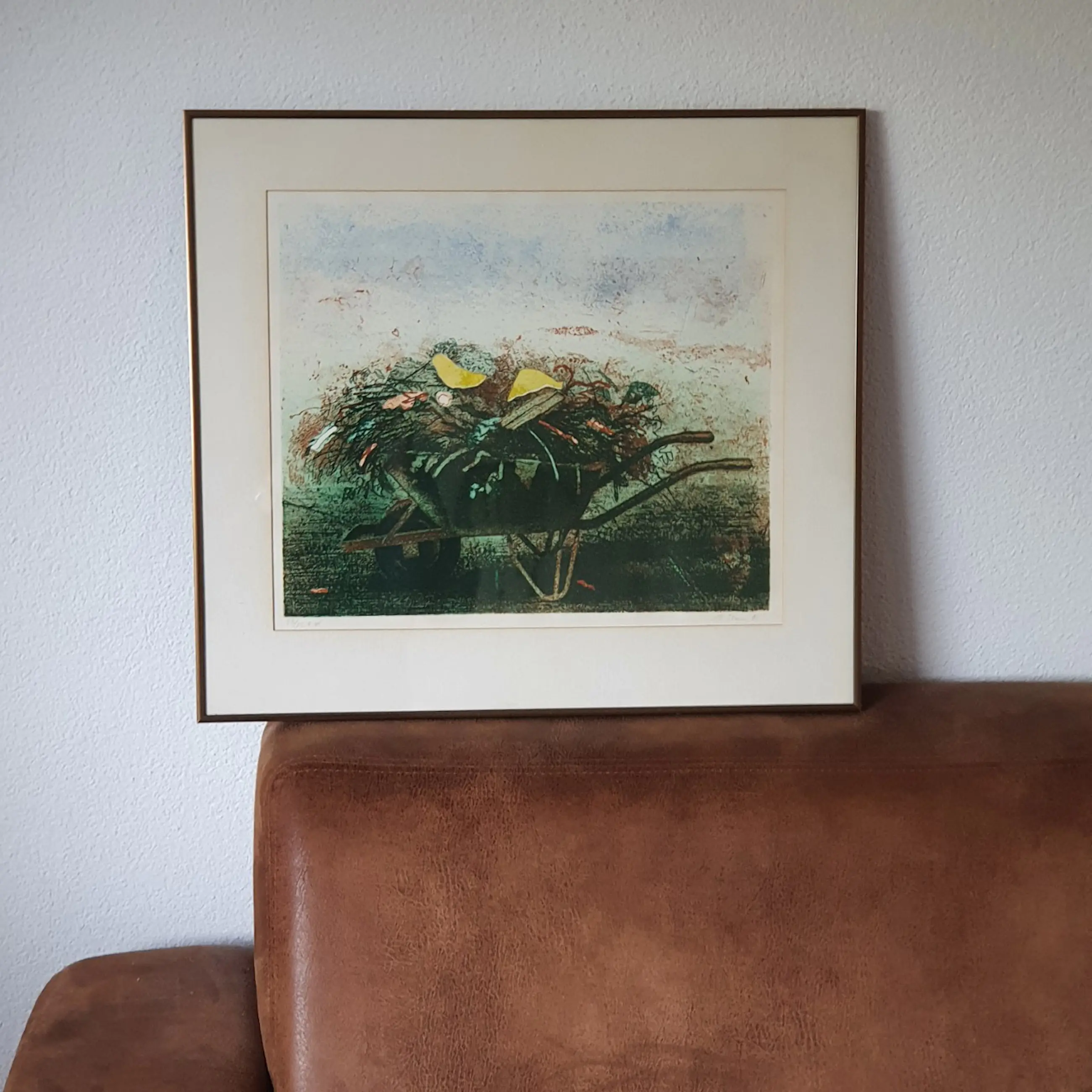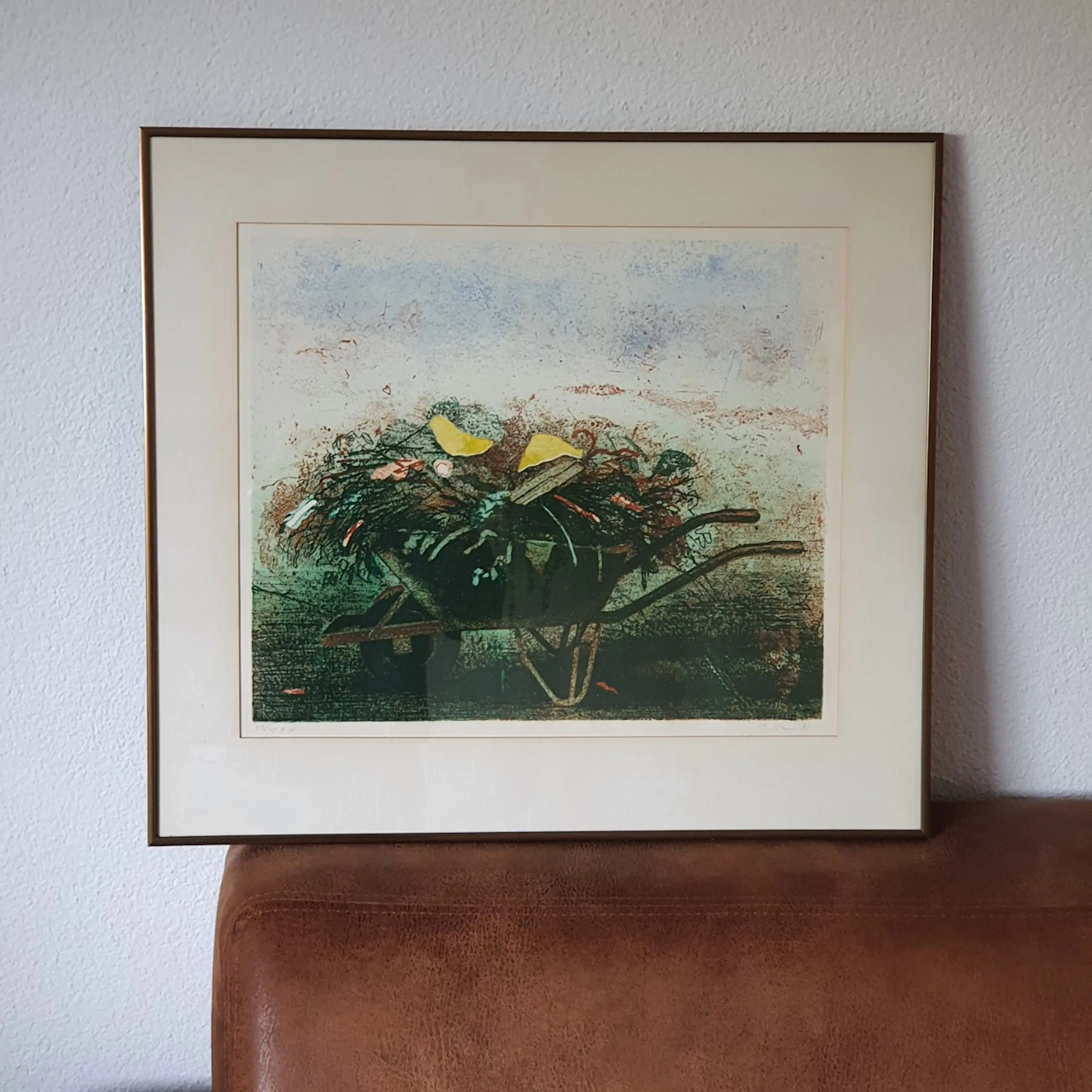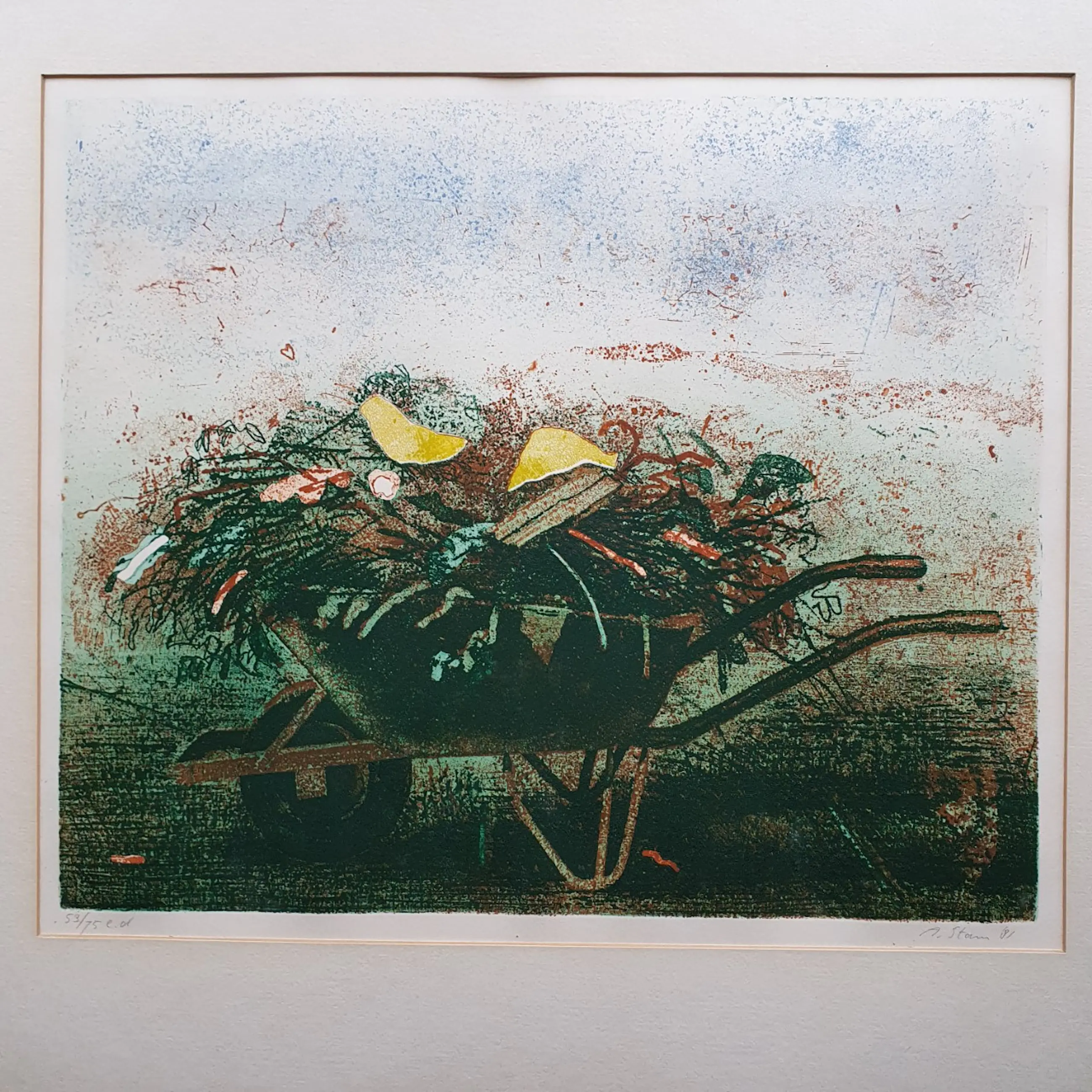 Hij maakt afbeeldingen van diverse onderwerpen , één daarvan is in en rondom de Volkstuin. Hierbij een afbeelding van een kruiwagen. Linksonder genummerd 53/75 en rechtsonder gesigneerd met potlood. De erste 7 foto's zijn gemaakt zonder lijst en glas, daarna met lijst en glas.