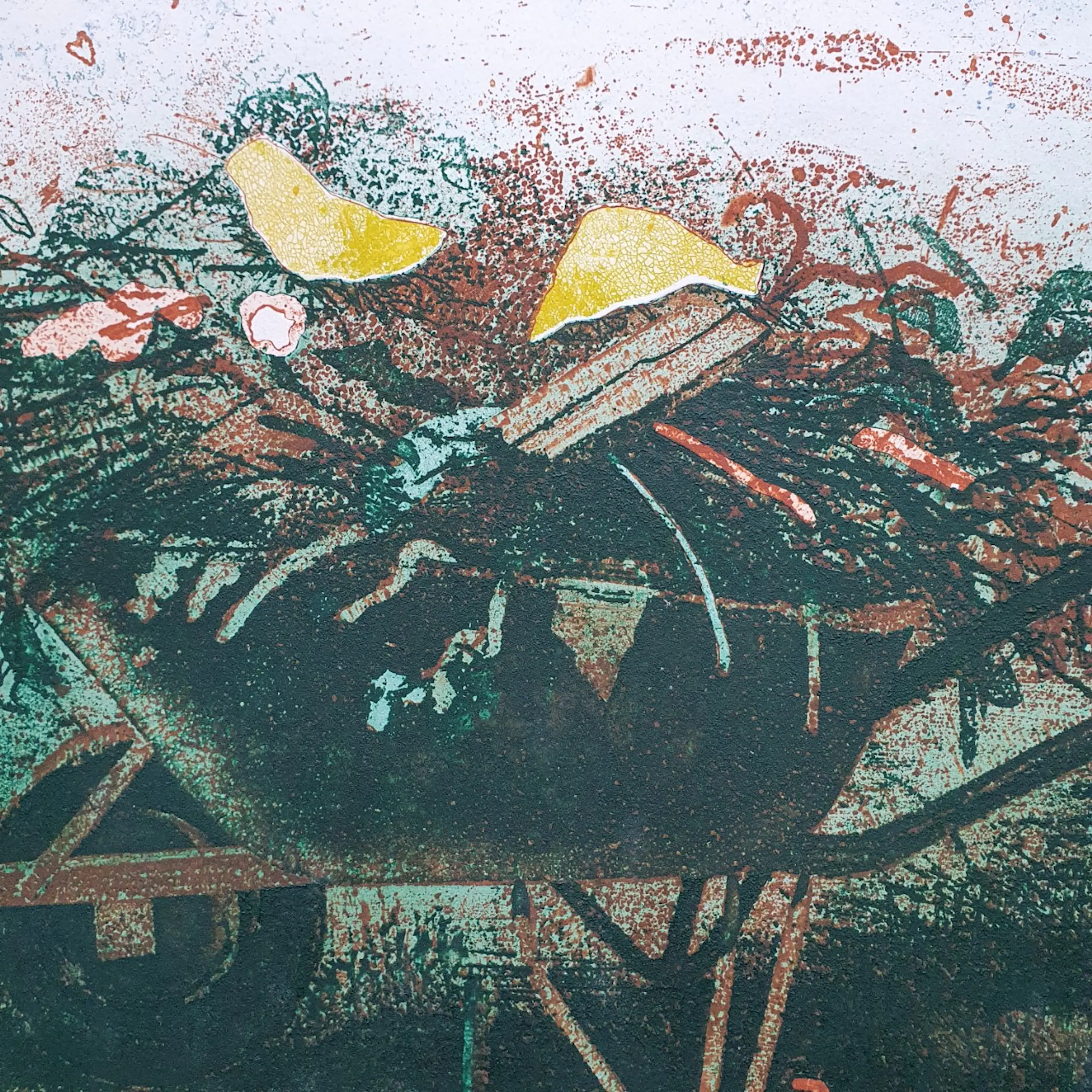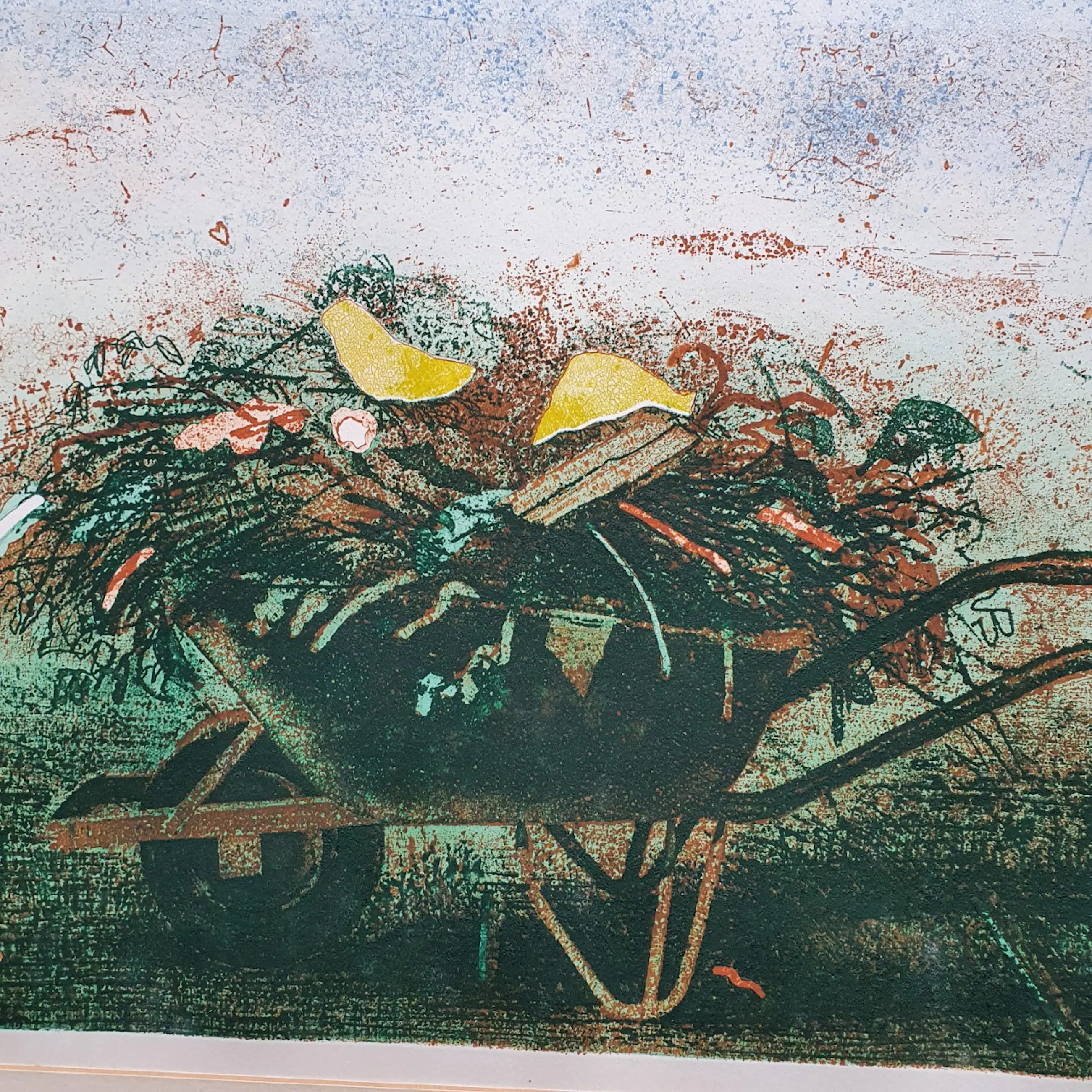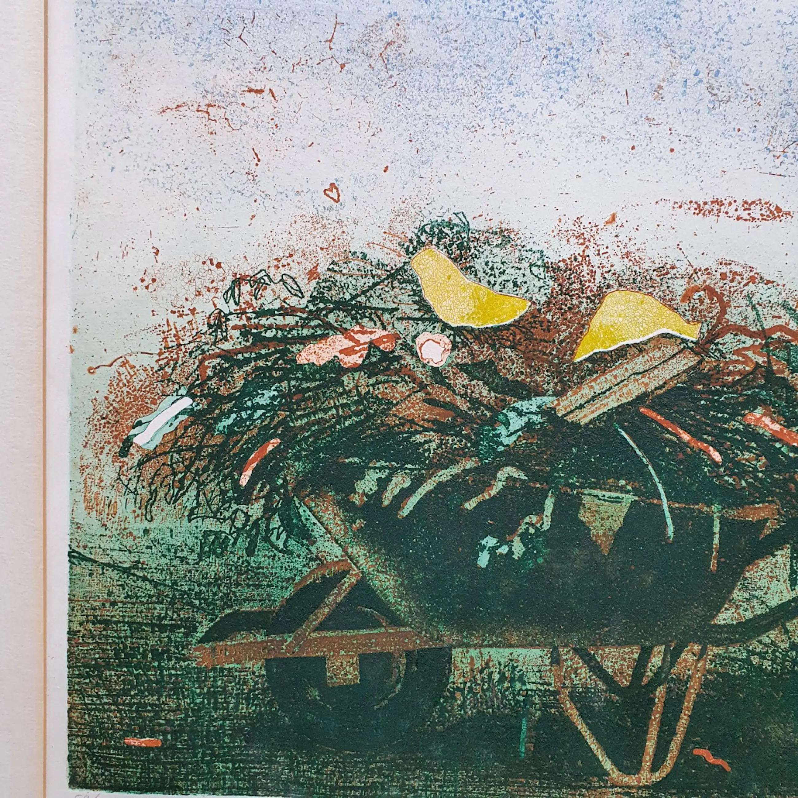 Hij maakt afbeeldingen van diverse onderwerpen , één daarvan is in en rondom de Volkstuin. Hierbij een afbeelding van een kruiwagen. Linksonder genummerd 53/75 en rechtsonder gesigneerd met potlood. De erste 7 foto's zijn gemaakt zonder lijst en glas, daarna met lijst en glas.
