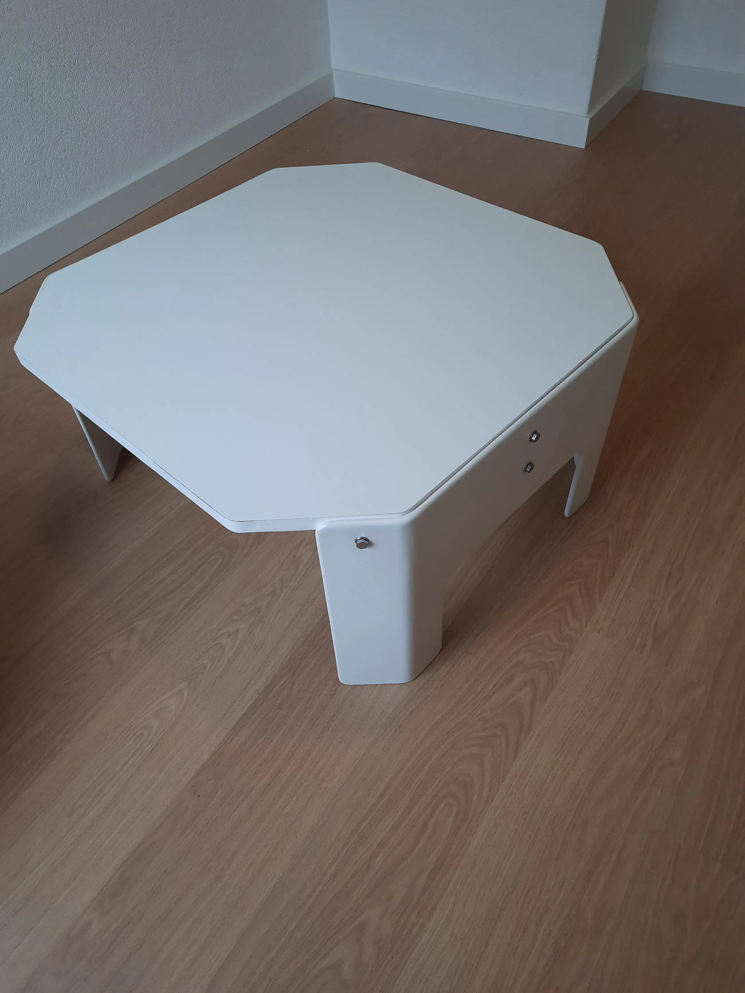 Het betreft een zeldzaam voorkomende salontafel, in 1966 ontworpen voor Artifort door de bekende ontwerper Kho Liang Ie, die destijds ook het interieur voor Schiphol heeft vorm gegeven. De witte, octagonale tafel meet 80x83x40 cm en is van hout/formica. D.m.v. acht zichtbare bouten is de tafel demontabel. Er zijn, conform de leeftijd, een paar kleine gebruikssporen: om drie bouten zit een licht craquele, op het blad zit een nauwelijks zichtbare kring. In het dagelijks gebruik is dit niet opvallend. Er is geen signatuur, maar uit onderstaande links blijkt onmiskenbaar dat het om betreffende tafel gaat: https://www.kholiangie.com/820-822 https://www.stedelijk.nl/nl/collectie/1173-kho-liang-ie-model-826
