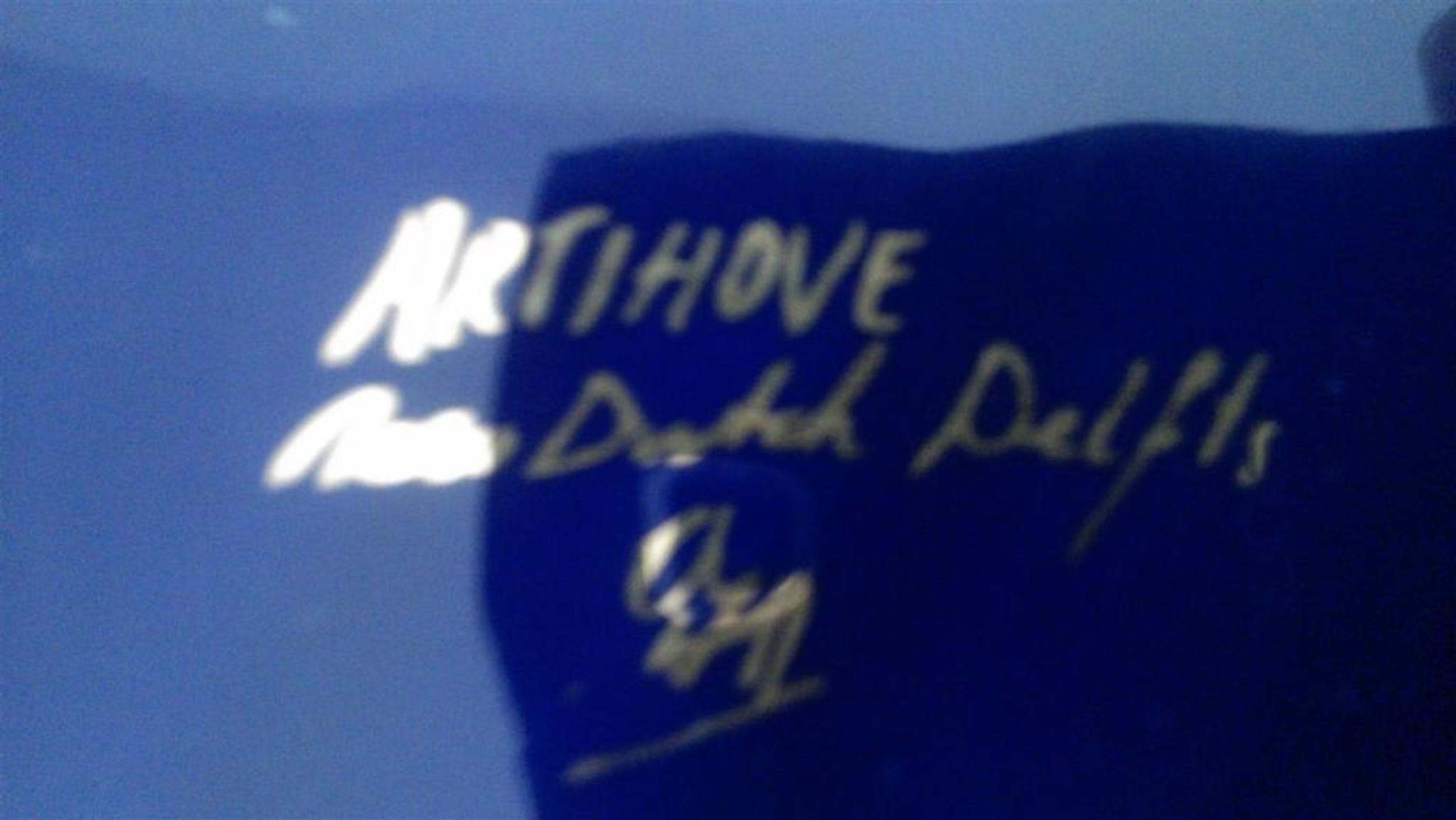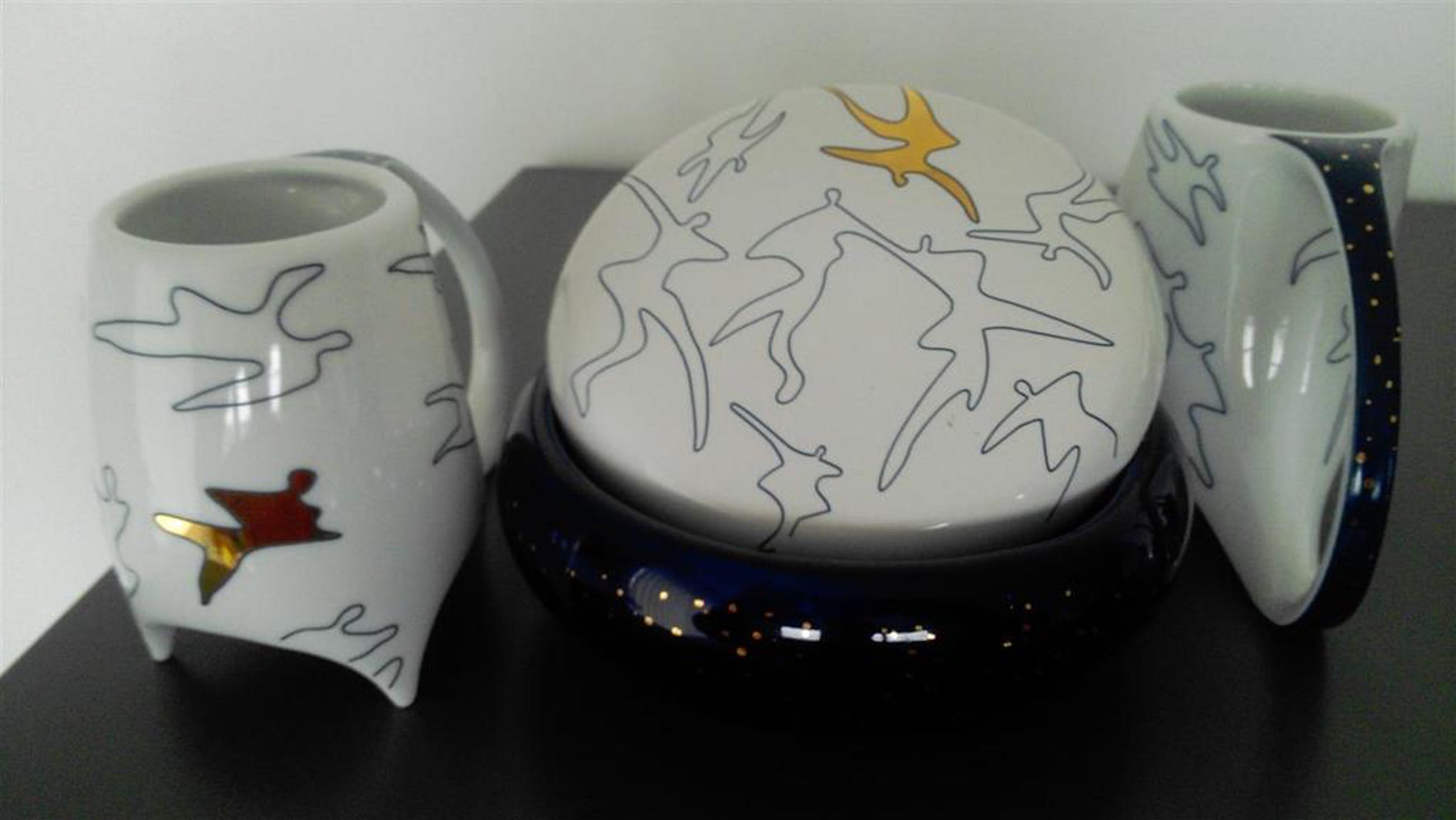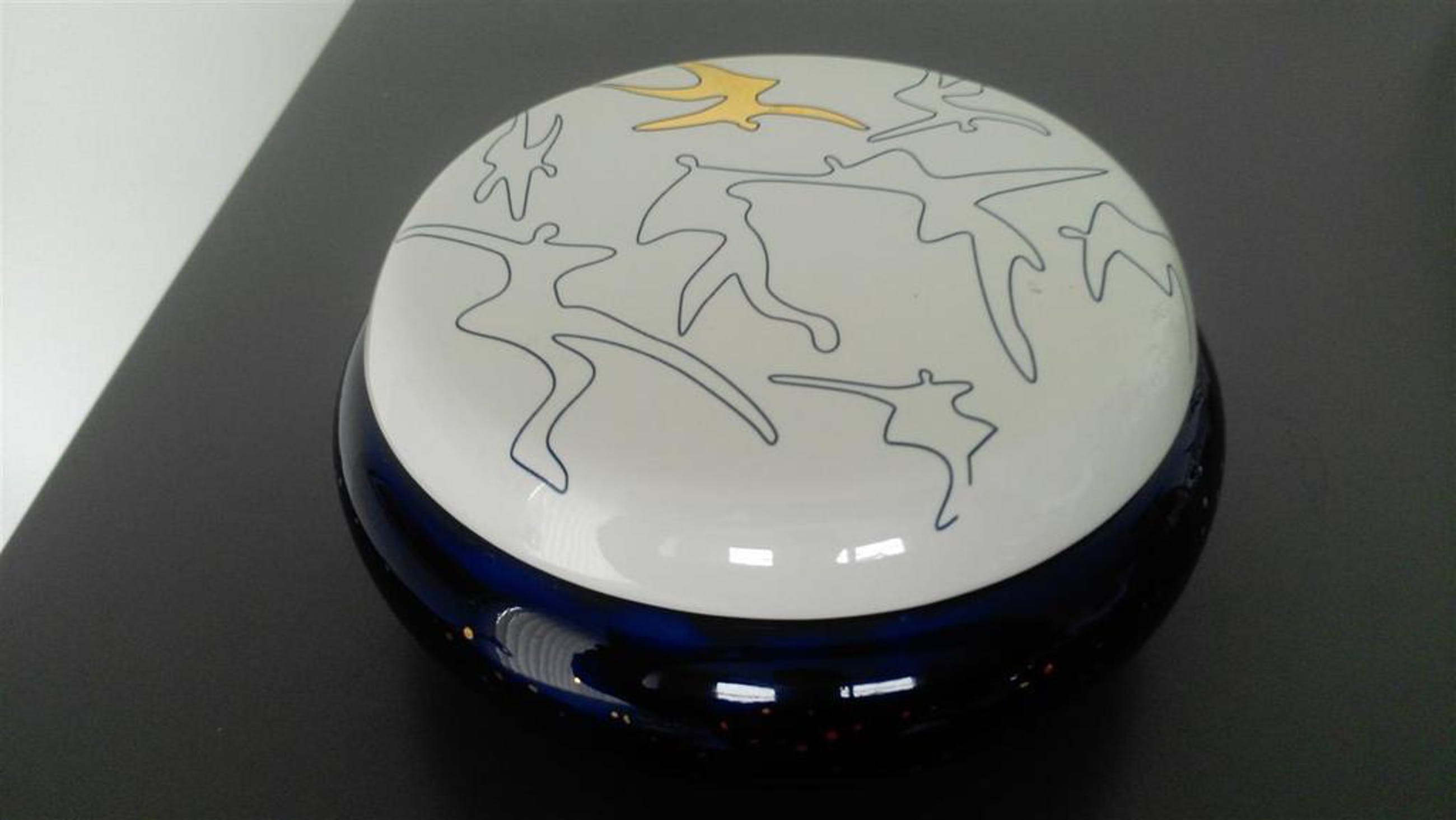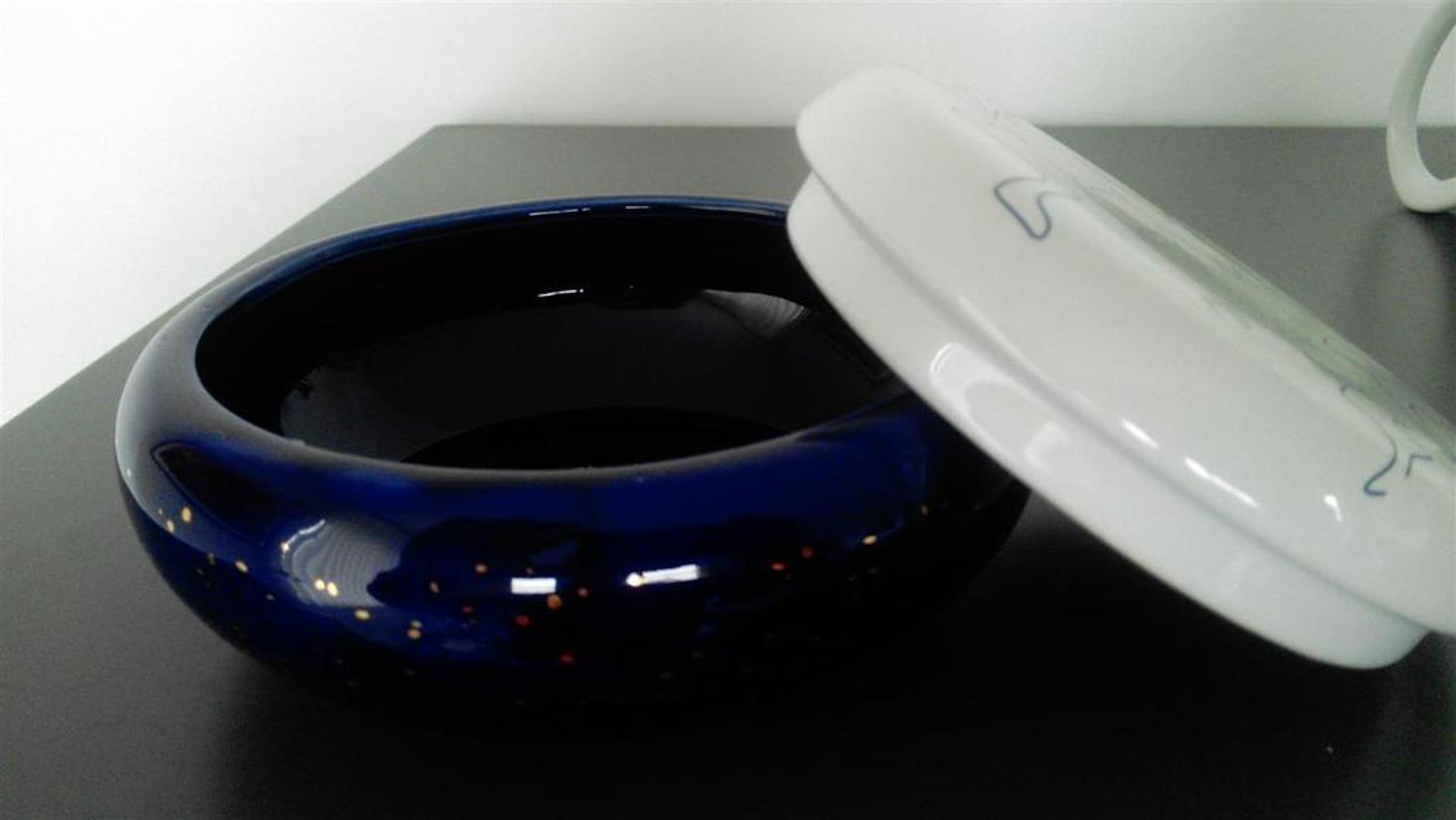 Artihove onder de kunstzinnige leiding van Corry Ammerlaan van Niekerk (CAN) new Dutch Delfts kobaltblauw met goudensterren en eigenzinnig uitgevoerde bekers met bonbonschaal met deksel Gesigneerd op onderzijde