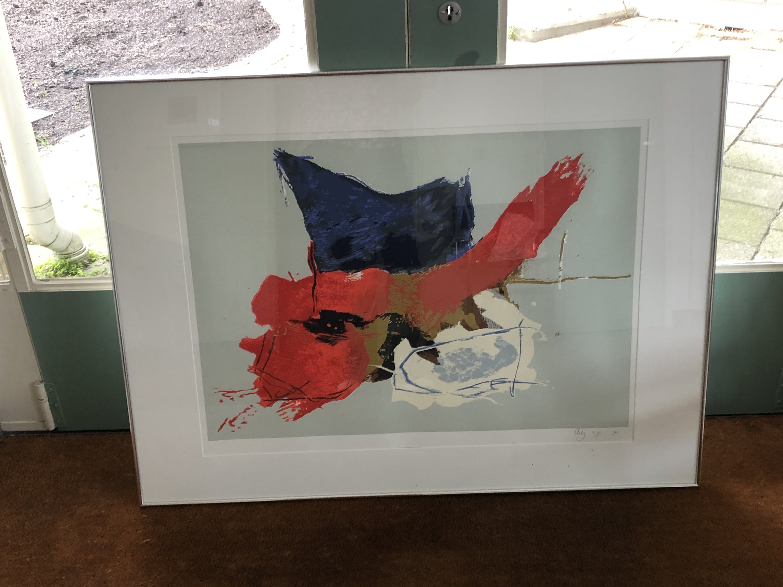 Vrij grote zeefdruk van Arty Grimm met glanzend zilver aluminium lijst. Het werk is in zeer goede staat en kan zonder lijst verstuurd worden in een koker via per aangetekende. Let op! U kunt de lijst en het passepartout er gratis bij krijgen als u het werk komt ophalen bij galerie Rotor in Gorcum of met een koerier laat bezorgen. Glasplaat moet nog even worden schoongemaakt. U kunt het werk komen beoordelen in onze schatkamer in Gorinchem.
