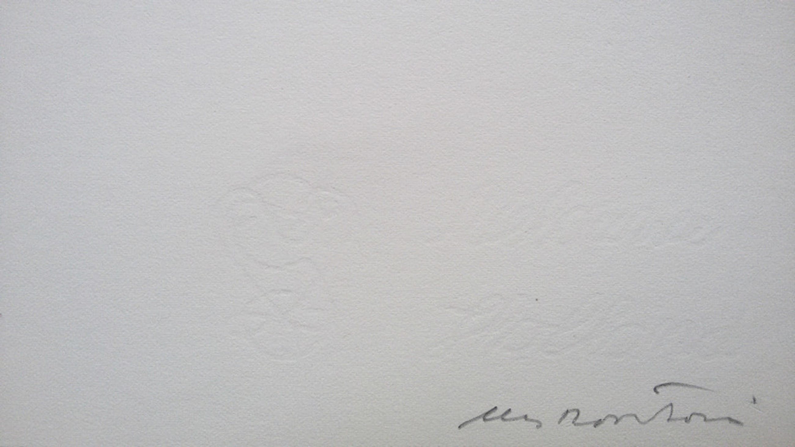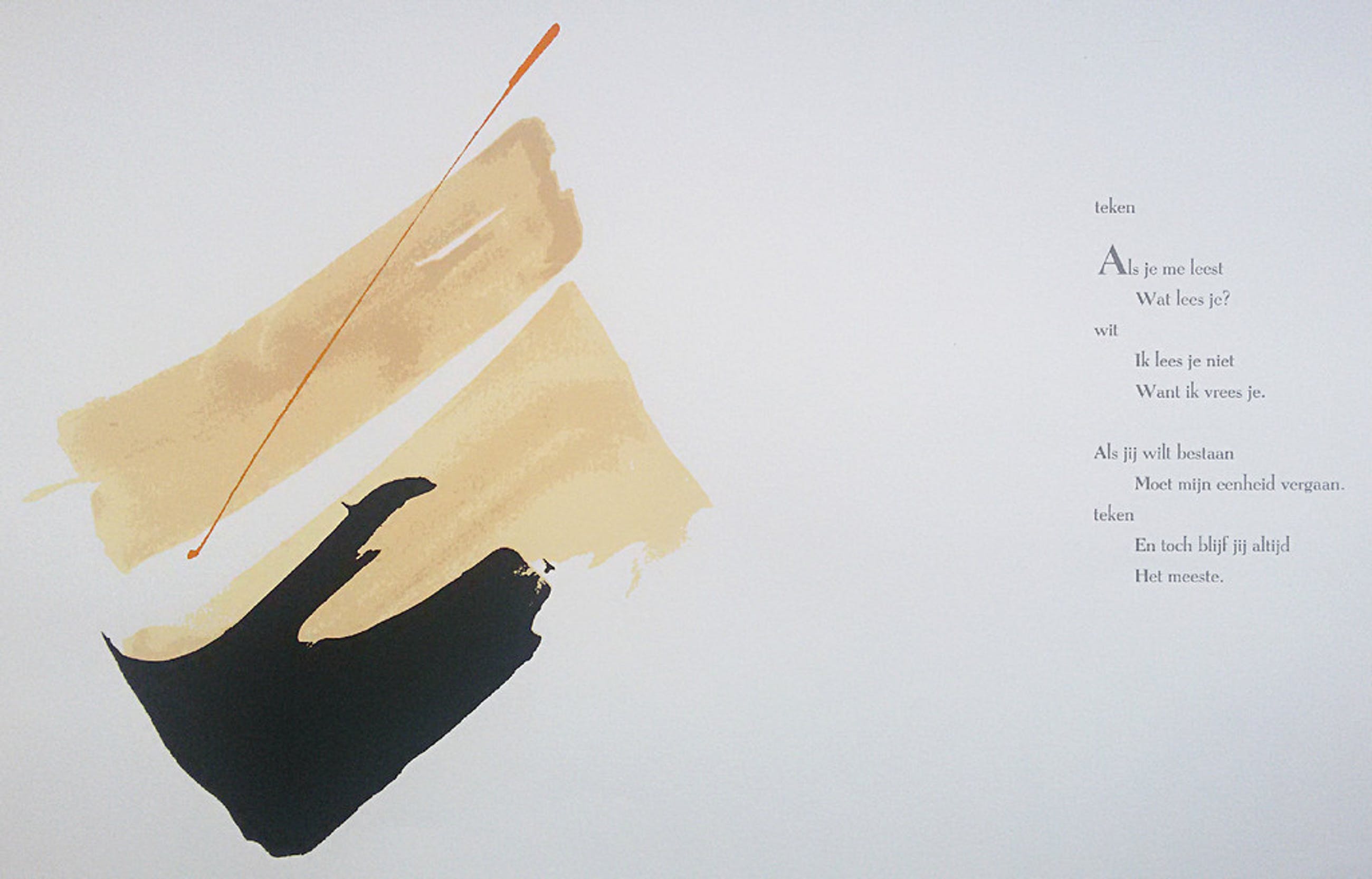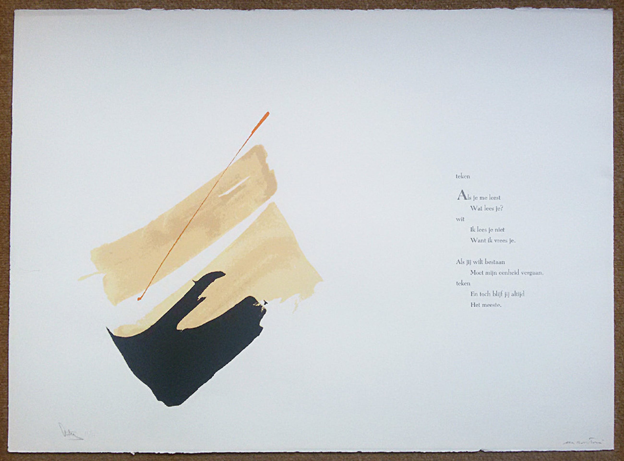 Zeer mooi werk van Arty Grimm, met gedicht van Cees Nooteboom, uit de serie “Tekens tegen het wit” uit 1985. Zeefdruk op dik handgeschept papier, met potlood gesigneerd door zowel Grimm (linksonder) als Nooteboom (rechtsonder), en genummerd (33/60). Afkomstig uit de kunstcollectie van ABNAMRO, in zeer goede conditie.