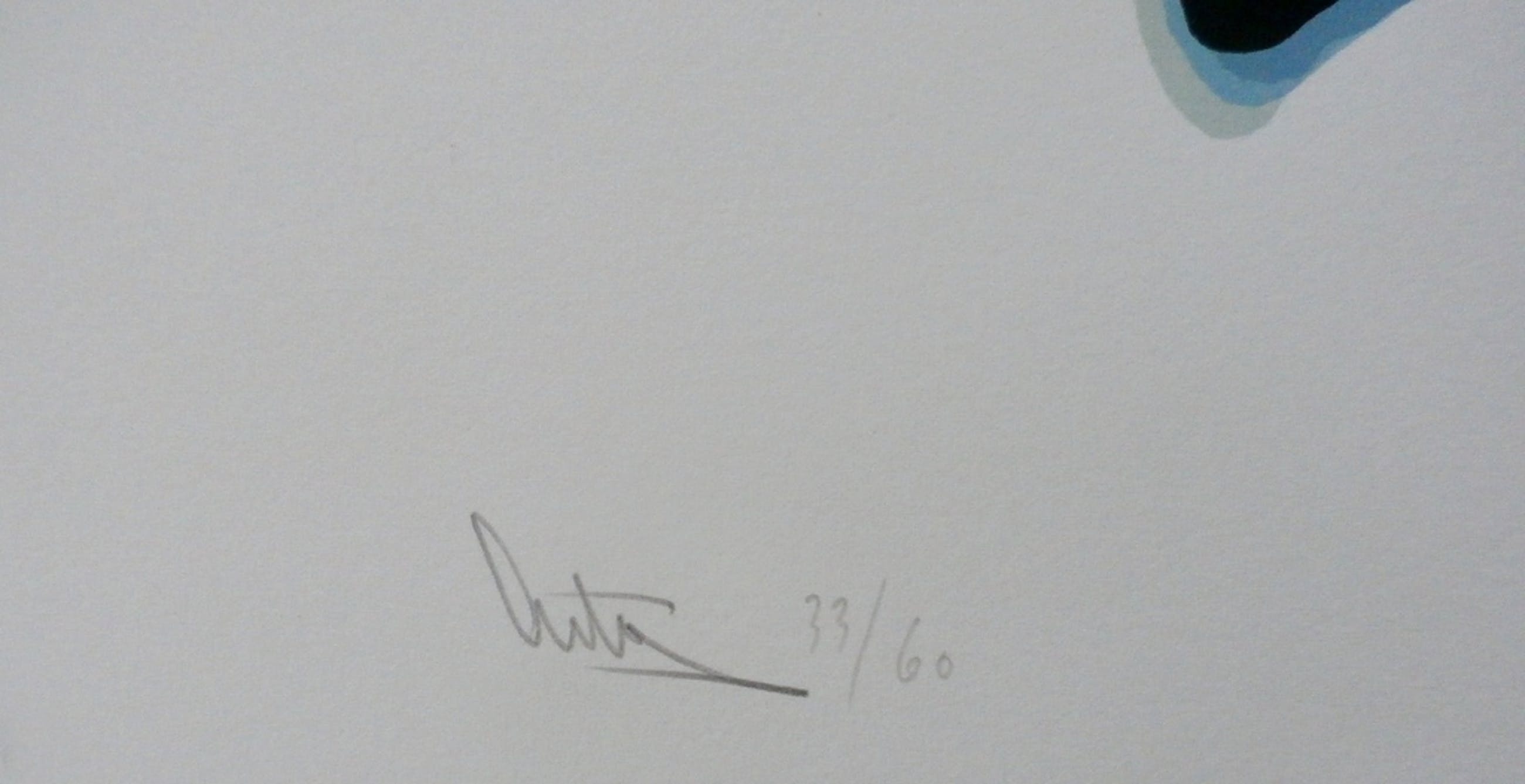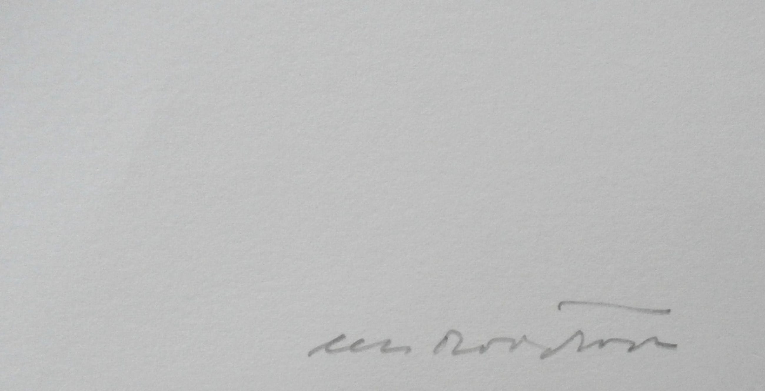 Zeer mooi werk van Arty Grimm, met gedicht van Cees Nooteboom, uit de serie “Tekens tegen het wit” uit 1985. Zeefdruk op dik handgeschept papier, met potlood gesigneerd door zowel Grimm (linksonder) als Nooteboom (rechtsonder), en genummerd (33/60). Afkomstig uit de kunstcollectie van ABNAMRO, in zeer goede conditie. Afmetingen blad: H56 x b75,5 cm.
