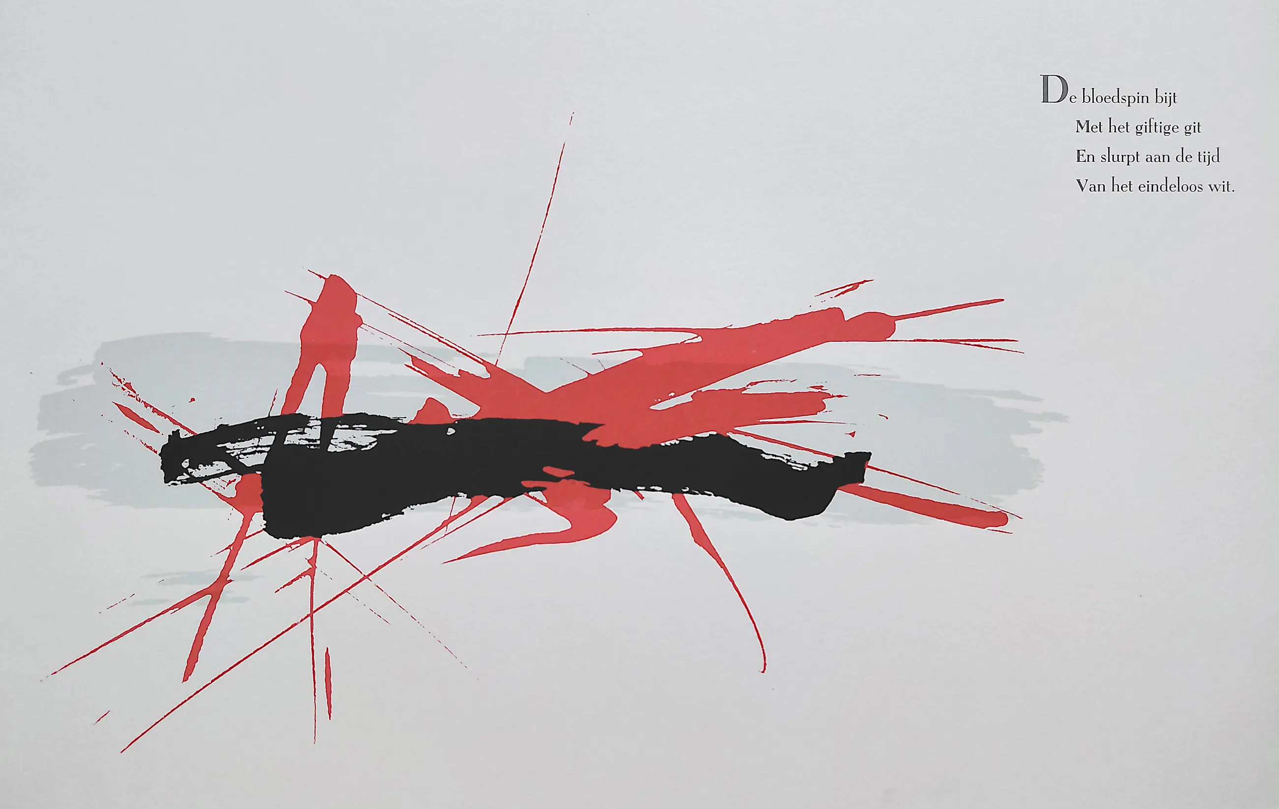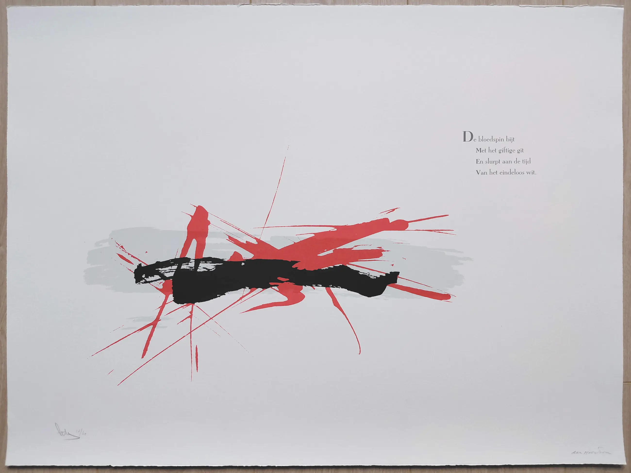 Zeer mooie compositie van Arty Grimm bij tekst van Cees Nooteboom, uit de serie “Tekens tegen het wit” uit 1985. Zeefdruk op 250 grams Van Gelder Velouwe papier, met potlood gesigneerd door zowel Grimm (linksonder) als Nooteboom (rechtsonder) en genummerd (28/60). In mint conditie, altijd in originele cassette bewaard gebleven. (Cassette is op moment van schrijven nog compleet)