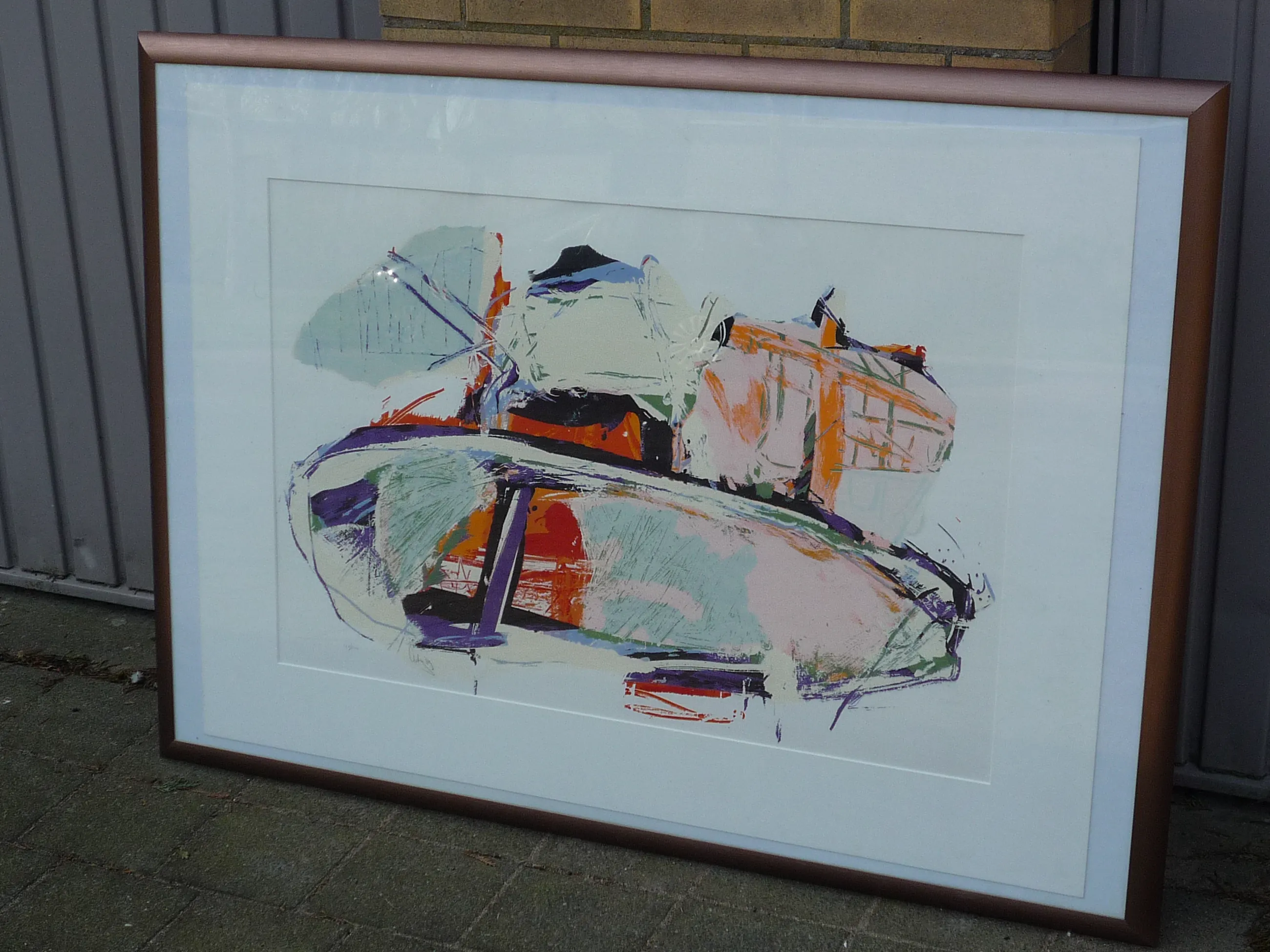 Abstracte zeefdruk door Arty Gimm. Beeldmaat 88 cm breed en 58 cm hoog. Passe-partout maat 110 cm breed en 80 cm hoog, lijstmaat 125 cm breed en 90 cm hoog.
