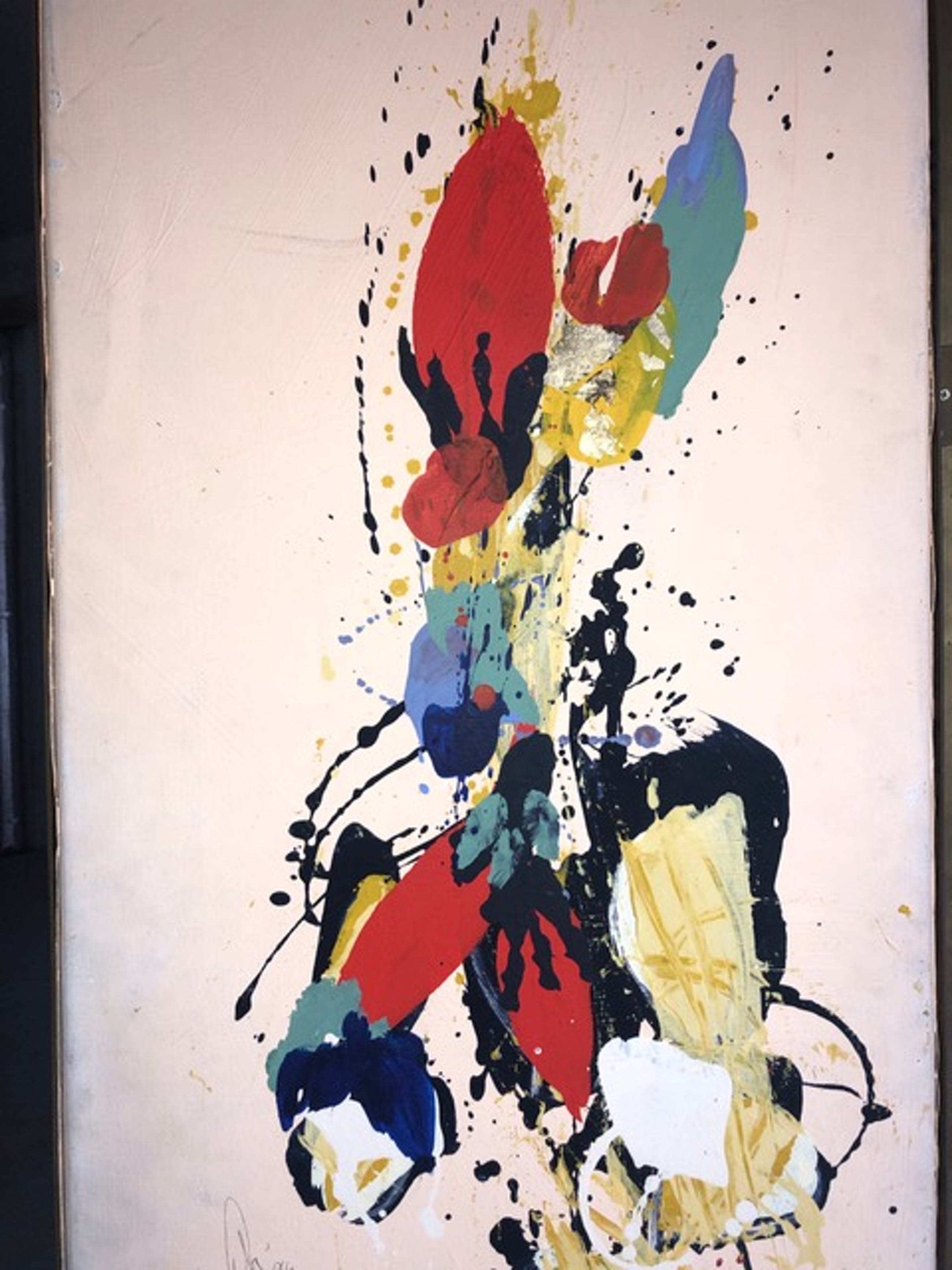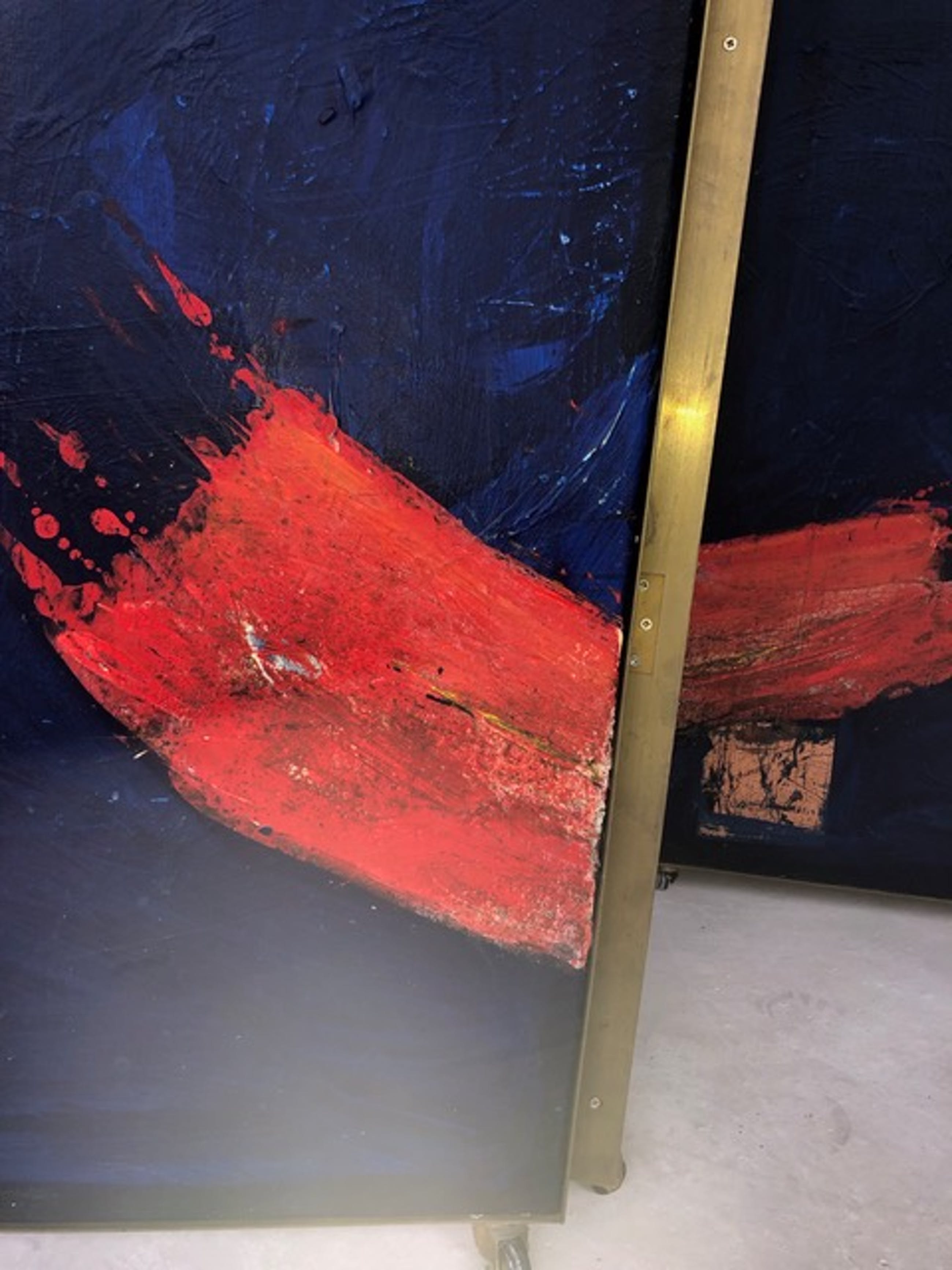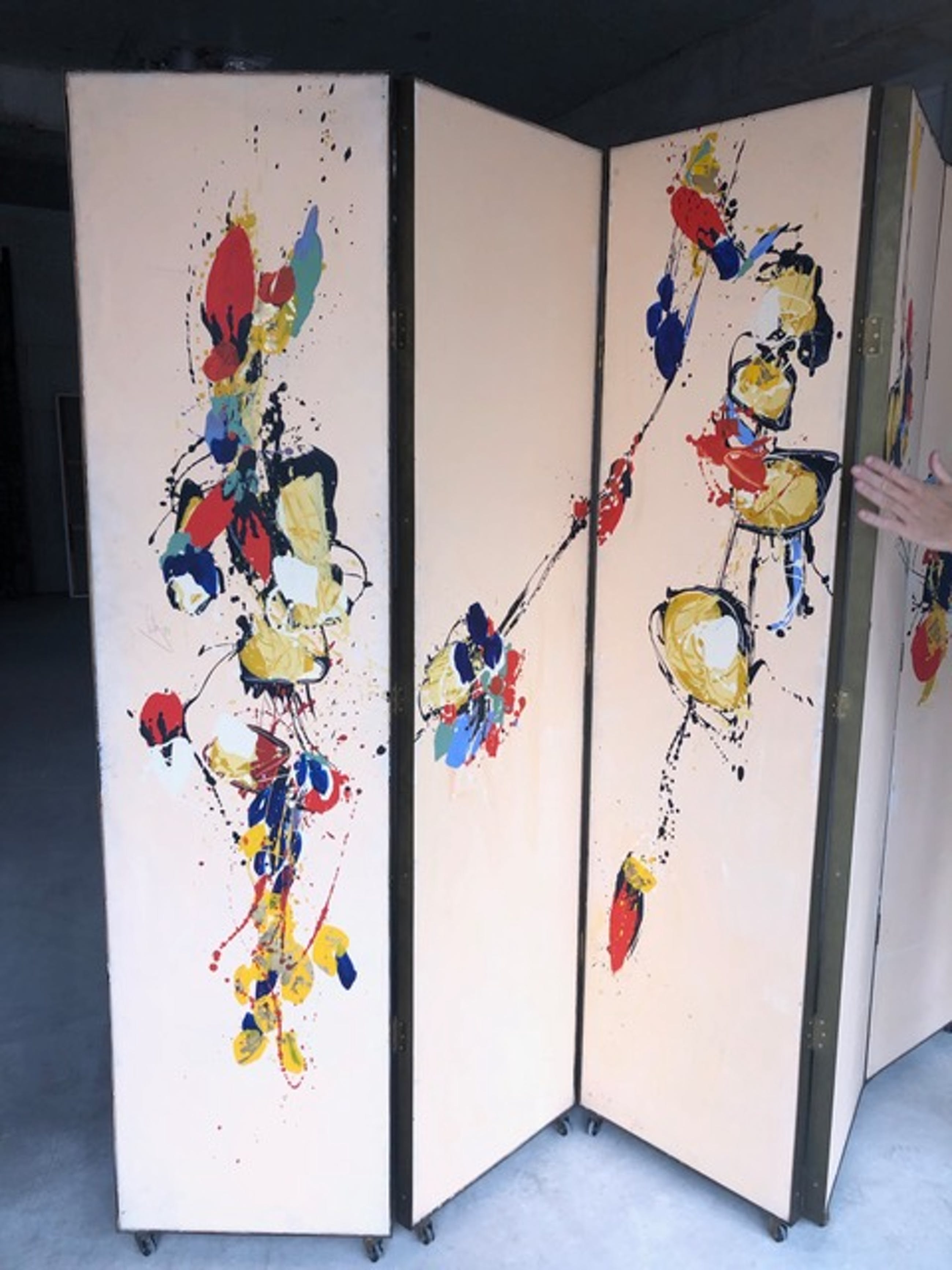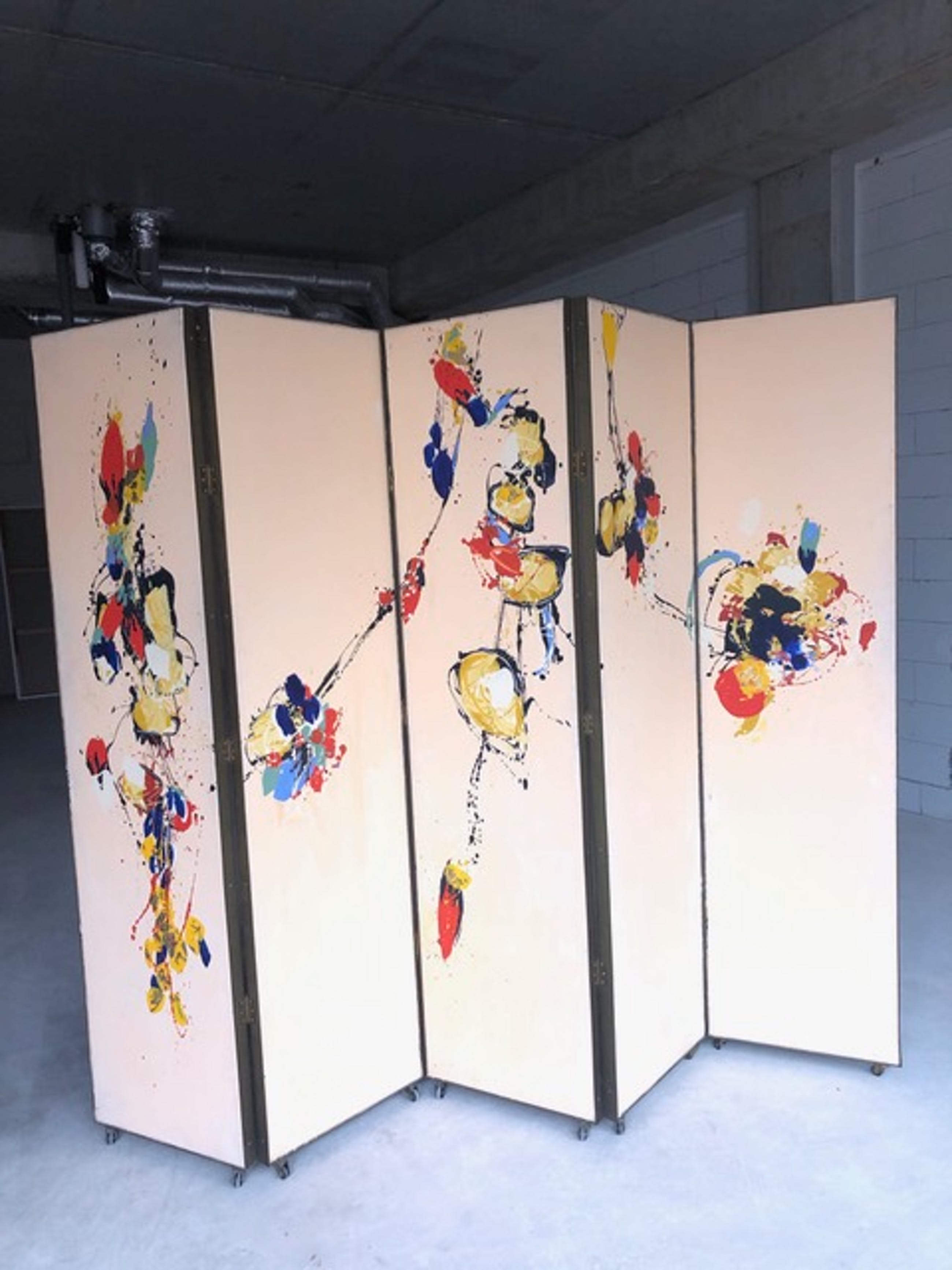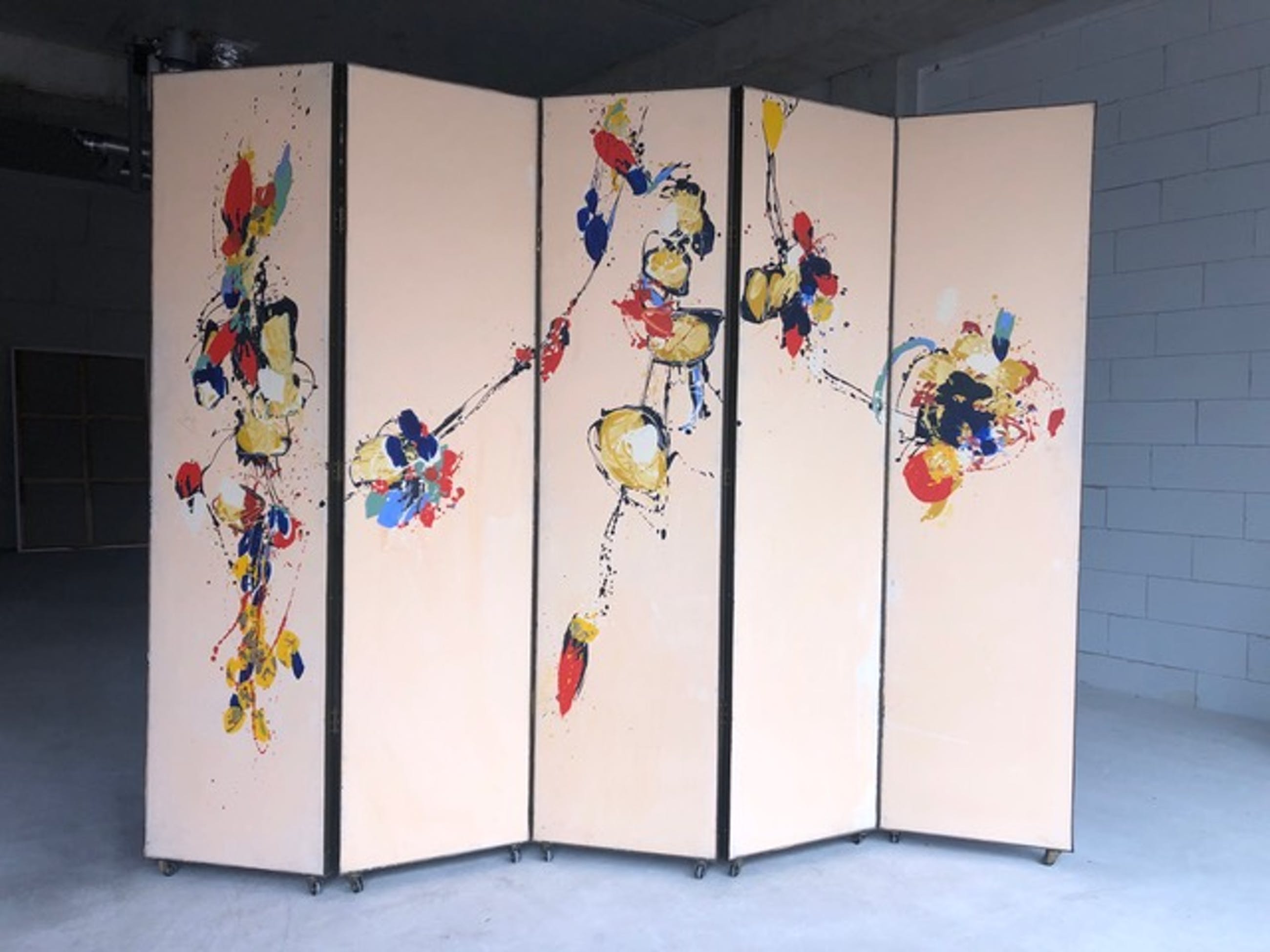 Vijf-deling en tweezijdig 'Kamerscherm' - acryl op doek. Elk paneel is 200 x 50 cm en aan beide zijden beschilderd. Alle panelen (10 stuks in totaal) zijn gevat in messing frames, verbonden door 3 uitklapbare houders en voorzien van transportwieltjes. Gesigneerd en gedateerd op het linker en het rechter paneel: Arty '94.