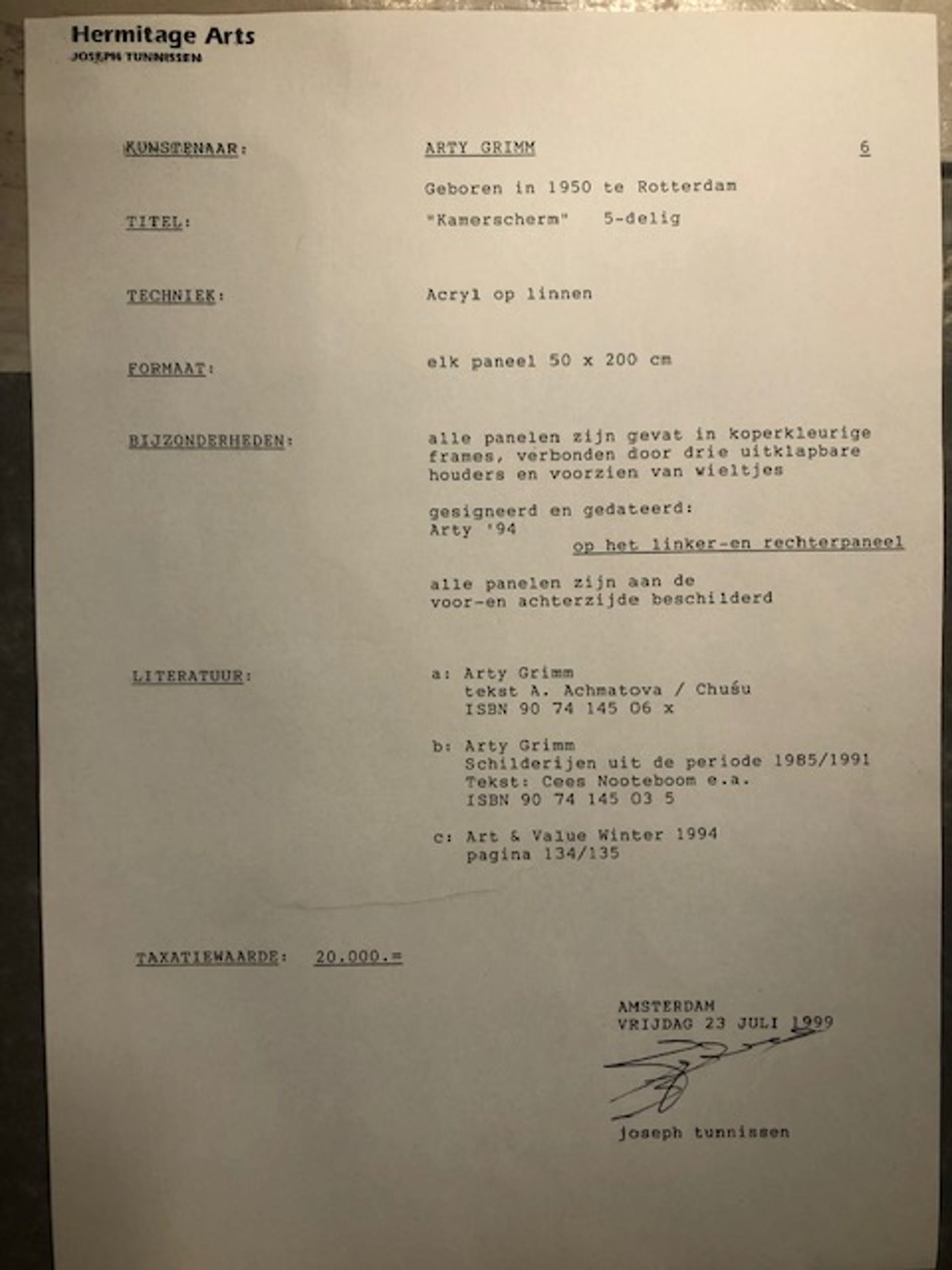 Taxatiewaarde juli 1999: Fl. 20.000,-, door Joseph Tunnissen, Hermitage Arts.