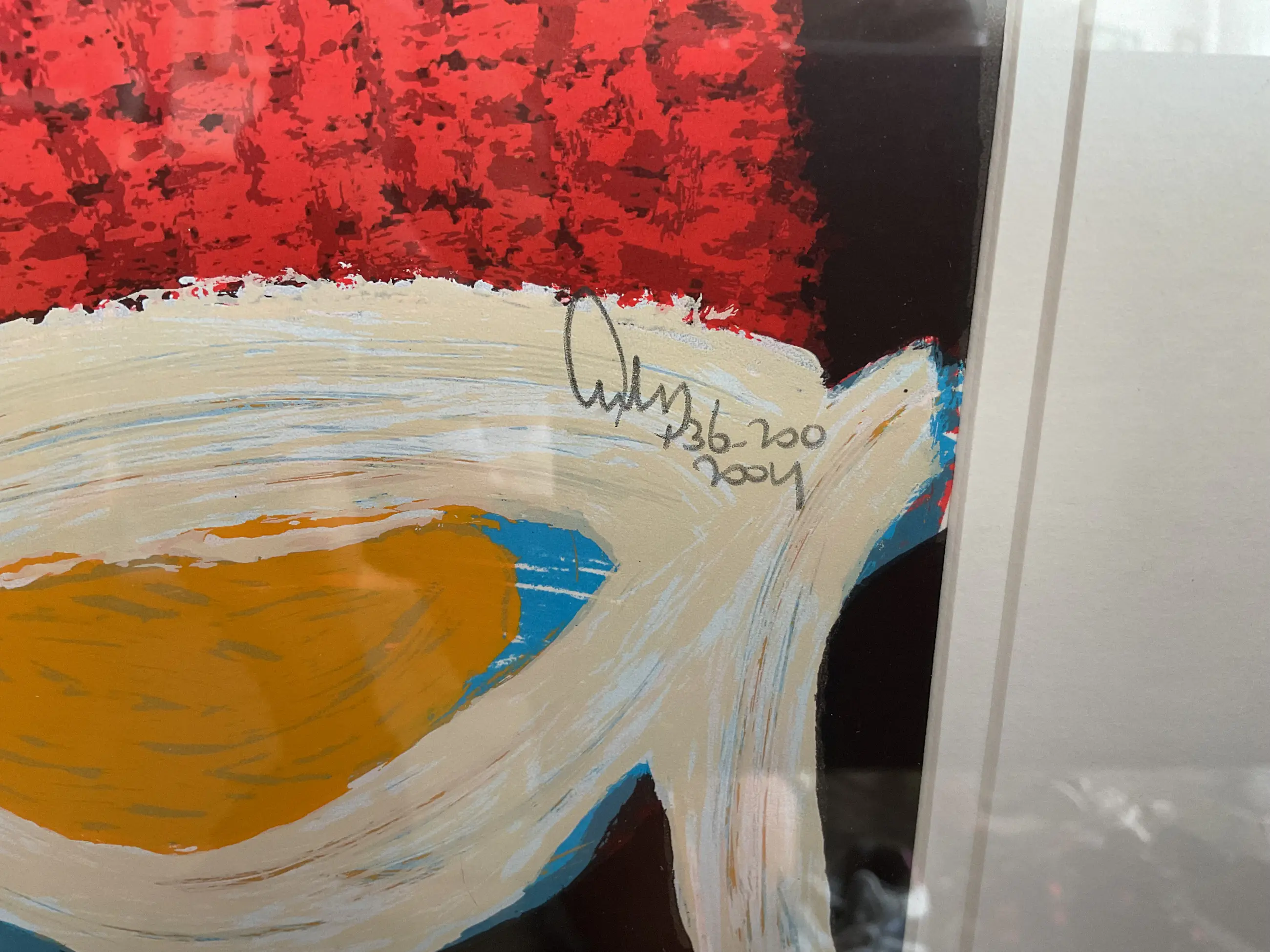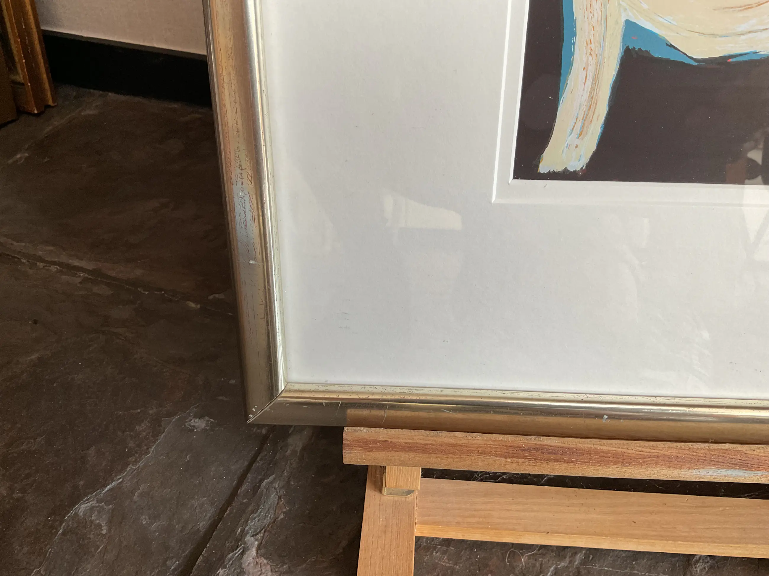 Zeefdruk in perfecte conditie. Lijst en glas zijn rechtsonder beschadigd.
