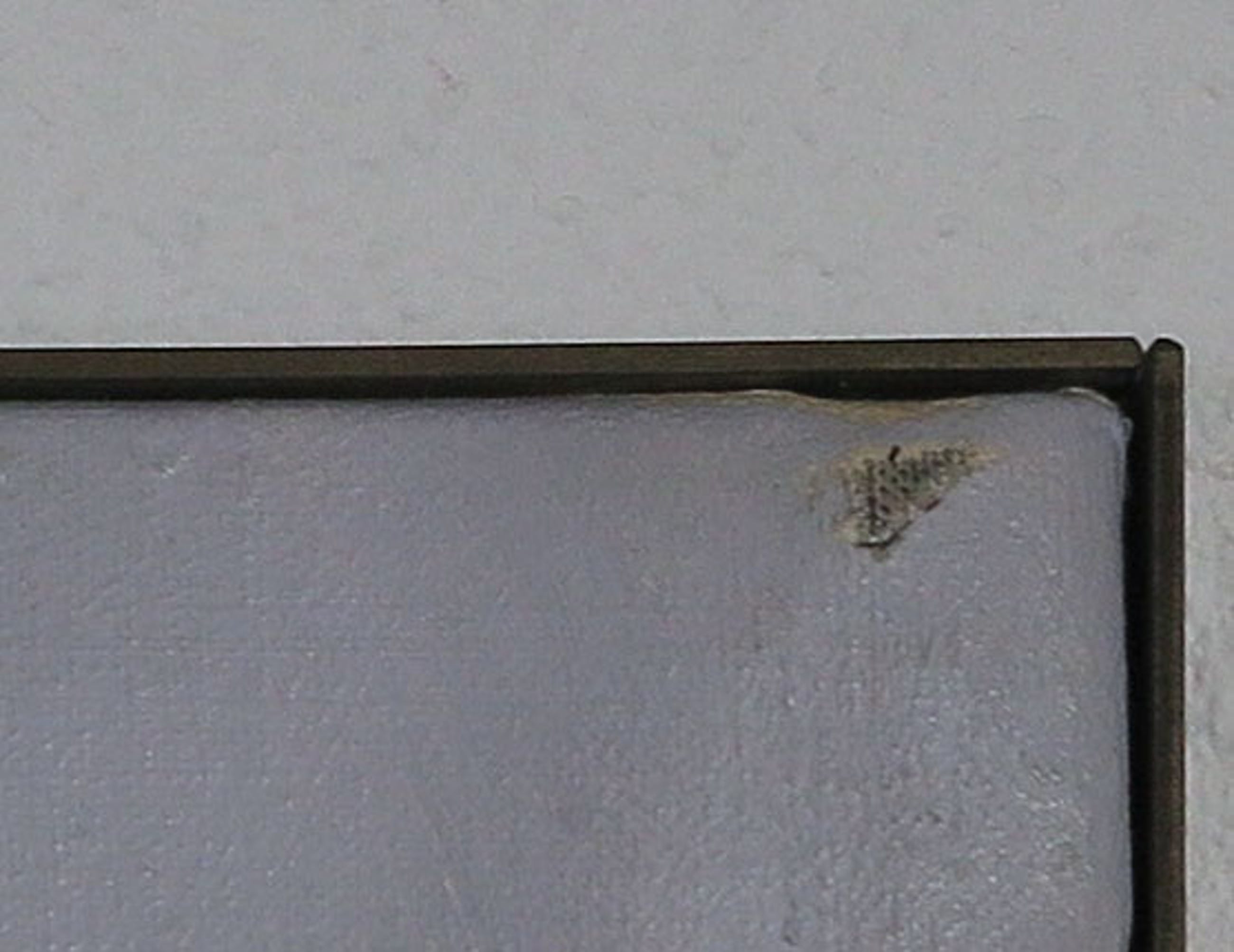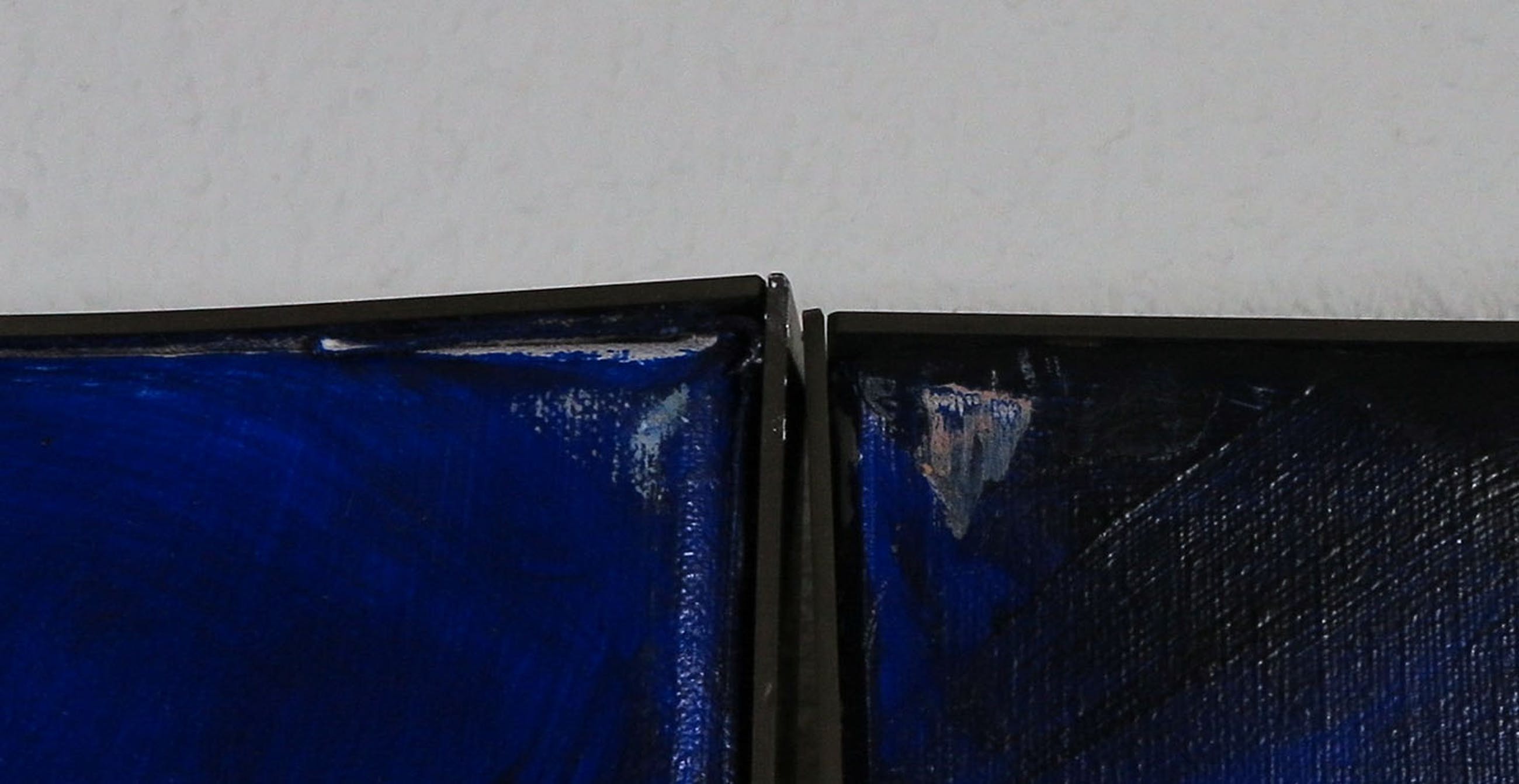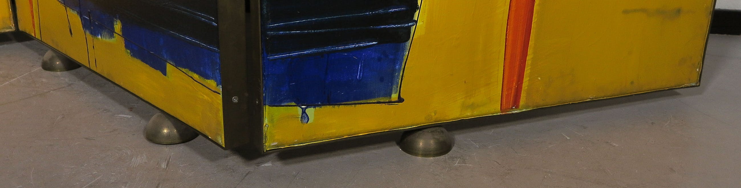 Hier en daar een klein slijtplekje langs een rand of hoek. Er mist één pootje en een pen van een scharnier. Het gele vlak op het derde doek aan de voorzijde is wat vlekkerig. Het is niet duidelijk of dit de bedoeling is. | |