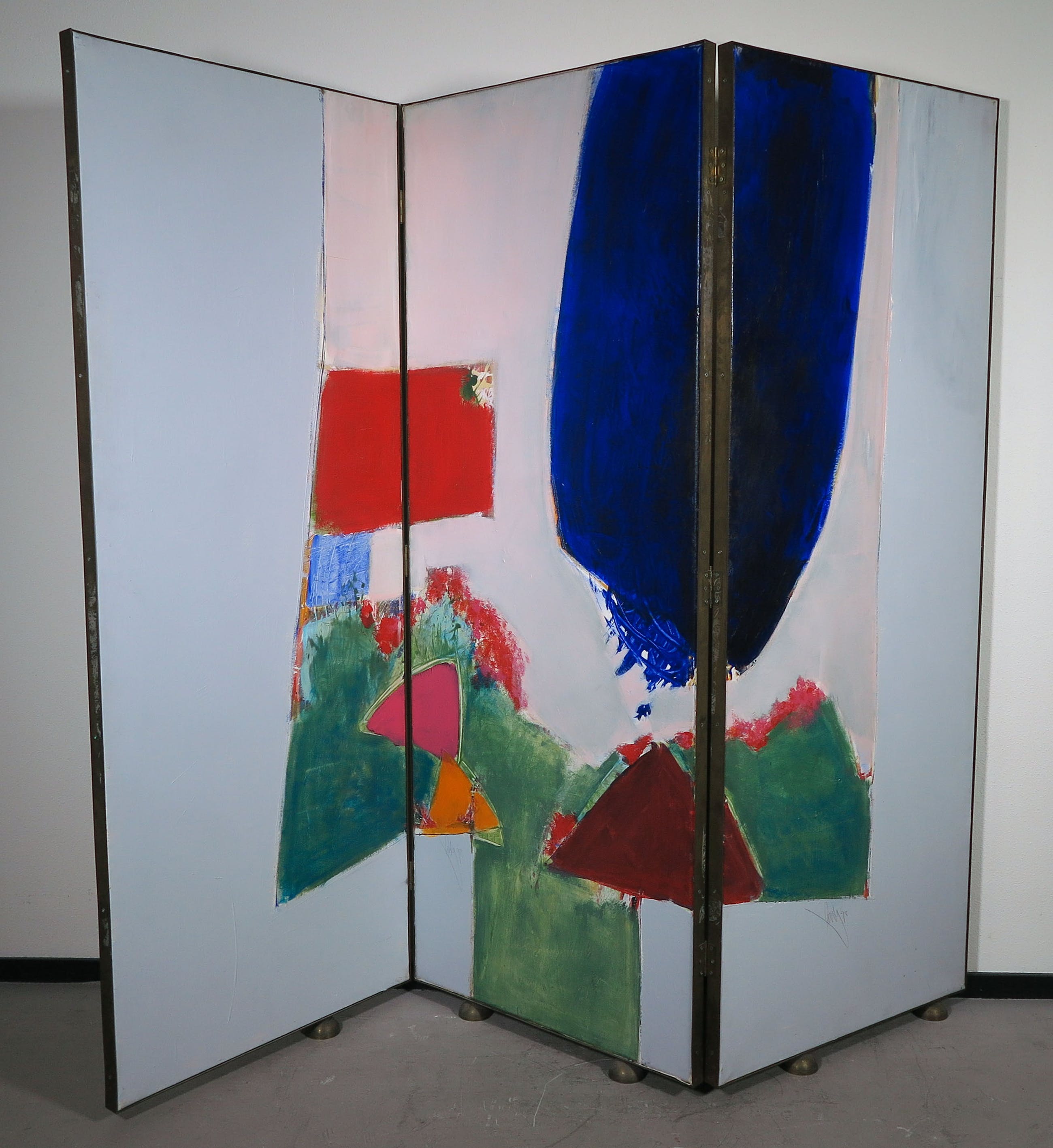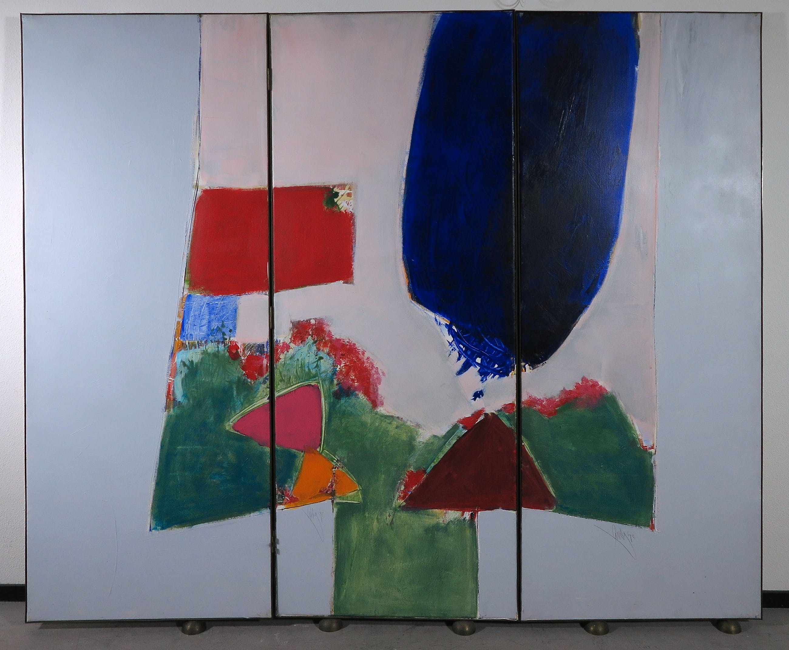 Zeer groot kamerscherm, bestaande uit in totaal 6 schilderingen op doek, verdeelt over twee zijdes. Elke zijde vormt een drie-luik.