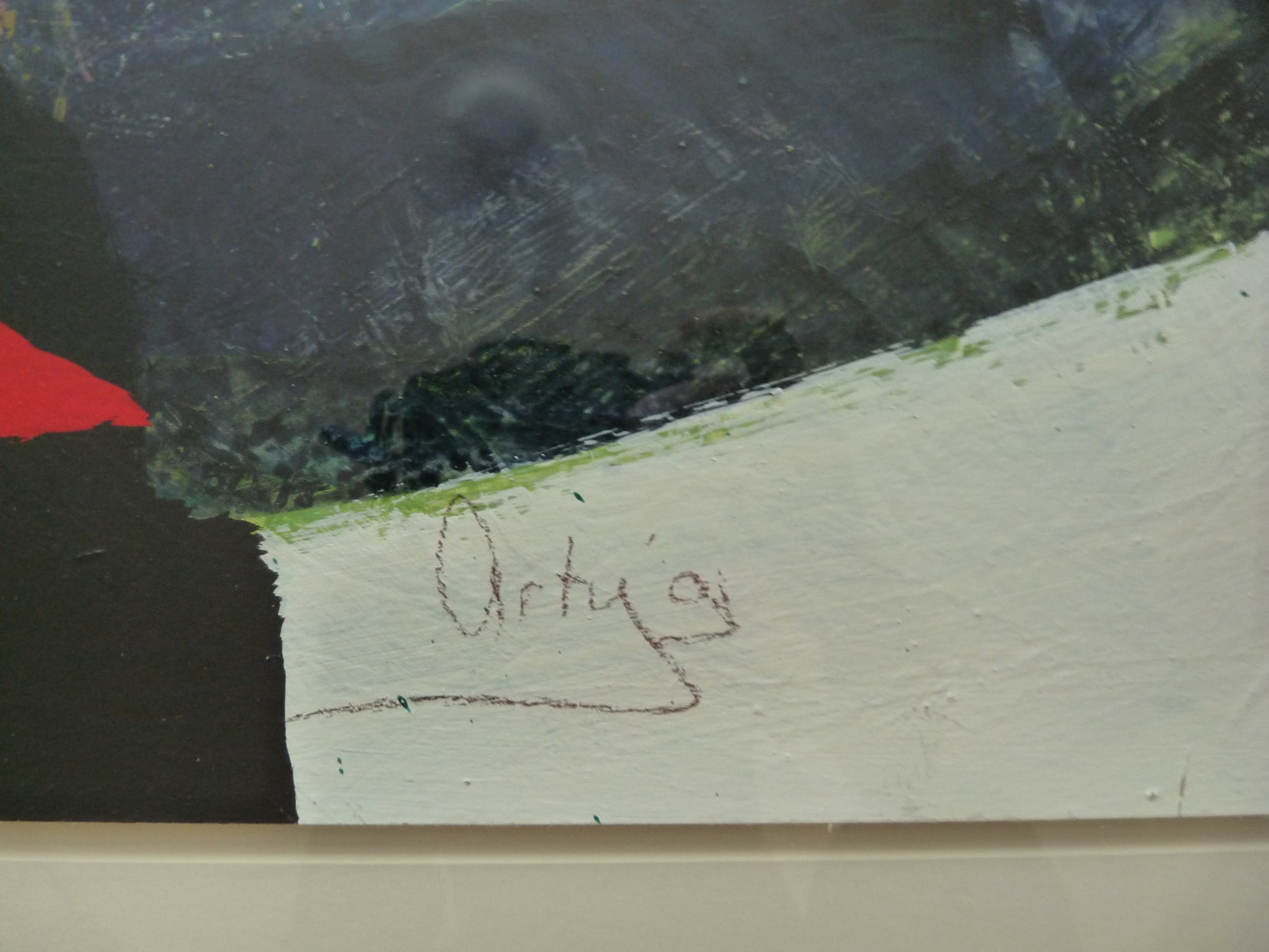 Gemengde techniek uit 1991. Komt uit voormalige RABO collectie. Goudkleurige lijst heeft gebruikssporen. (zie detailfoto)