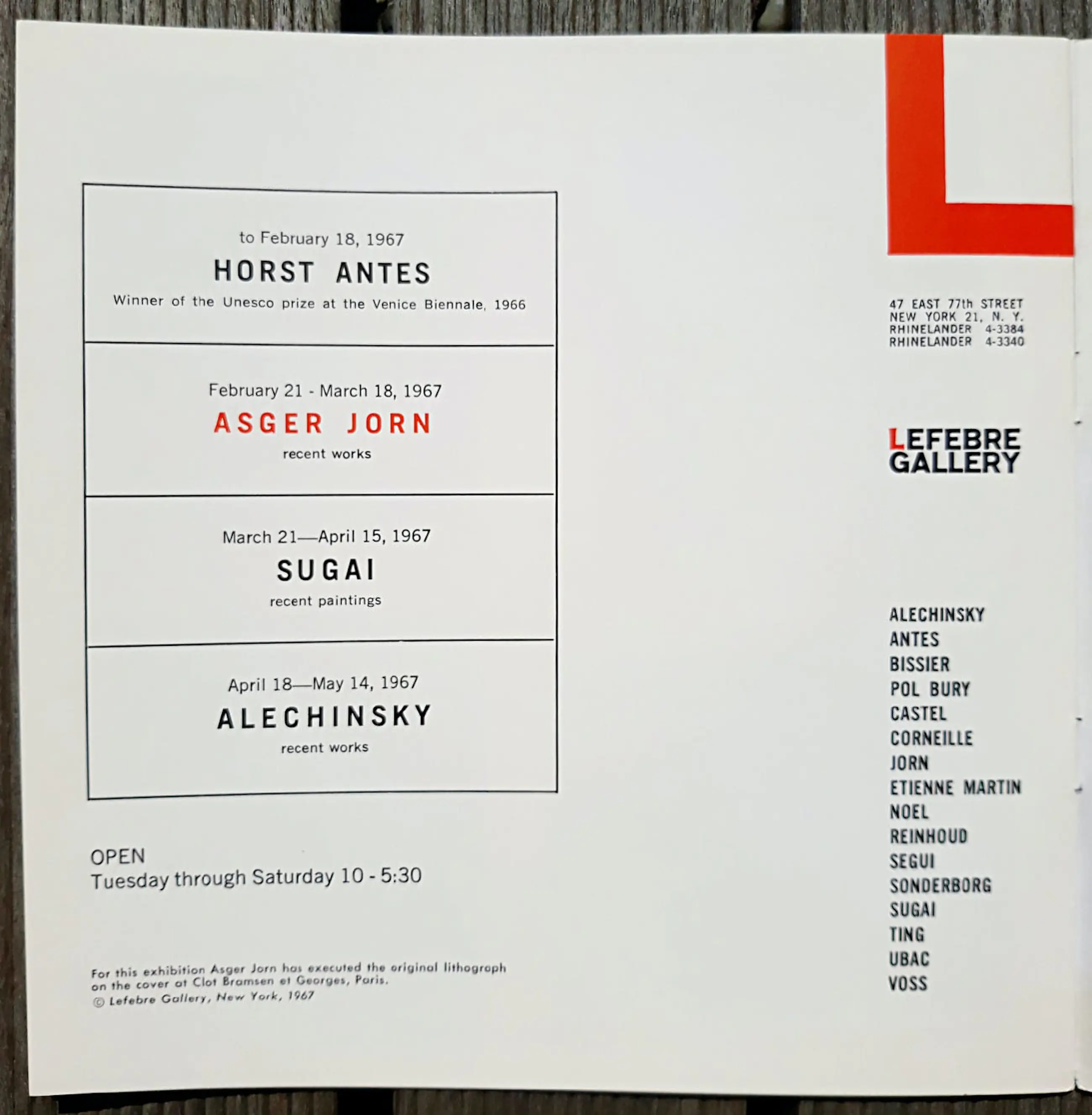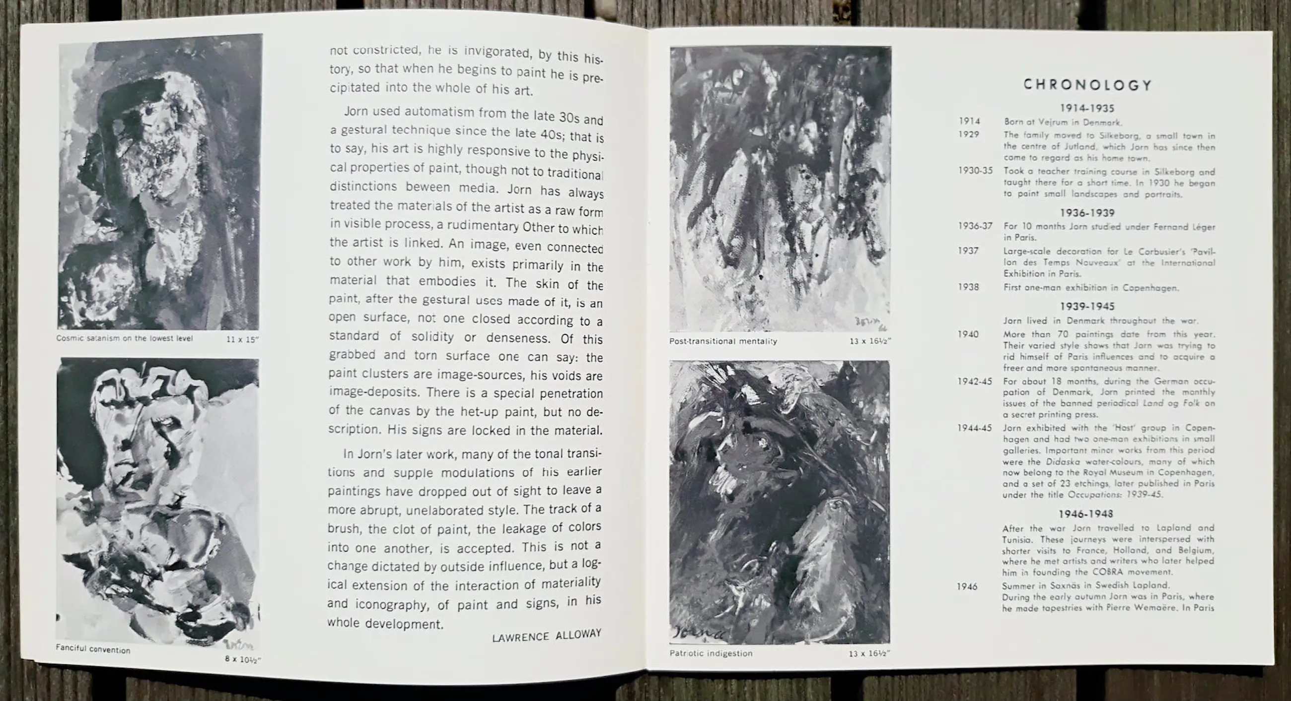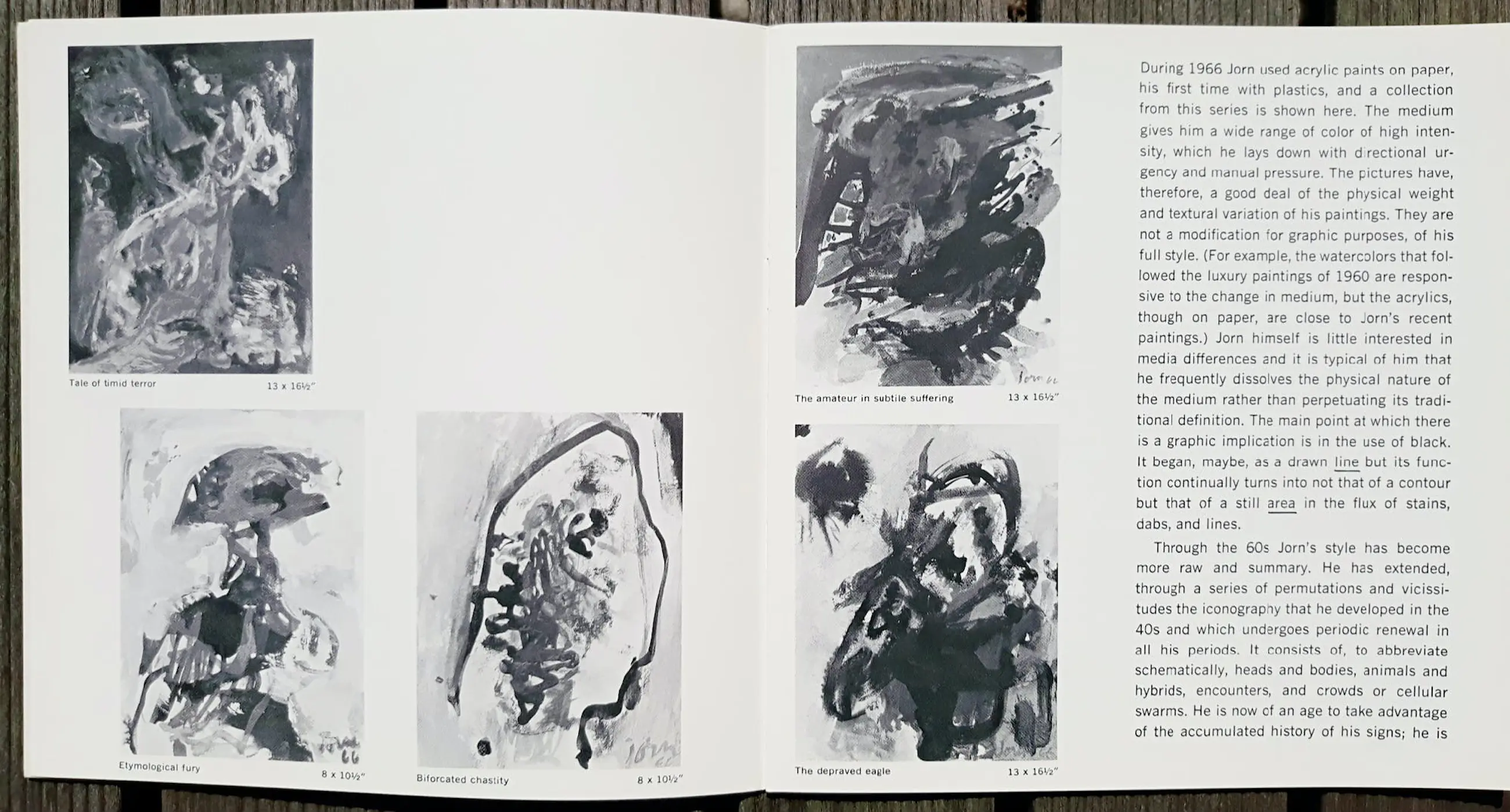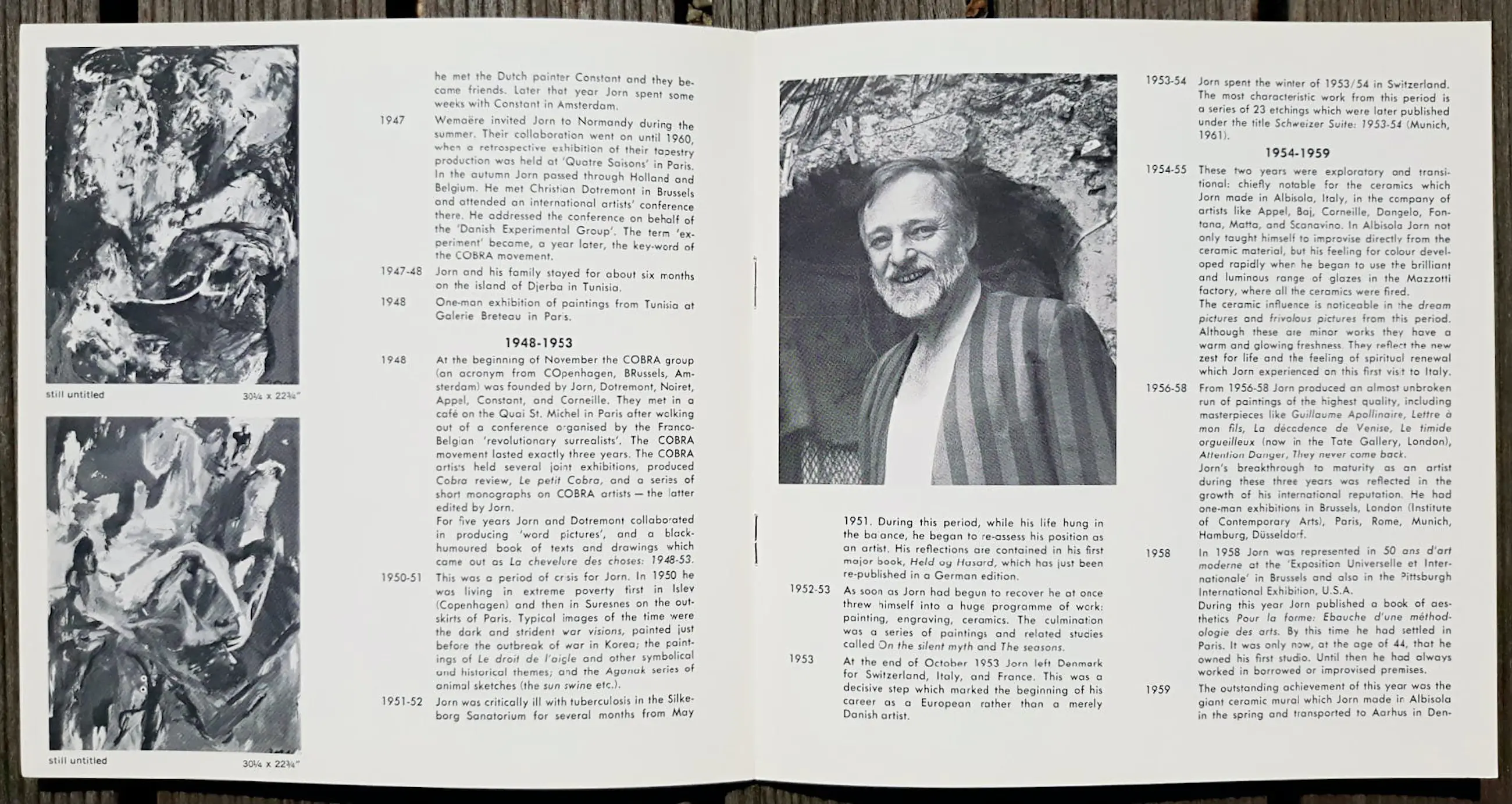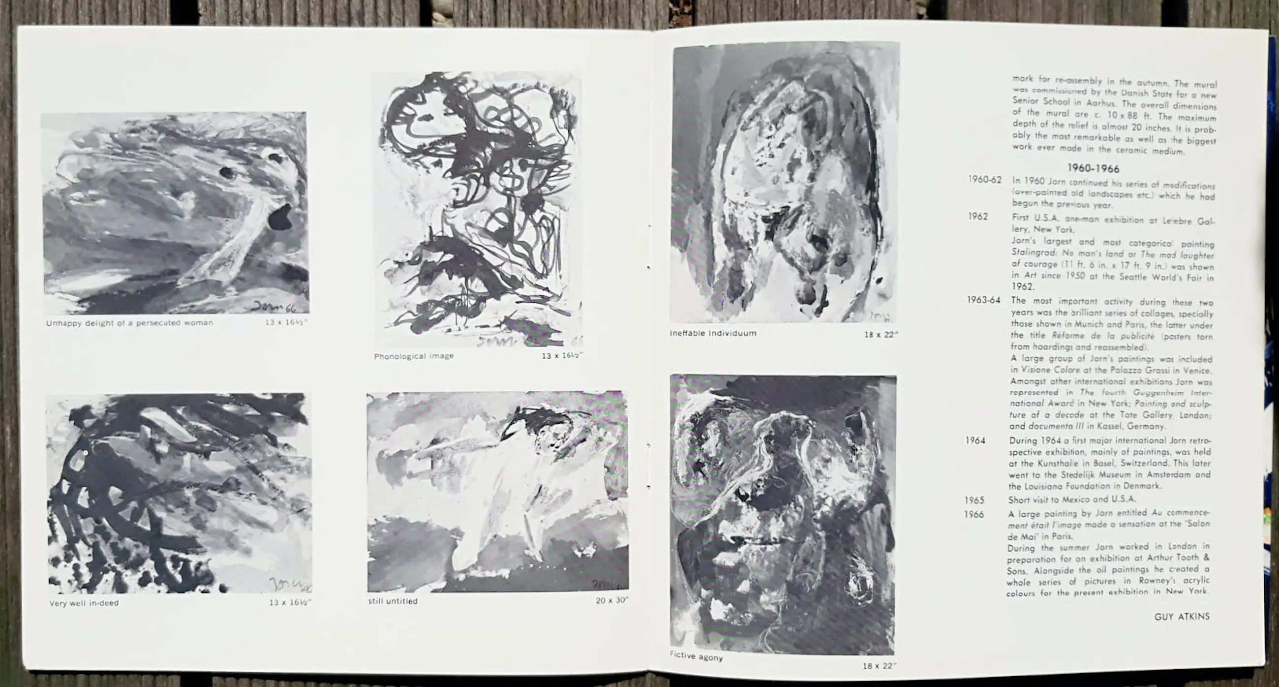 Complete publicatie met een uitklapbare litho door Asger Jorn. In deze uitnodigingscatalogus ook reproducties van zijn recente werk en een beschrijving door Lawrence Alloway. In zeer goede conditie.