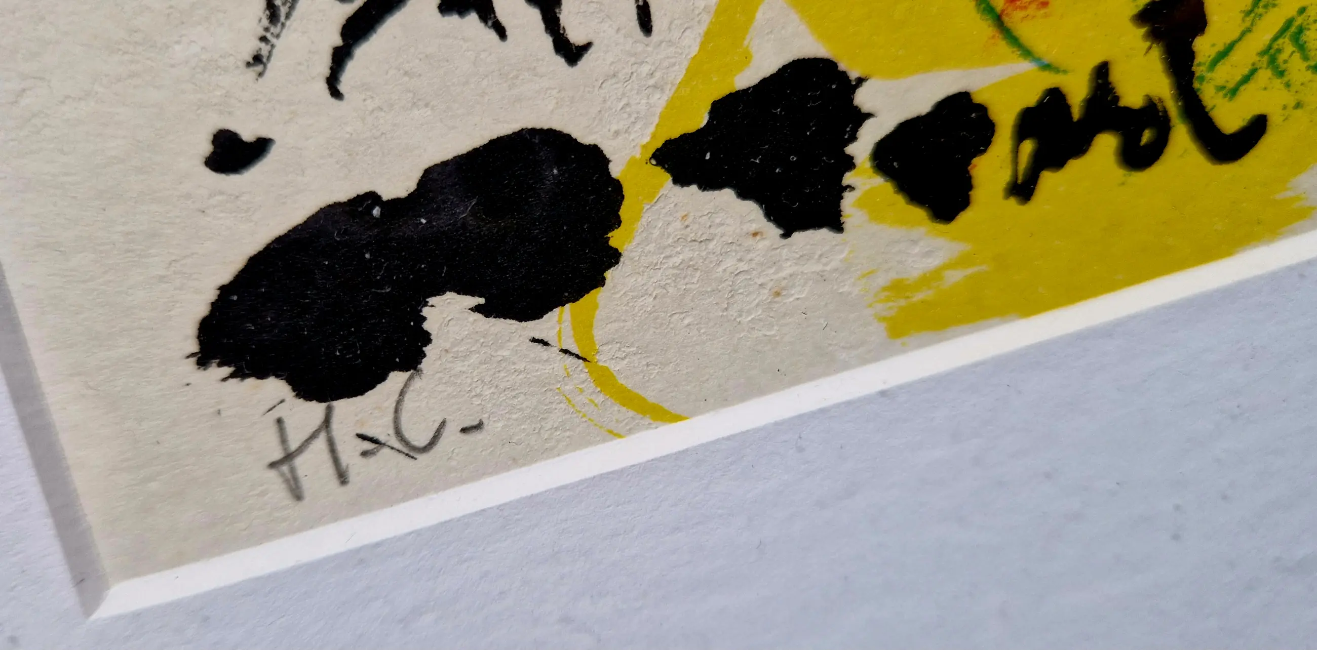 Professioneel ingelijst achter glas met passe-partout. Minimale verkleuring van het papier rechtsonder. Mooie staat.
