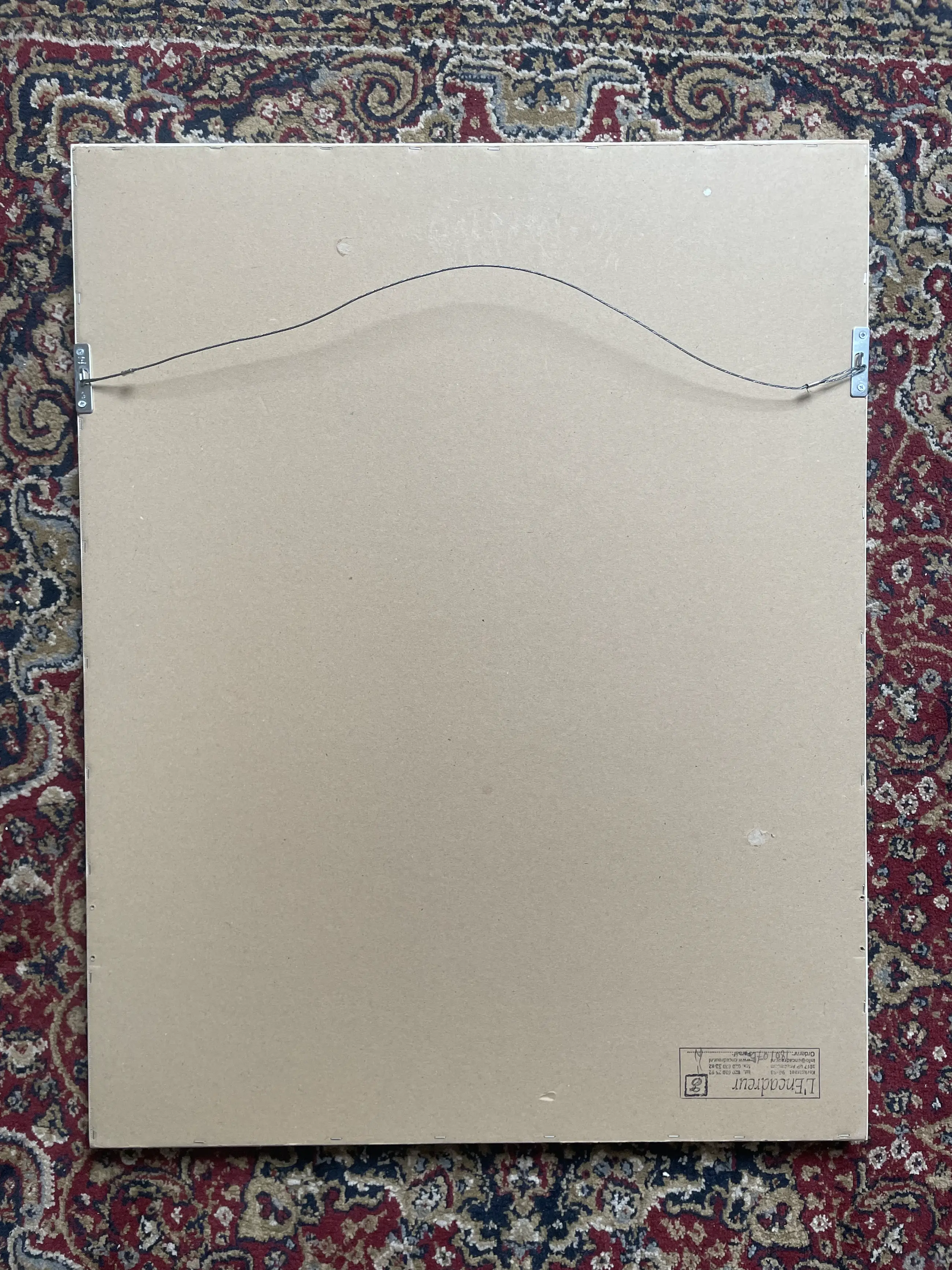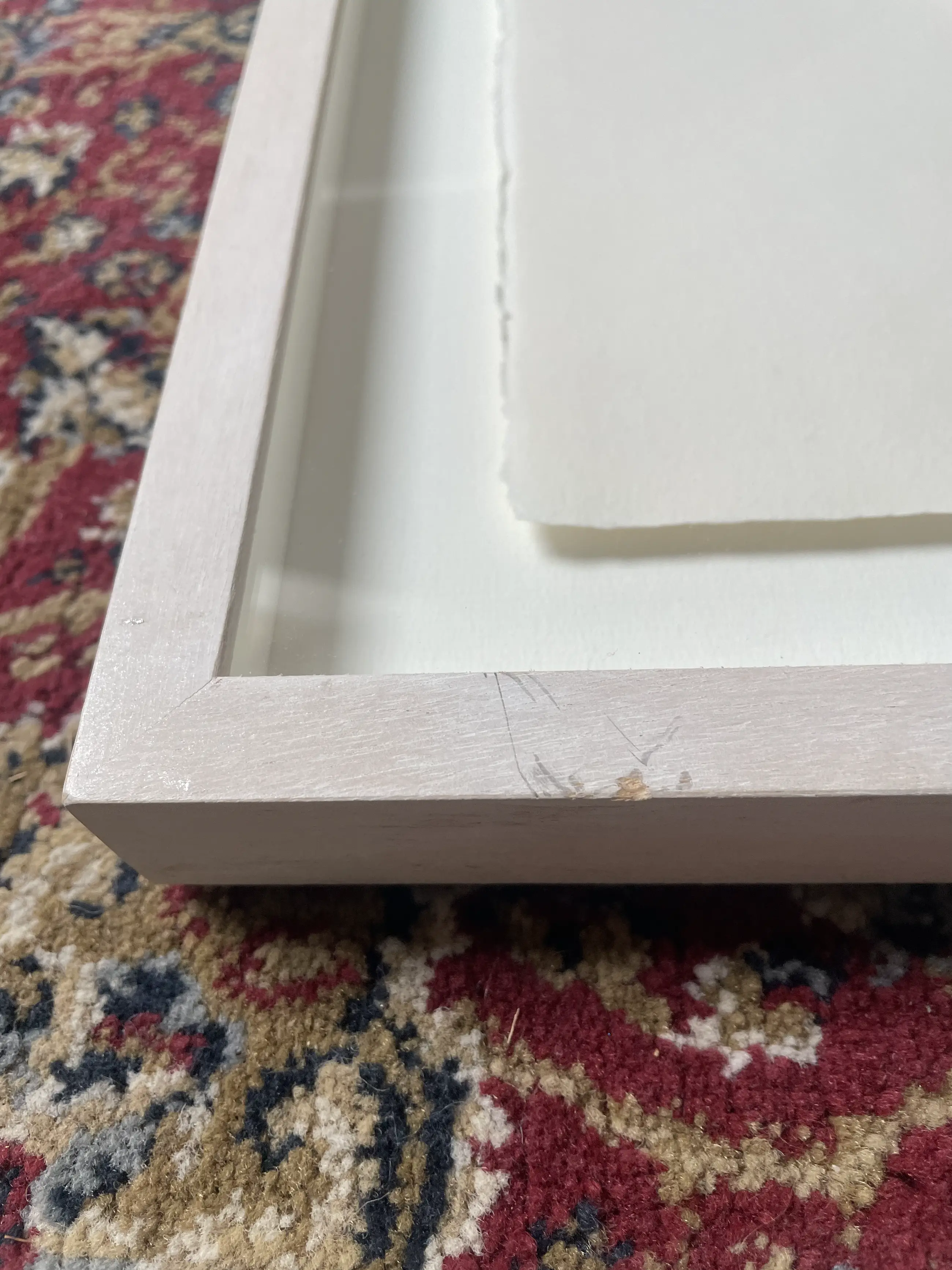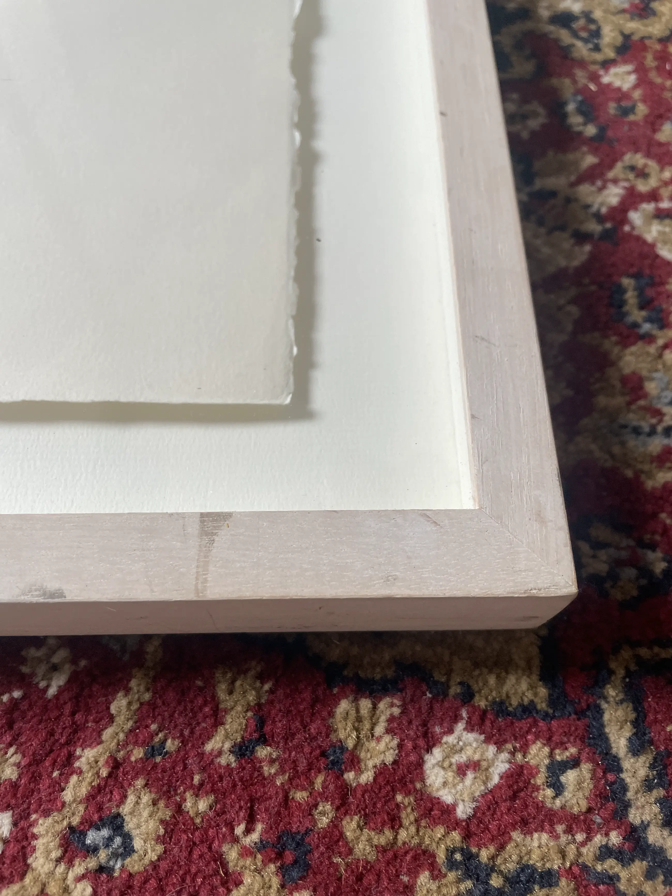 Lijst heeft twee kleine beschadigingen (zie foto's). Werk zeer lichte verkleuringing van een passe-partout die er ooit voor heeft gezeten.