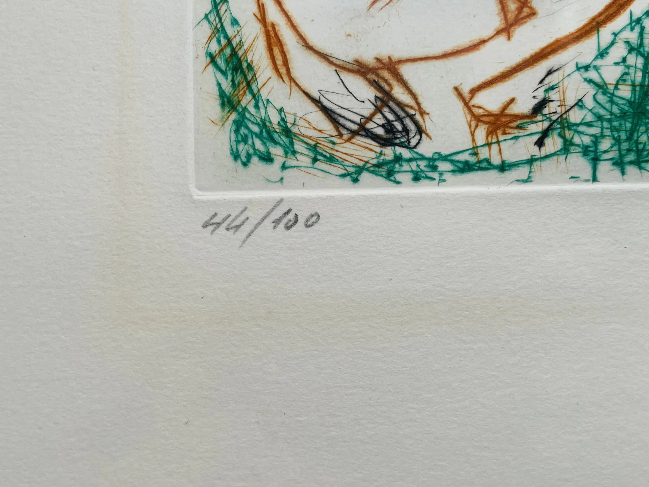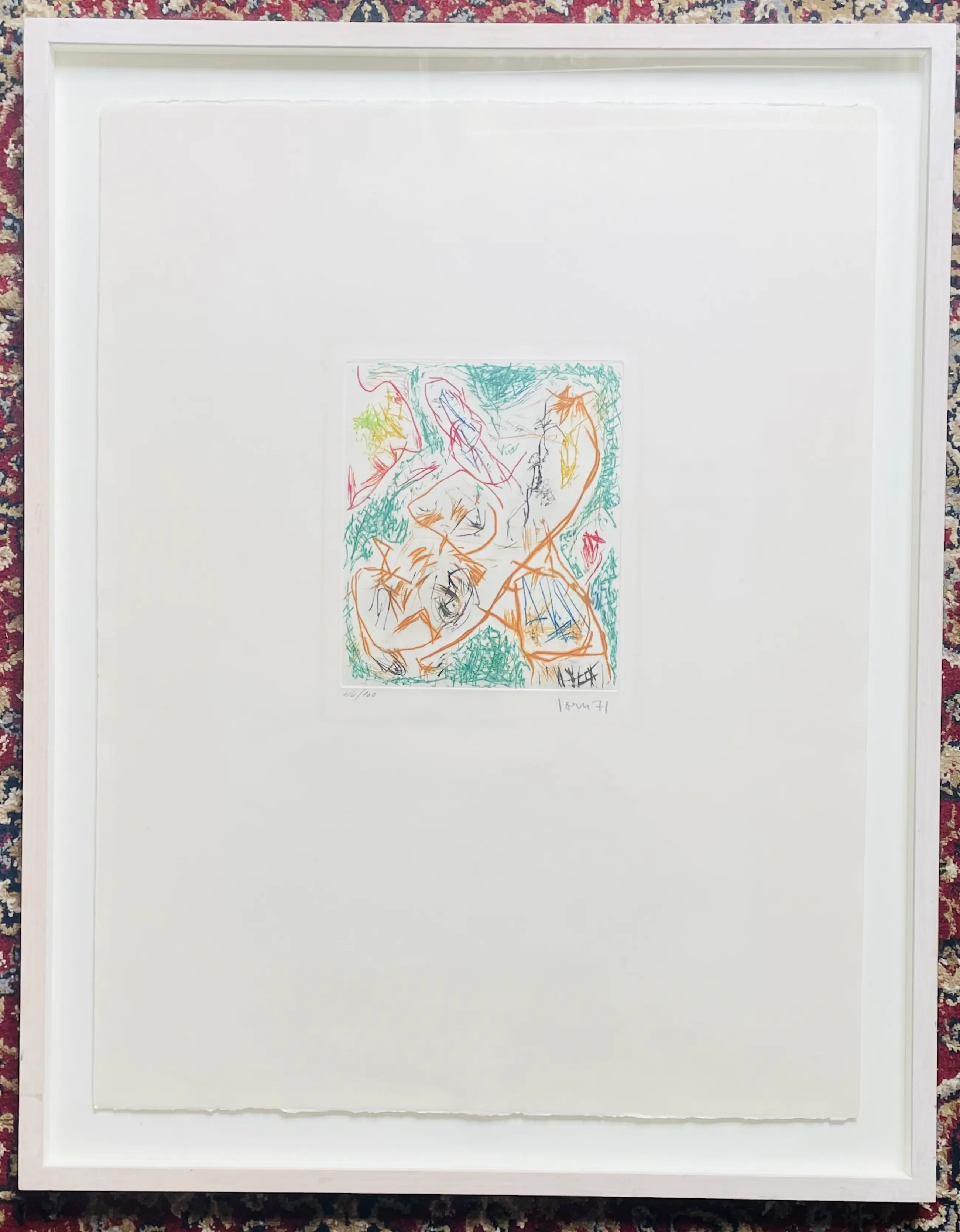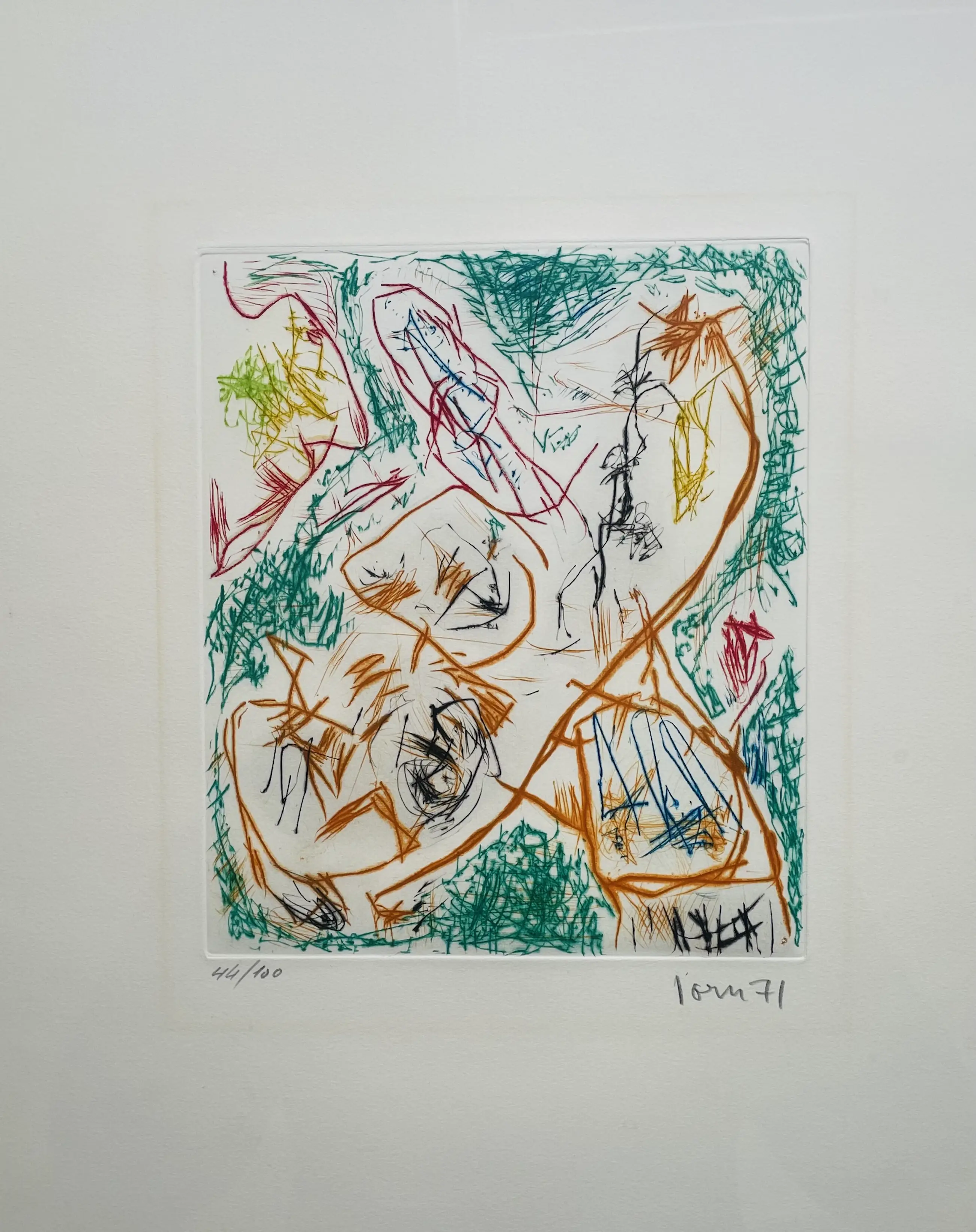 Kleurrijk werk van de CoBrA-kunstenaar Asger Jorn. Droge naald ets met aquatint. Van de series 'Entrée de Secours'.