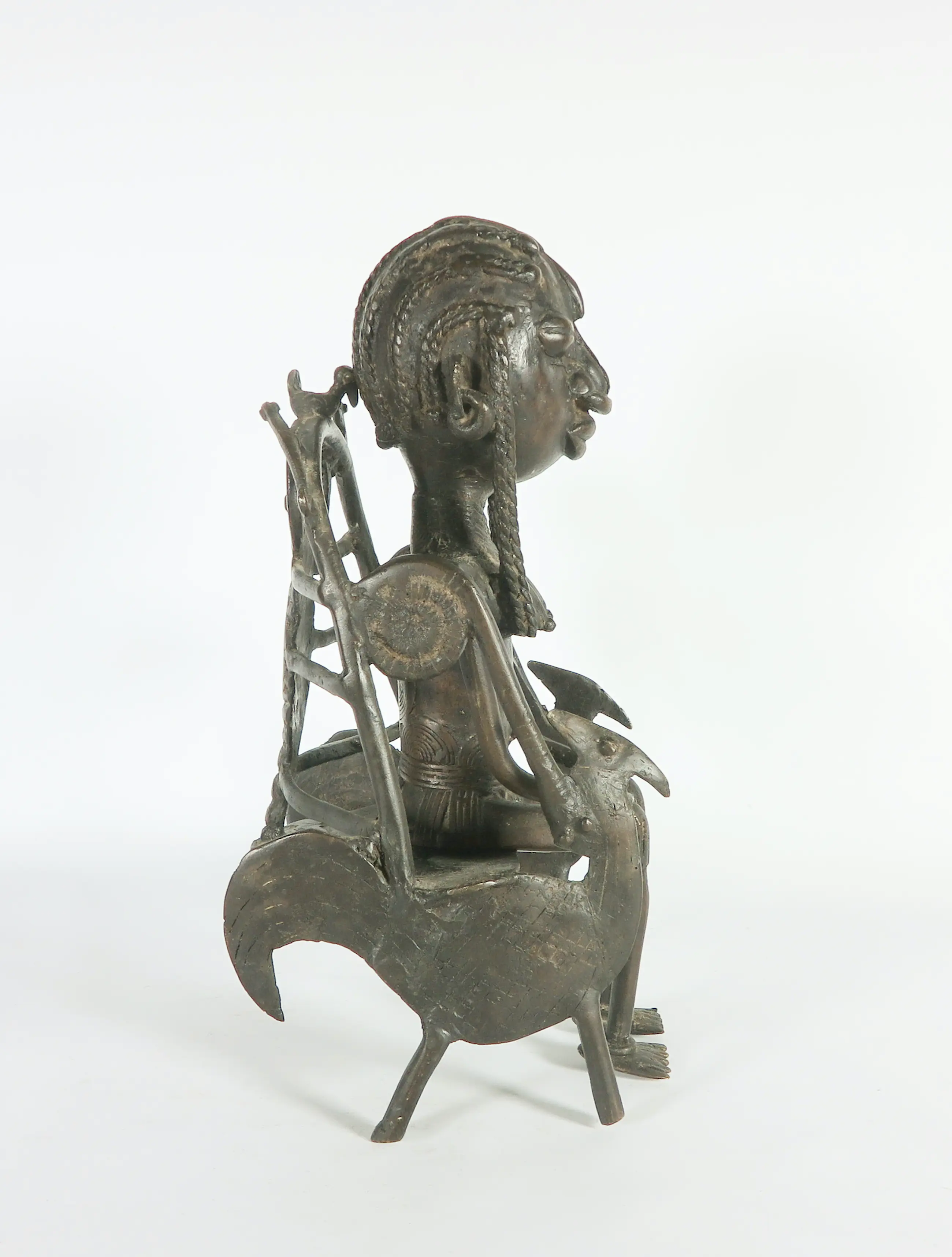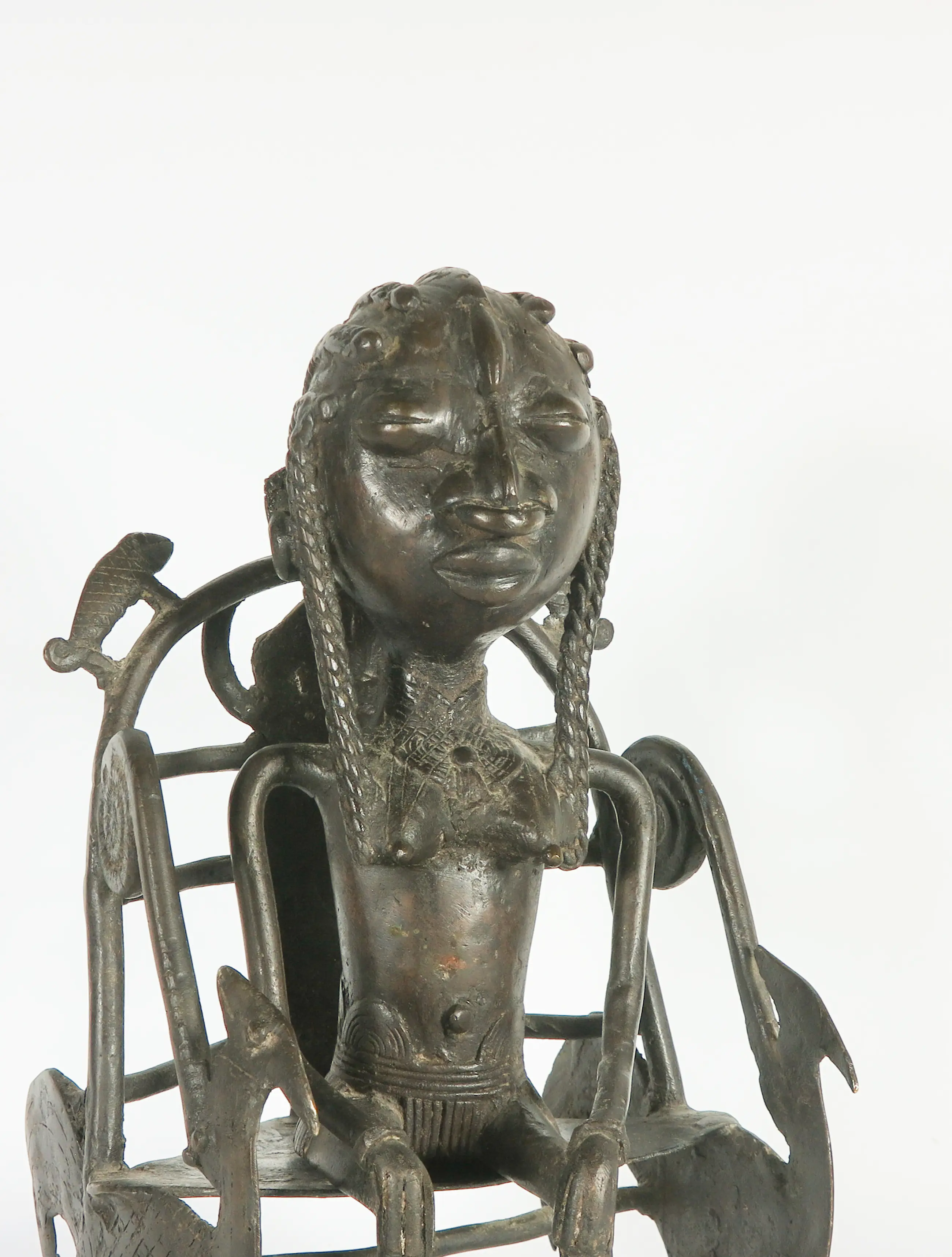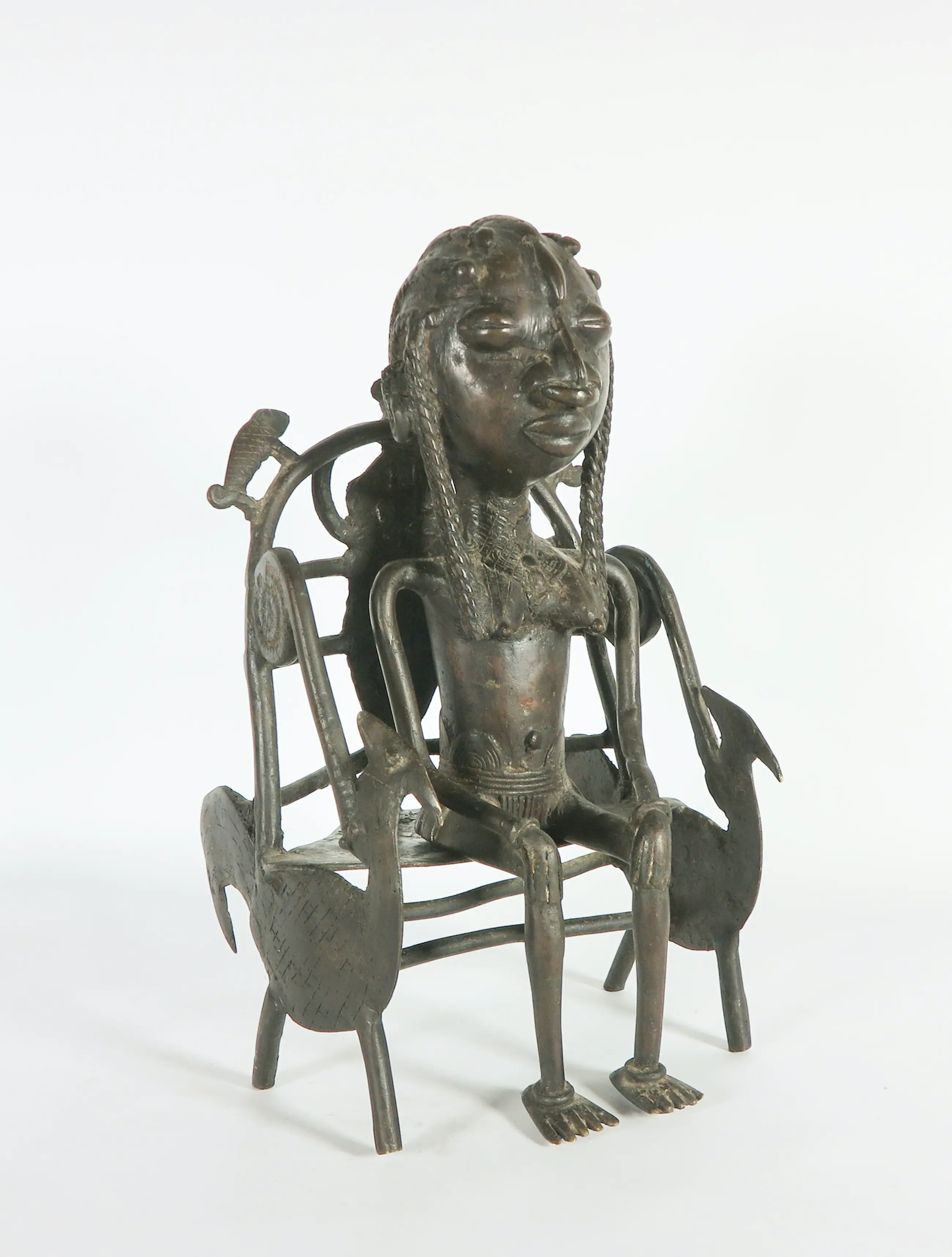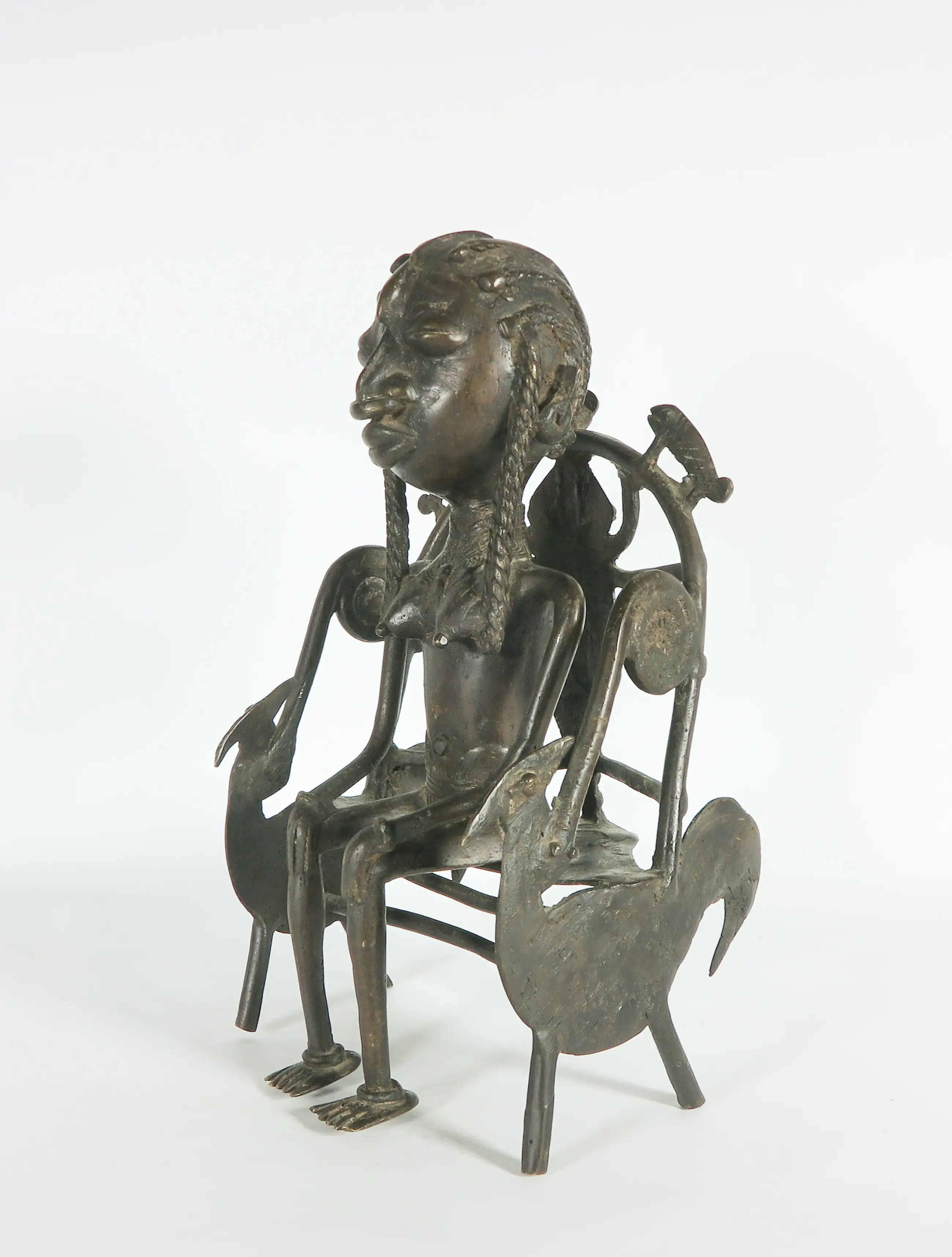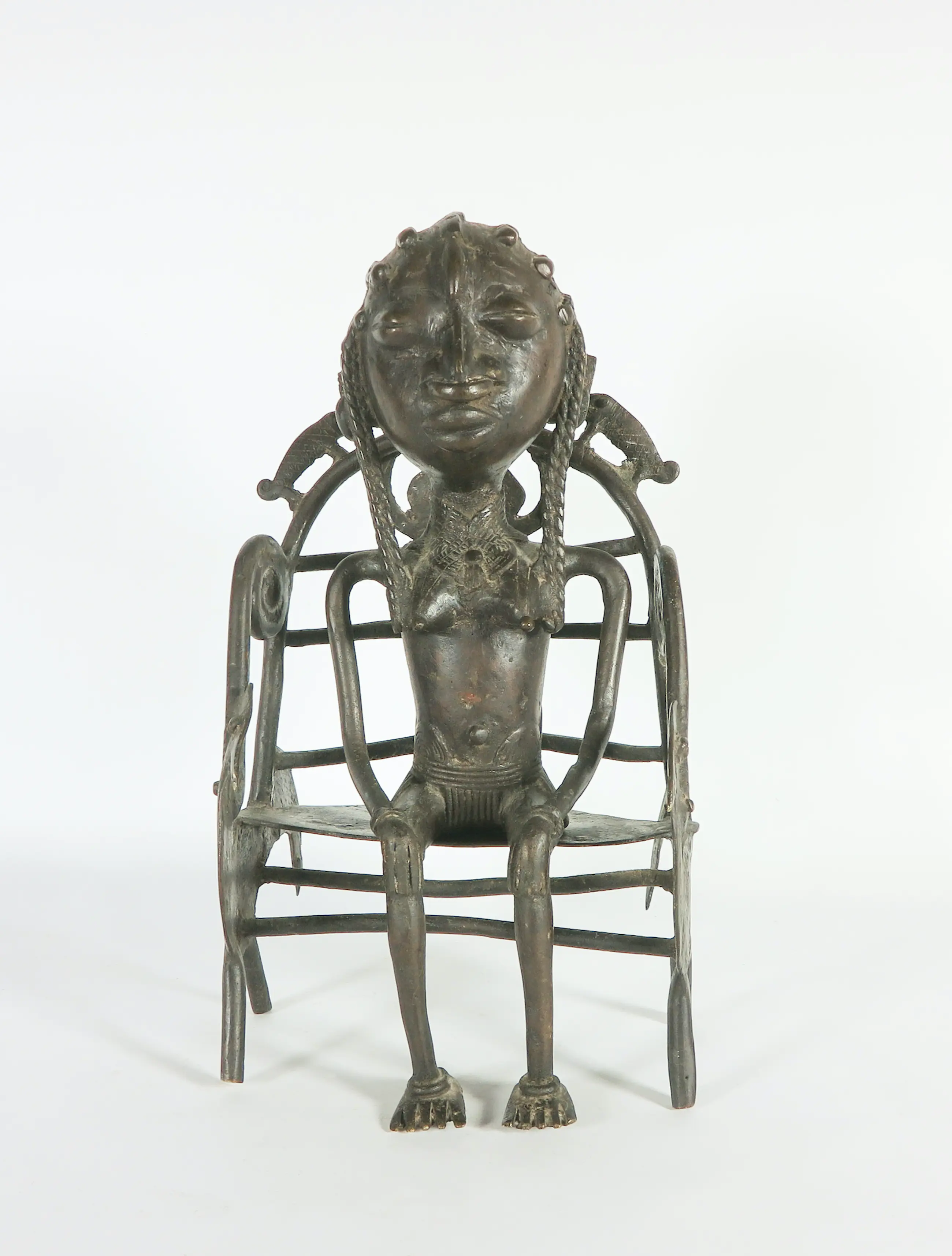 Het betreft een bronzen beeld van een koningin zitten op een troon. Het figuur rust los op de troon.
