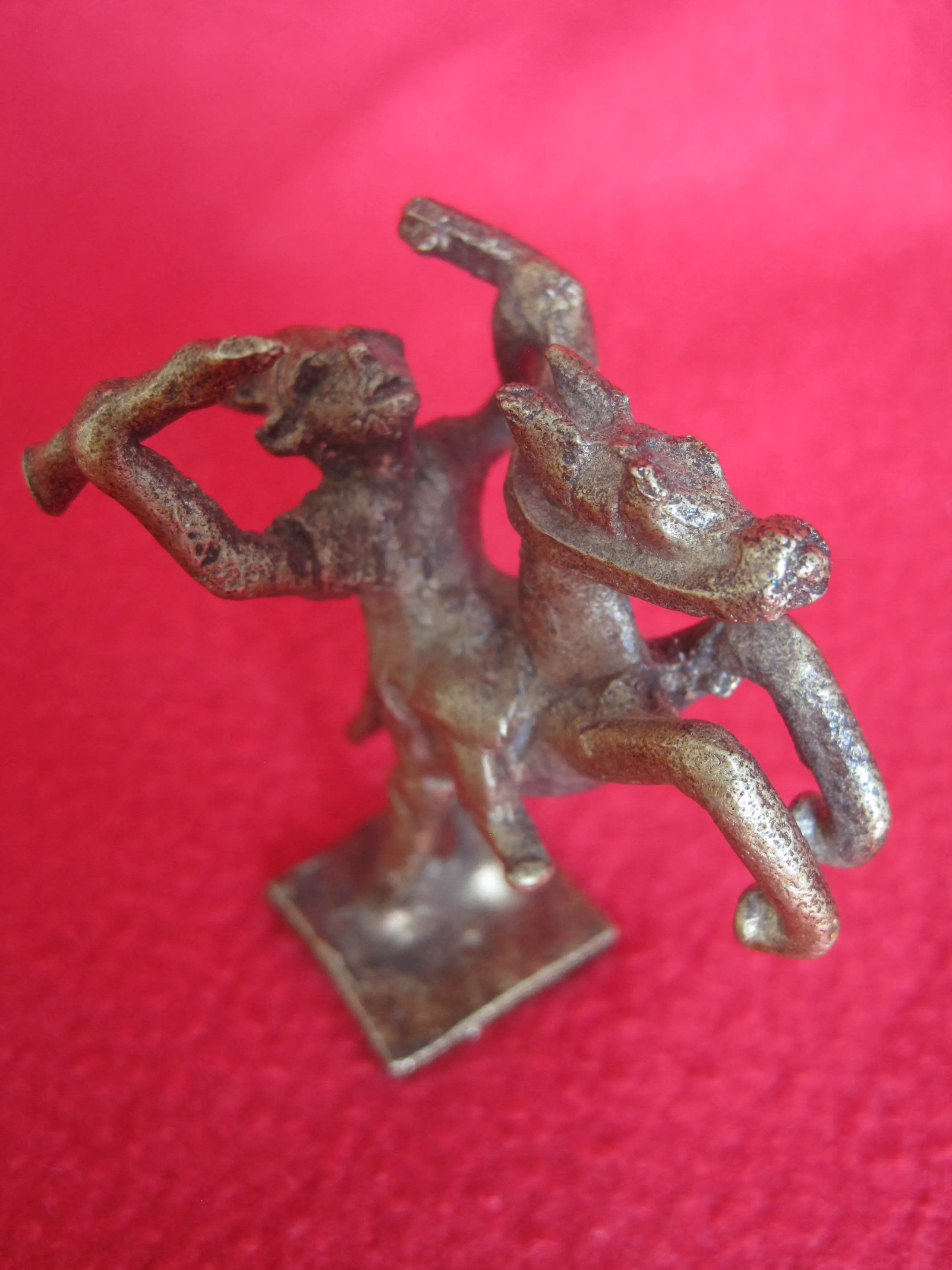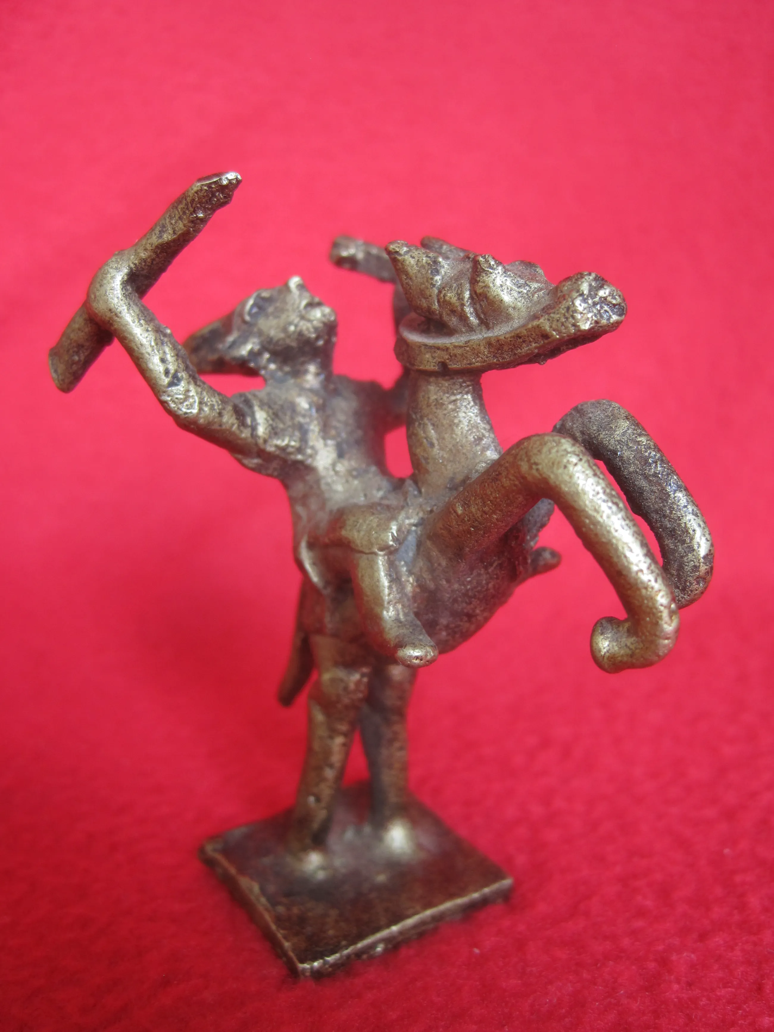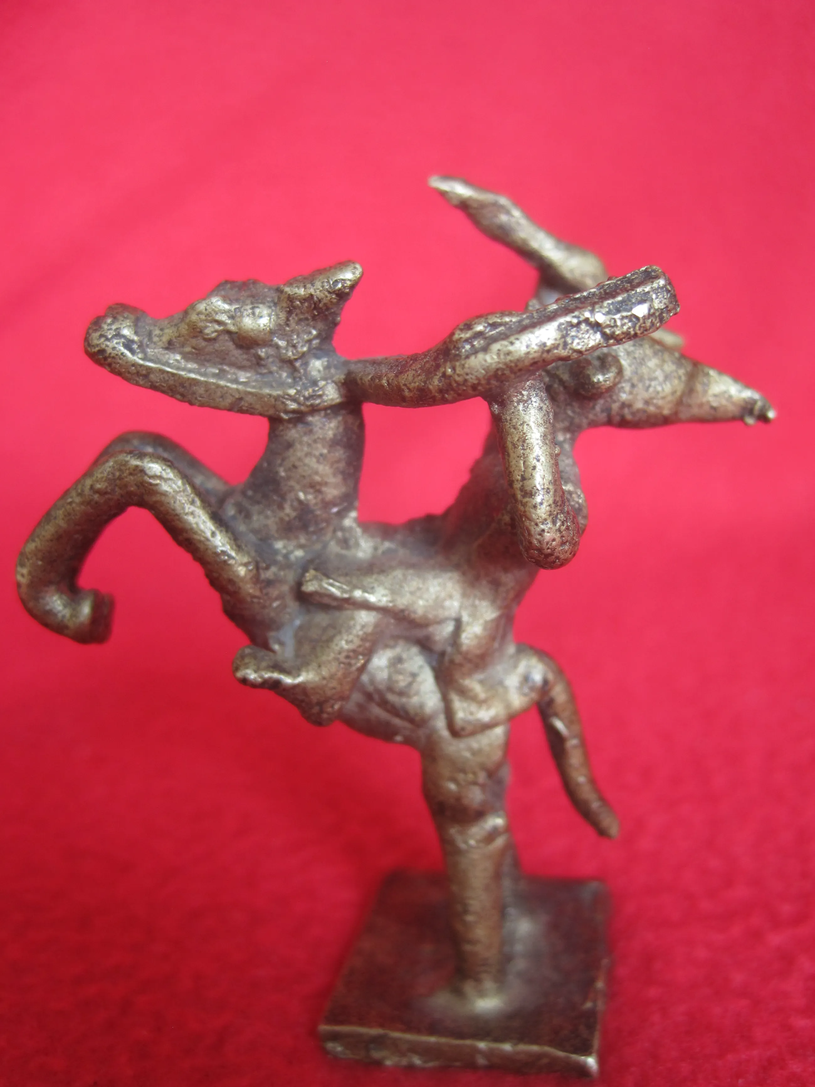 Een prachtig goudgewicht in de vorm van een ruiter op een steigerend paard.