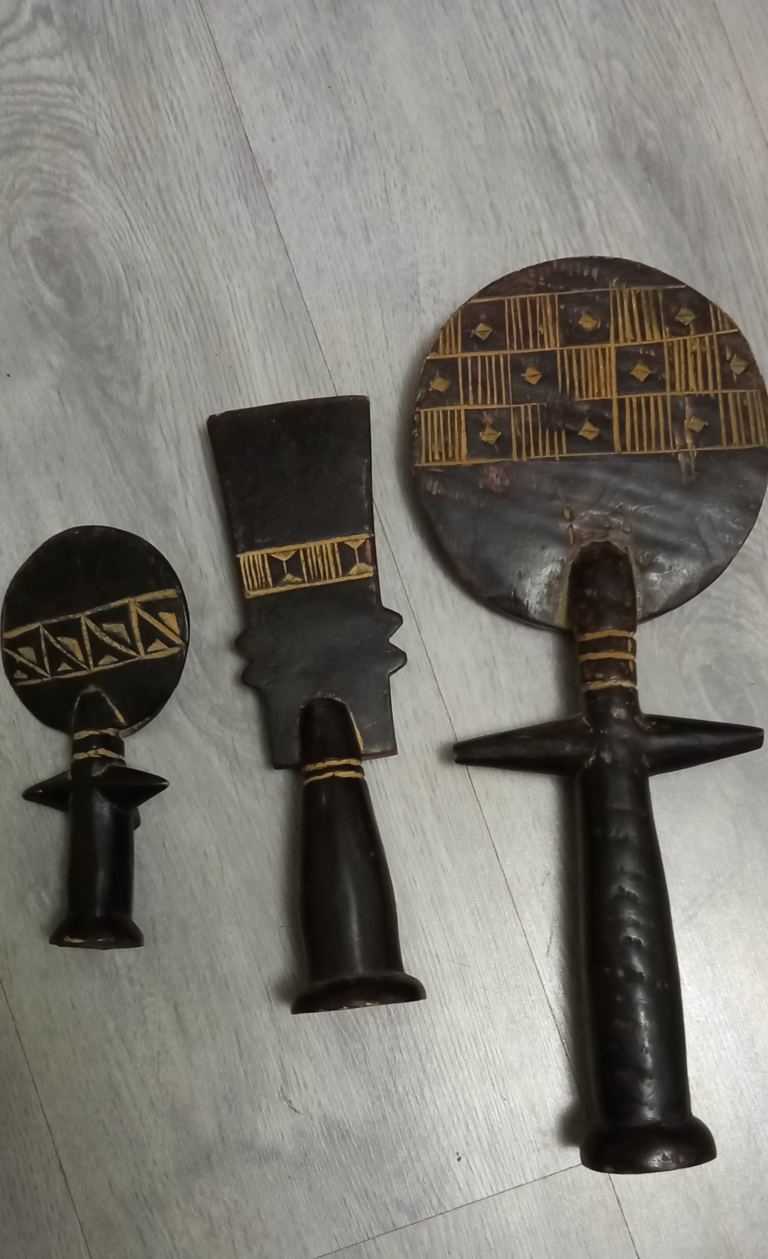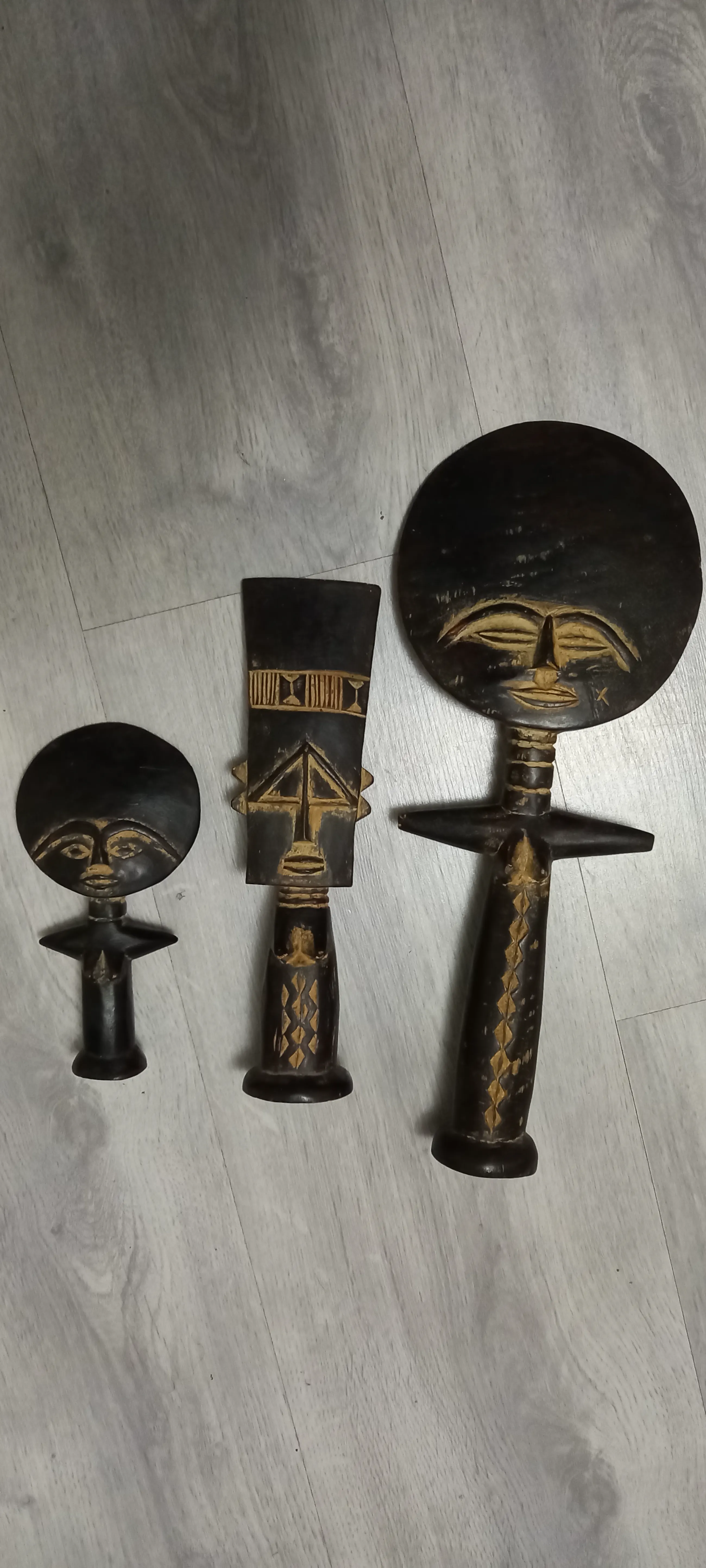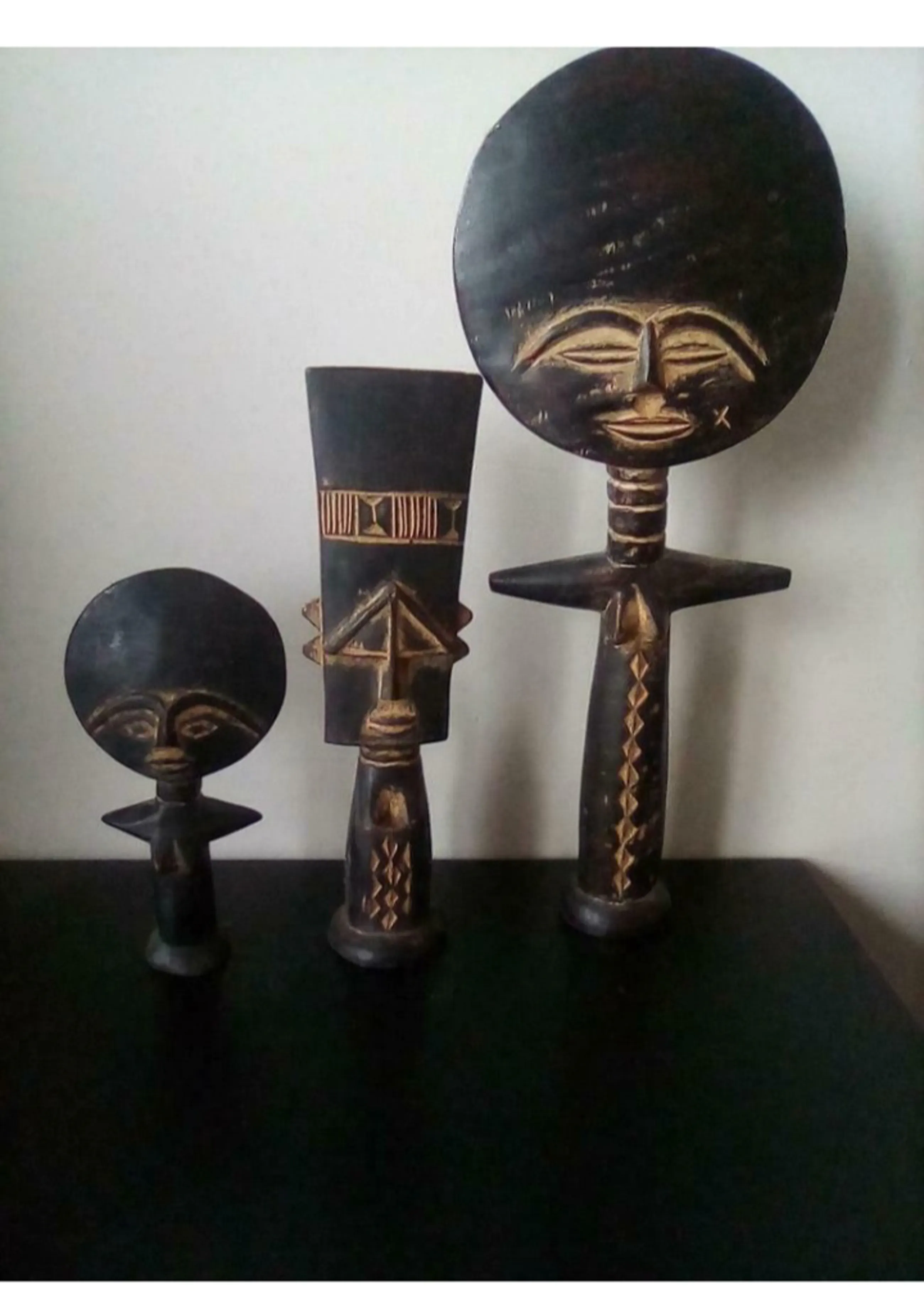3- vruchtbaarheid Ashanti popjes van origineel licht hout uit Ghana. ( +- 10 jaar oud ) . ( 33x13x4 cm , 22x4x4 cm, 15x8x3 cm )