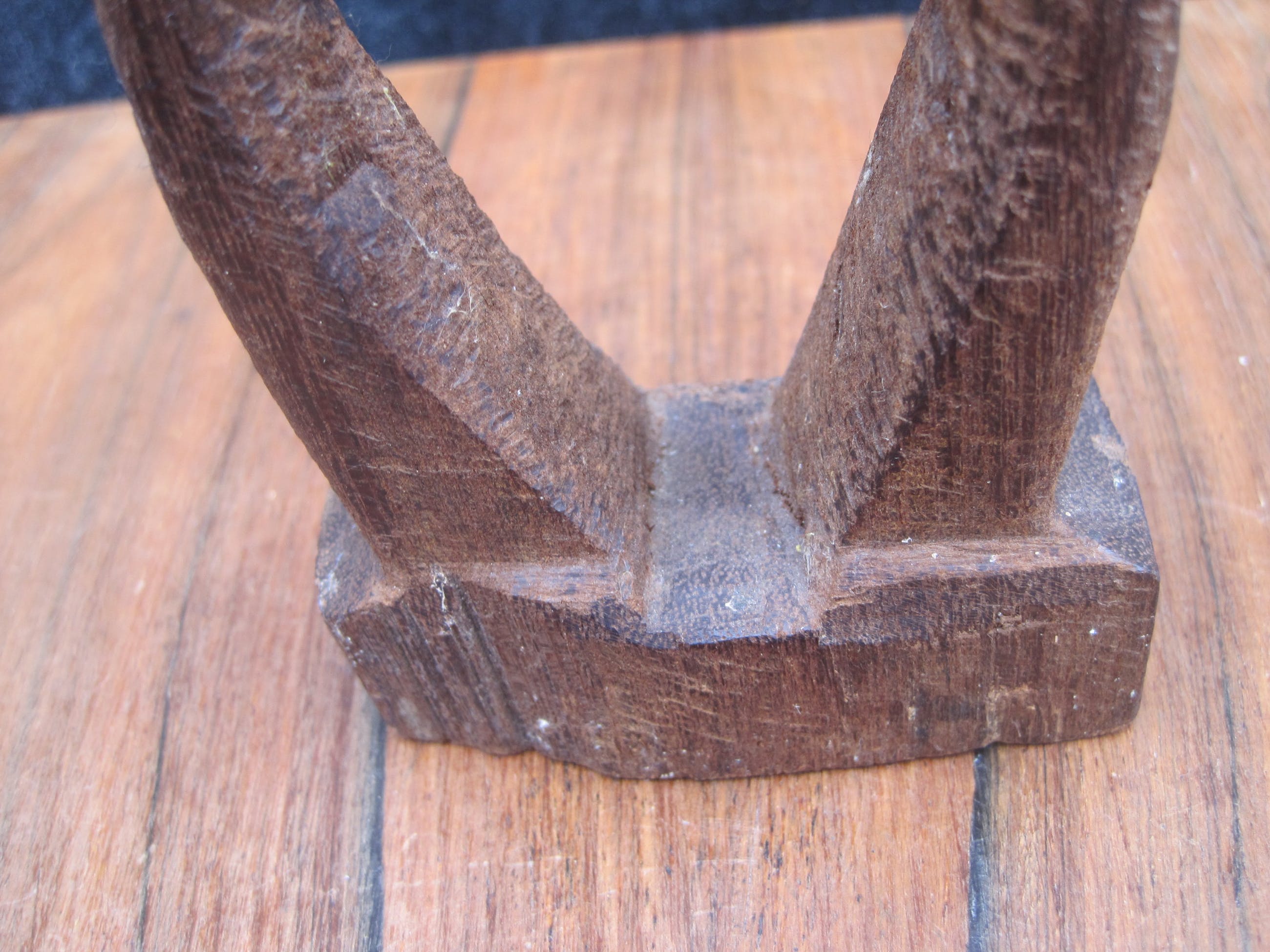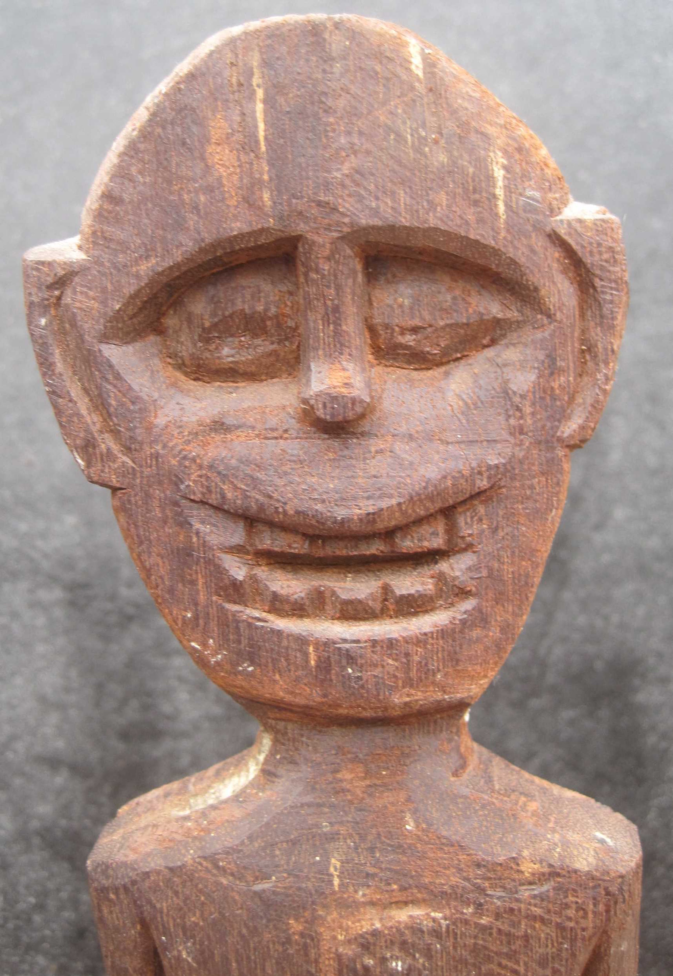 Een wat grimmig kijkend voorouder beeldje gestoken uit een zware bijzonder harde houtsoort. Dit beeldje is gemaakt door een lid van het Asmat volk. De Asmat zijn een volk uit Nieuw-Guinea. Ze overleven in het Nationaal Park Lorentz, in de Indonesische provincie Papoea. Hun aantal wordt geschat op ongeveer 70.000. Ze zijn een van de weinige volkeren die nog als traditionele jagers en verzamelaars leven, en staan bekend om hun verfijnde houtsnijwerk, en het koppensnellen dat tot in de jaren 60 van de vorige eeuw nog gebeurde.( bron Wikipedia)