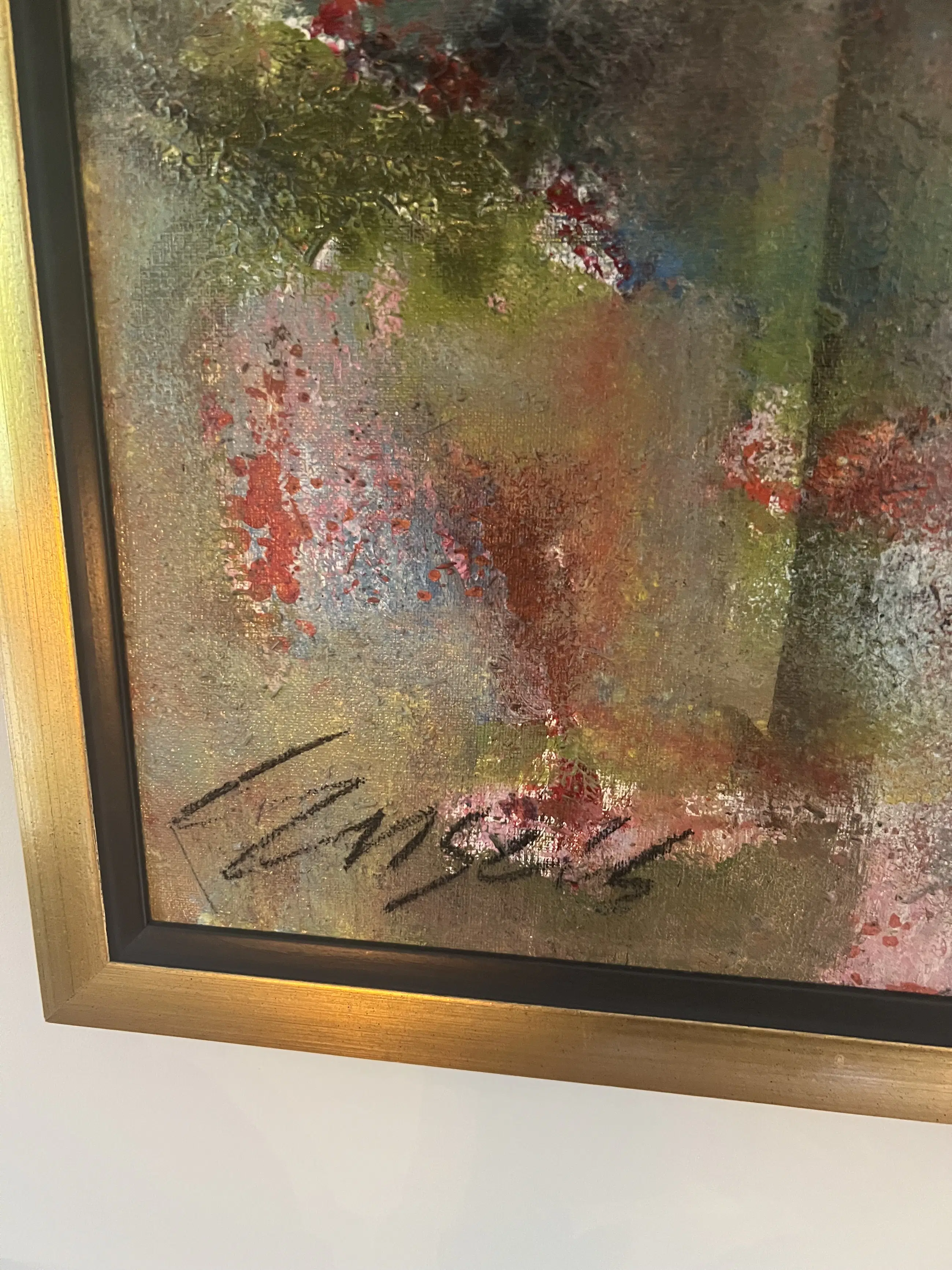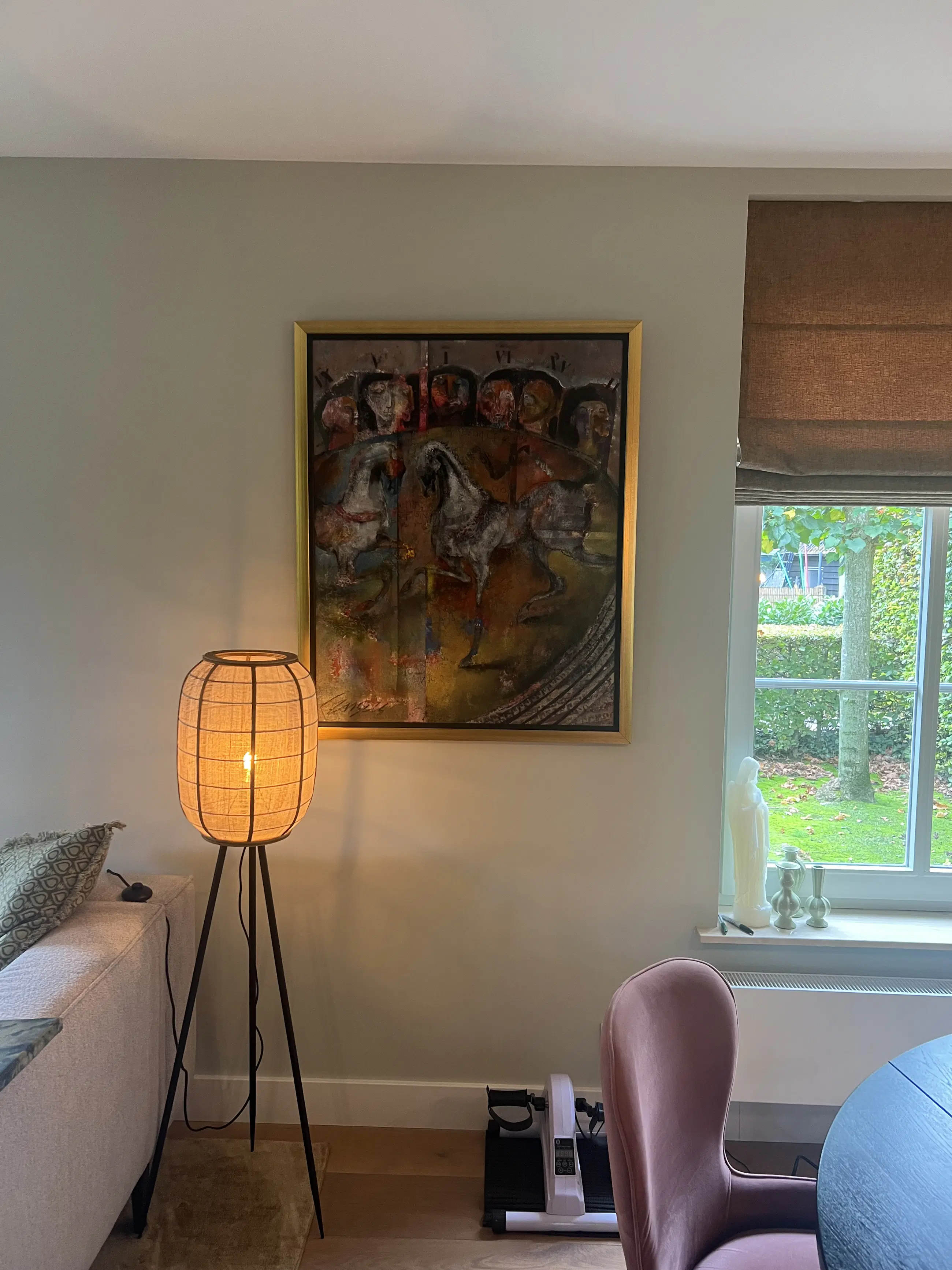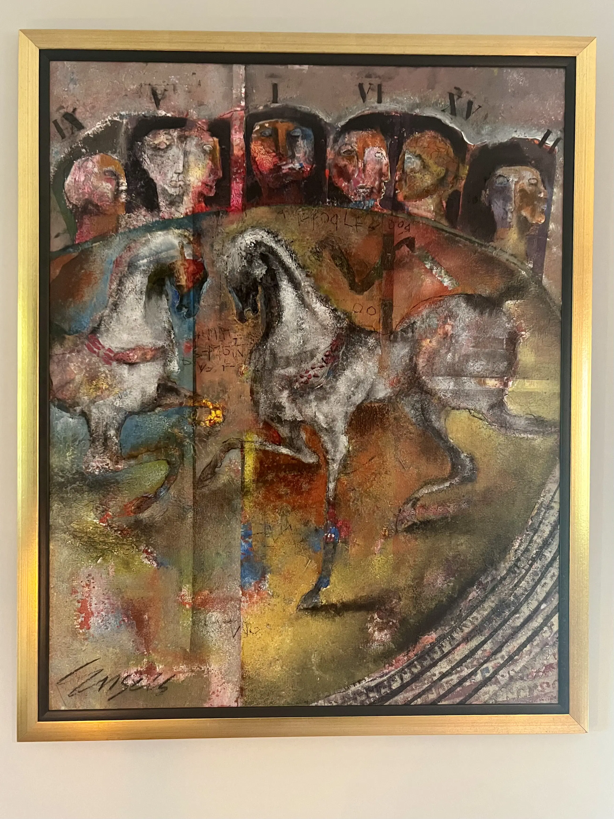 Schilderij gekocht van de kunstenares zelf in 1995. Heeft altijd bij mijn ouders gehangen, maar door verhuizing hebben ze er helaas geen ruimte meer voor. Je ziet in een circus arena met daarin paarden. Geschilderd in de herkenbare Astrid Engels stijl.