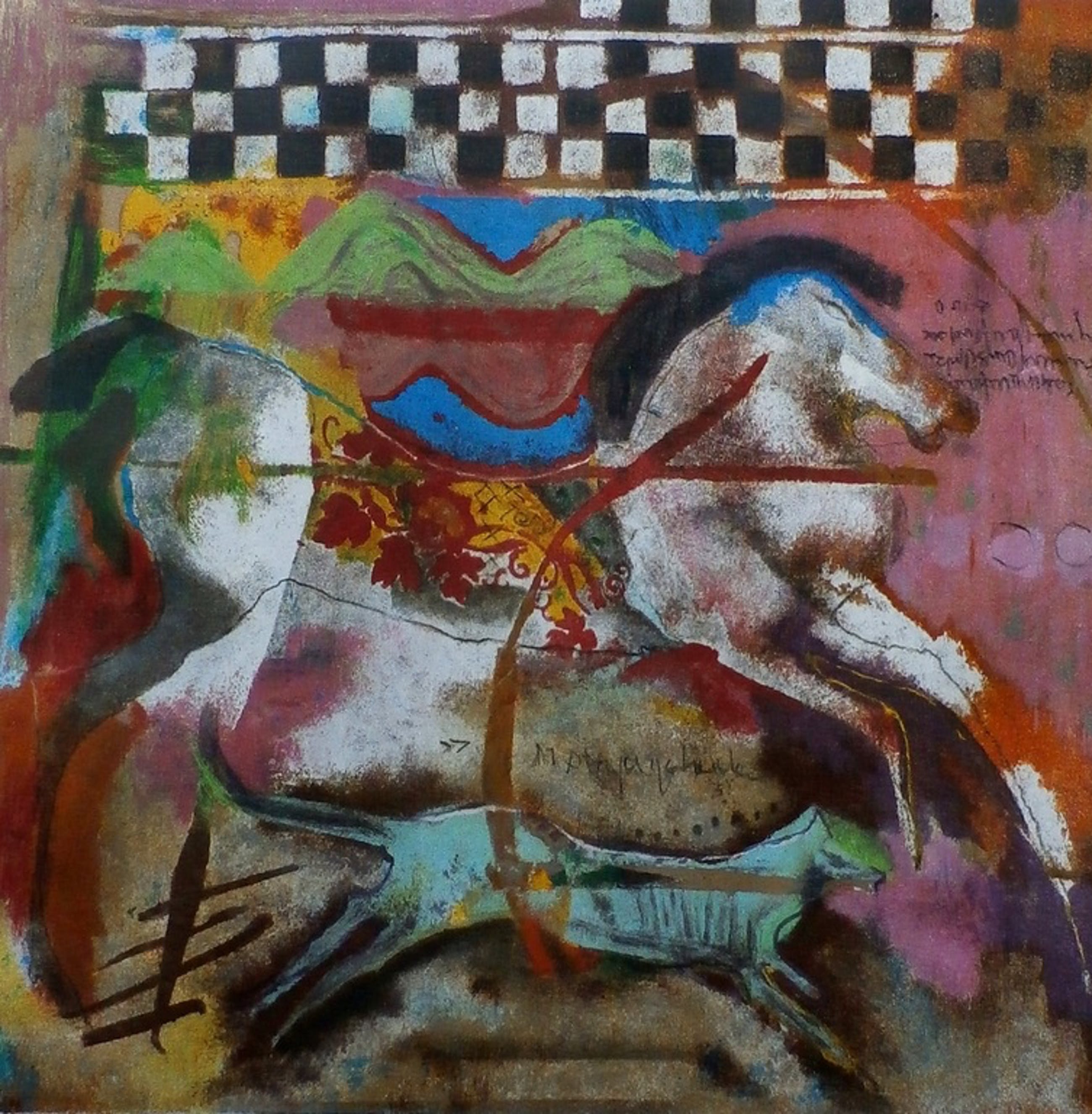 KLeurige litho van Astrid Engels met het bekende thema: Paarden. De litho is rechtsonder, met potlood, gesigneerd door de kunstenaar. Afmetingen incl. passe-partout:h80 x b65 cm. Afmetingen werk: h48 x b46 cm