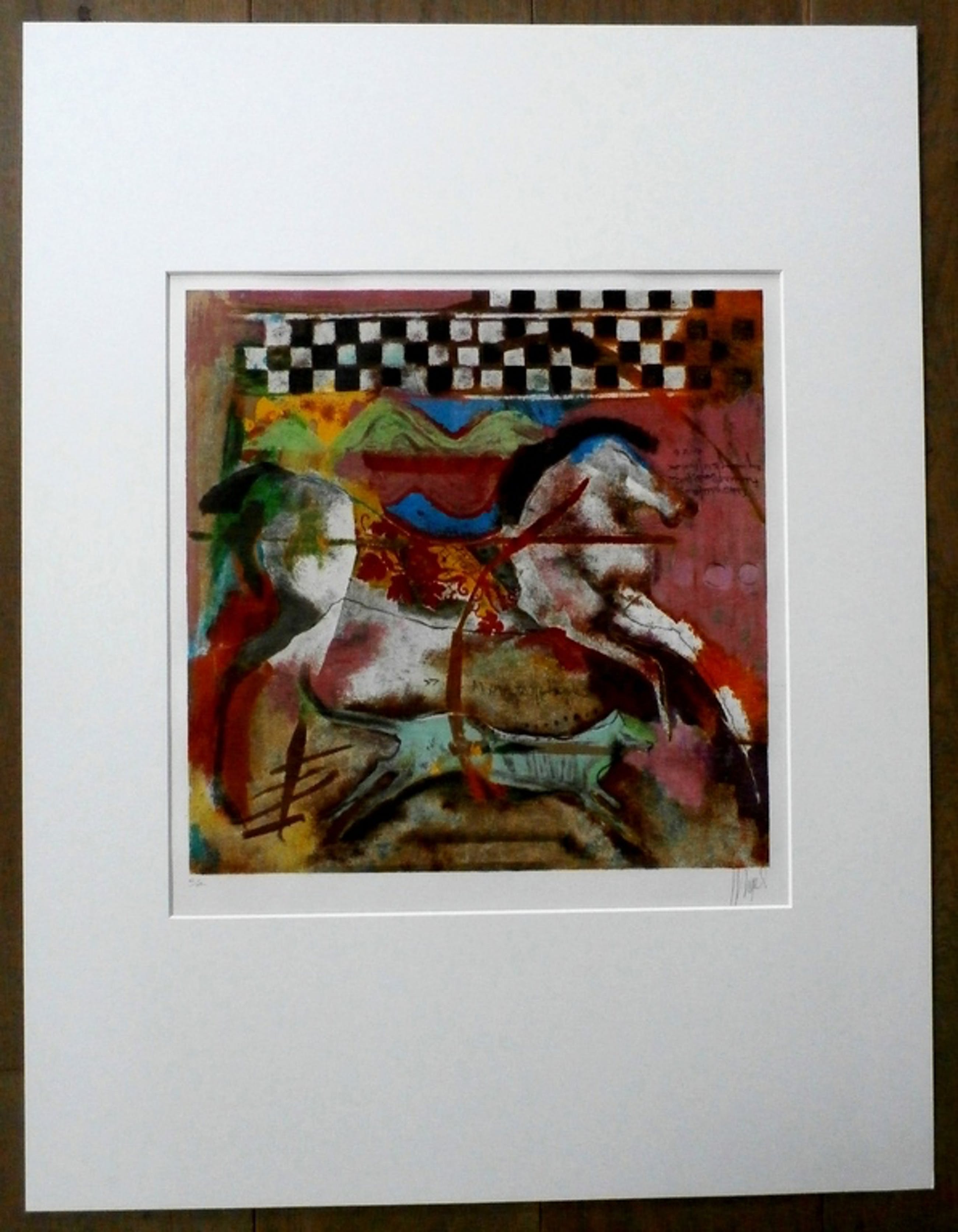 Kleurige litho van Astrid Engels met het bekende thema: Paarden. Nummer: E.A. Titel: Cavalle e Cane. De litho is rechtsonder, met potlood, gesigneerd door de kunstenaar. Afmetingen incl. passe-partout:h80 x b65 cm. Afmetingen werk: h48 x b46 cm. De authenciteit van deze werken wordt volledig gegarandeerd. Een certificaat van echtheid kan, op aanvraag, worden meegeleverd.
