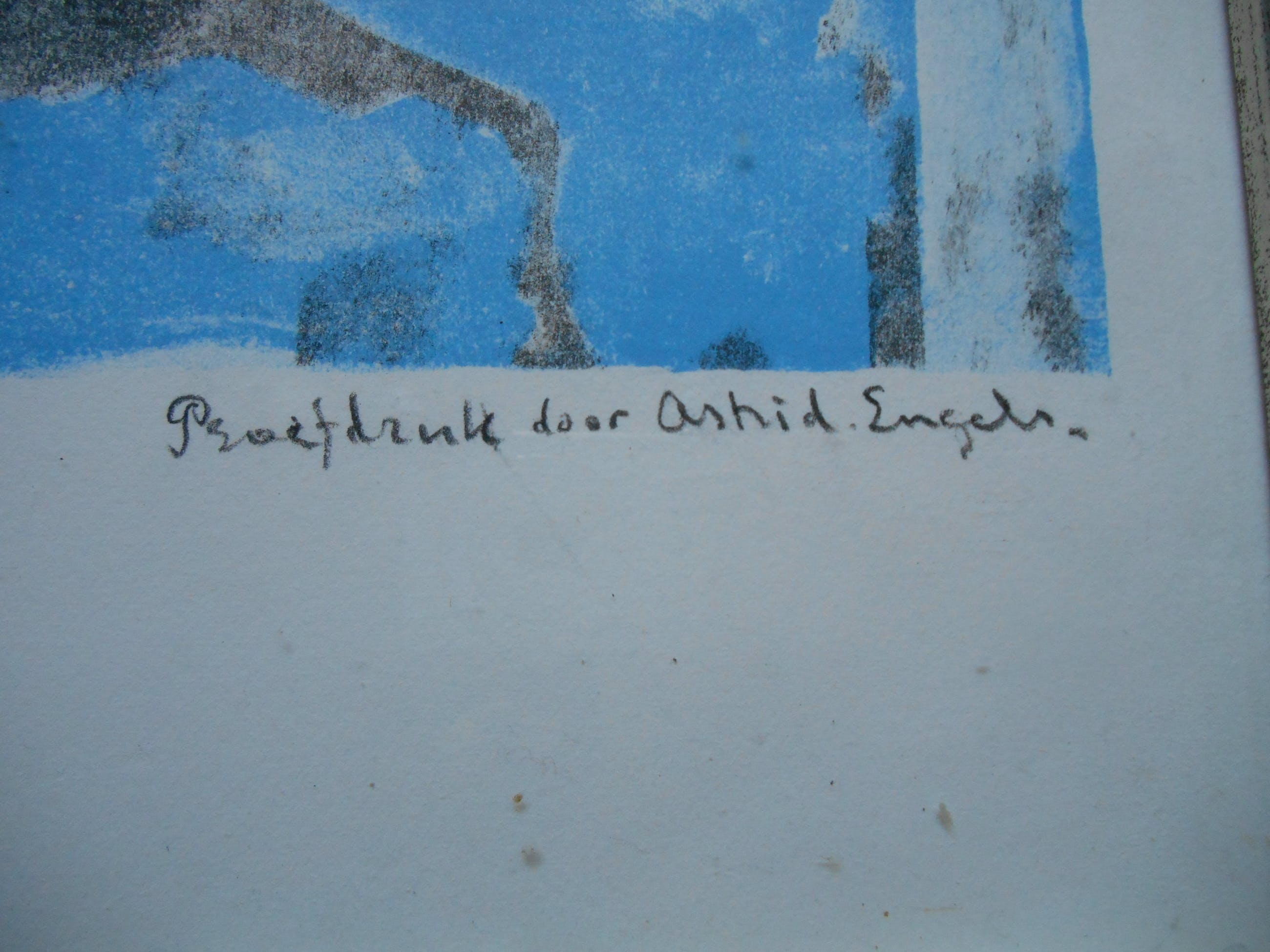 Astrid Engels ( 1941 ) is een autodidact.In 1965 presenteerde zij op televisie het muziekprogramma Fanclub.Bekend is haar liefde voor oude culturen. In de loop der jaren ontwikkelde ze een geheel eigen stijl.Vanaf 2000 heeft Astrid Engels een studio in Huizen. Op deze litho zien we 3 paarden op een achtergrond van blauw en wit. Onmiskenbaar staat deze proefdruk aan de basis van haar serie ( 125 stuks ) Horses and flowers. Zie haar website.